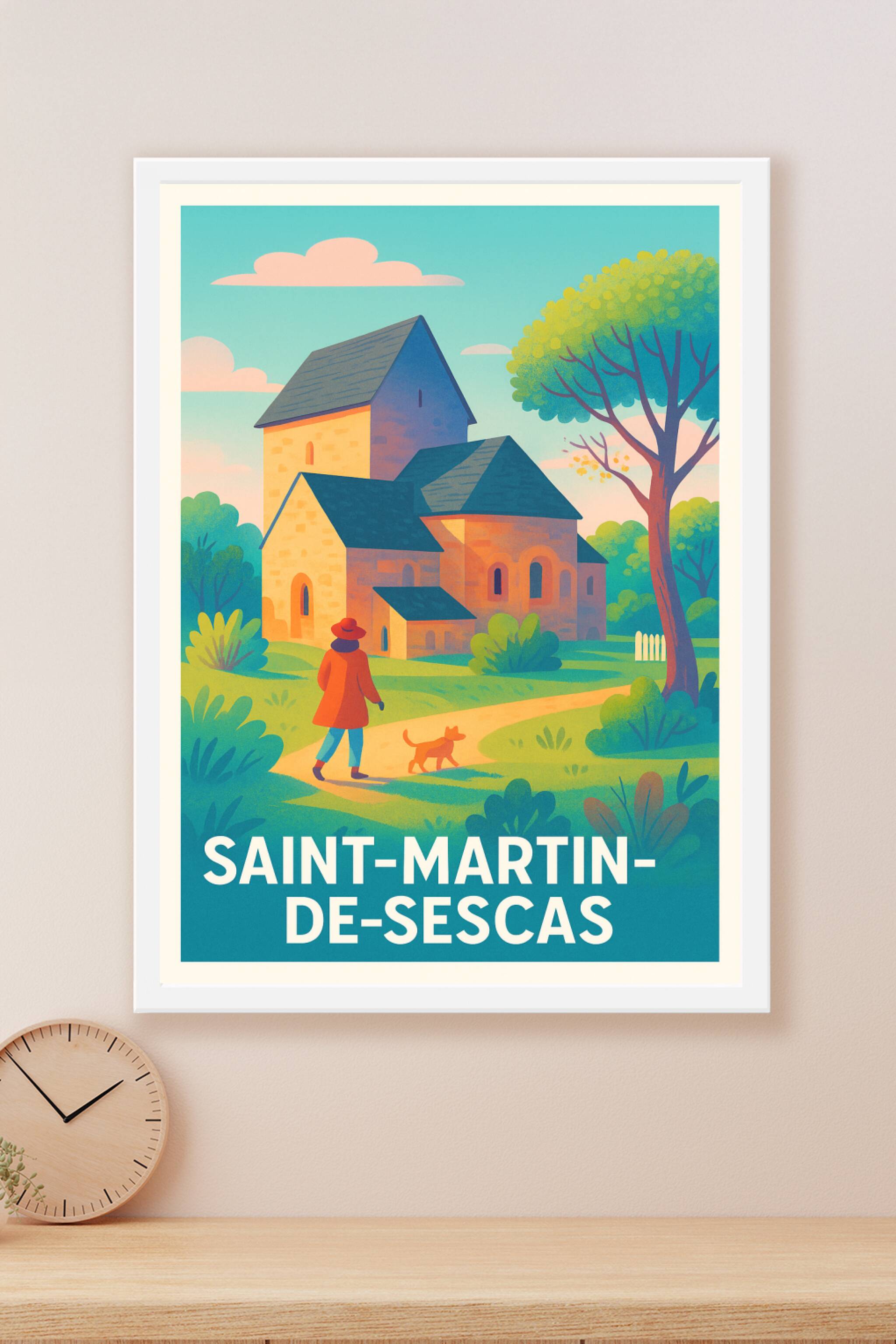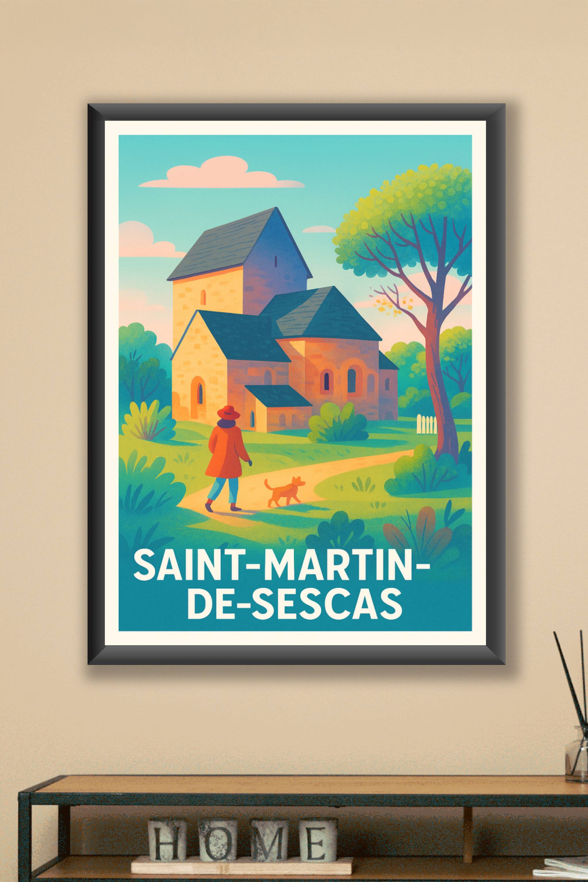 Embarquez pour une escapade paisible avec cette affiche illustrant une balade tranquille à Saint-Martin-de-Sescas, charmant village bordelais entouré de verdure. Ce poster met en valeur l'architecture typique et la douceur de vivre de cette région viticole grâce à des couleurs douces et un style vintage. Disponible en tirage Fine Art sur papier coton 305g, cette affiche vous garantit une qualité d'impression premium avec des détails nets et des nuances profondes. Choisissez votre format parmi A1, A2, A3 et A4, avec ou sans cadre, pour sublimer votre intérieur ou offrir un cadeau délicat et raffiné aux amateurs de paysages français.