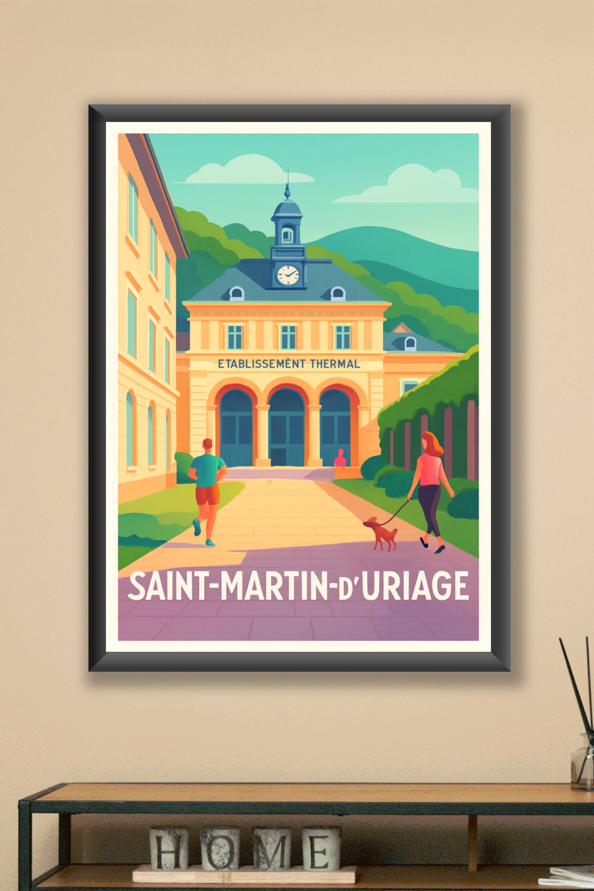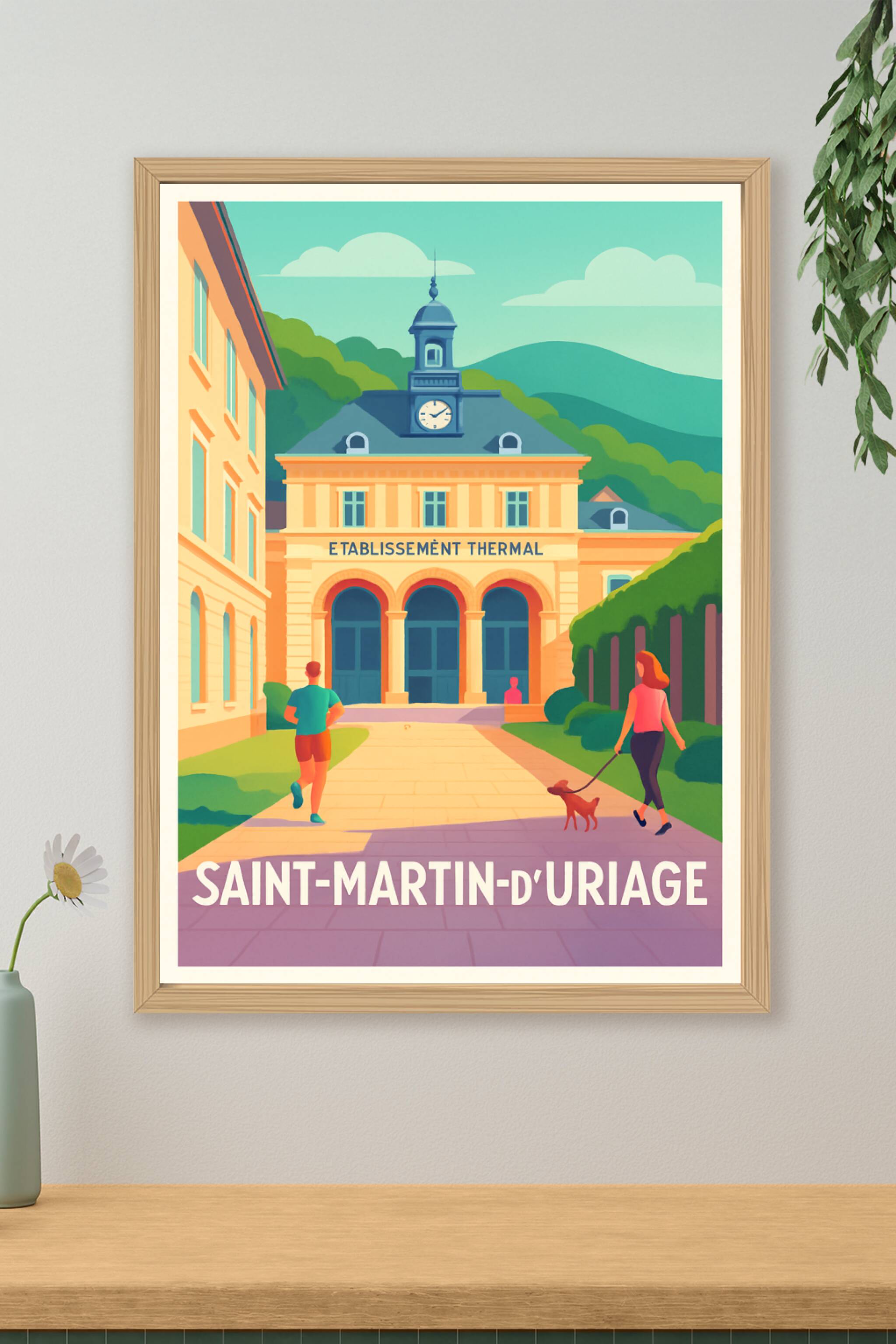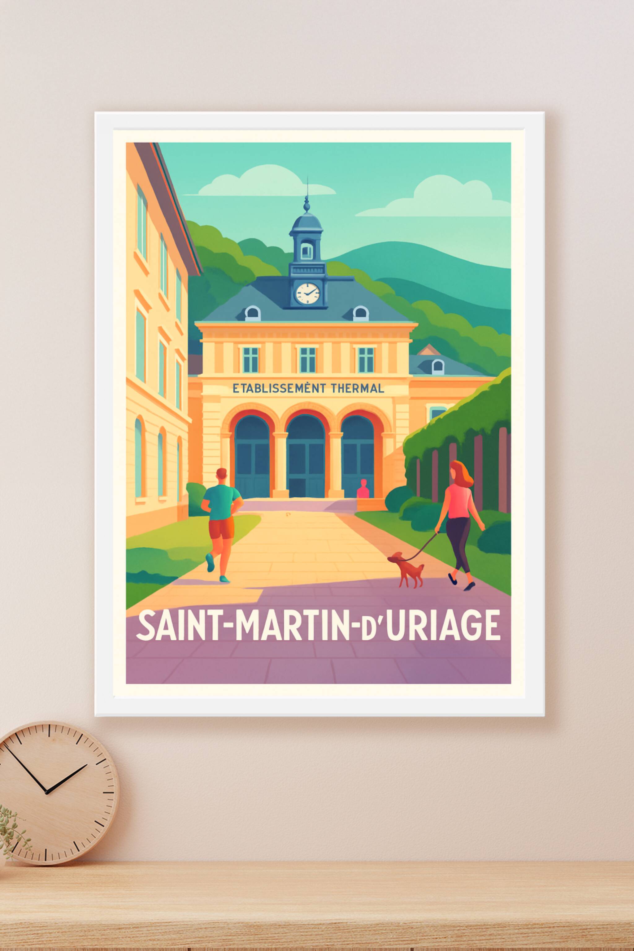 Découvrez le charme authentique de Saint-Martin-d'Uriage avec cette affiche vintage illustrant l'établissement thermal emblématique de la ville, ni...