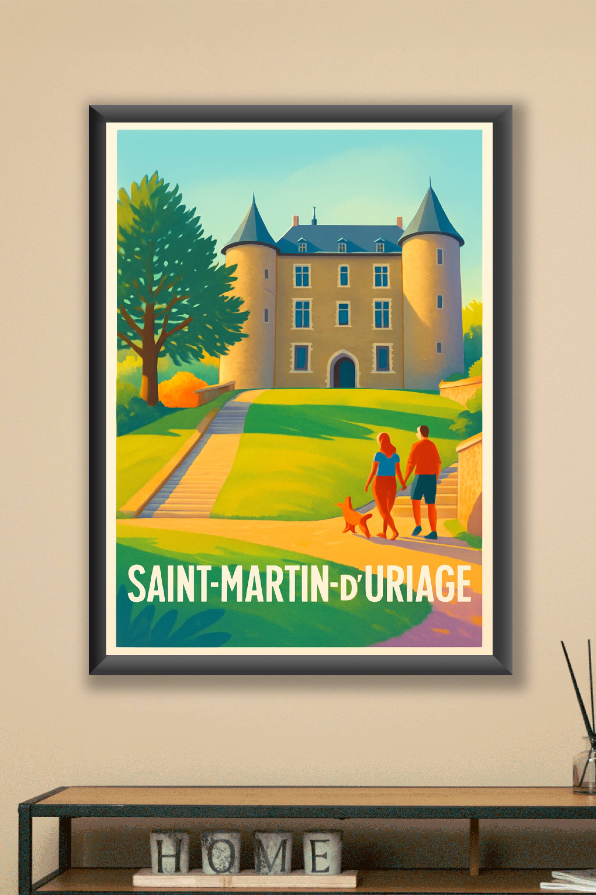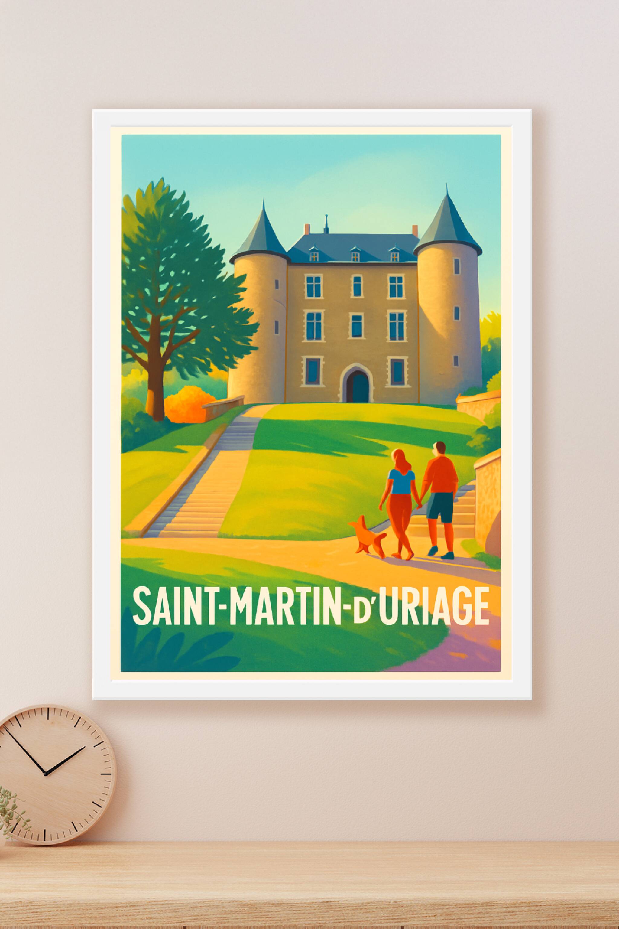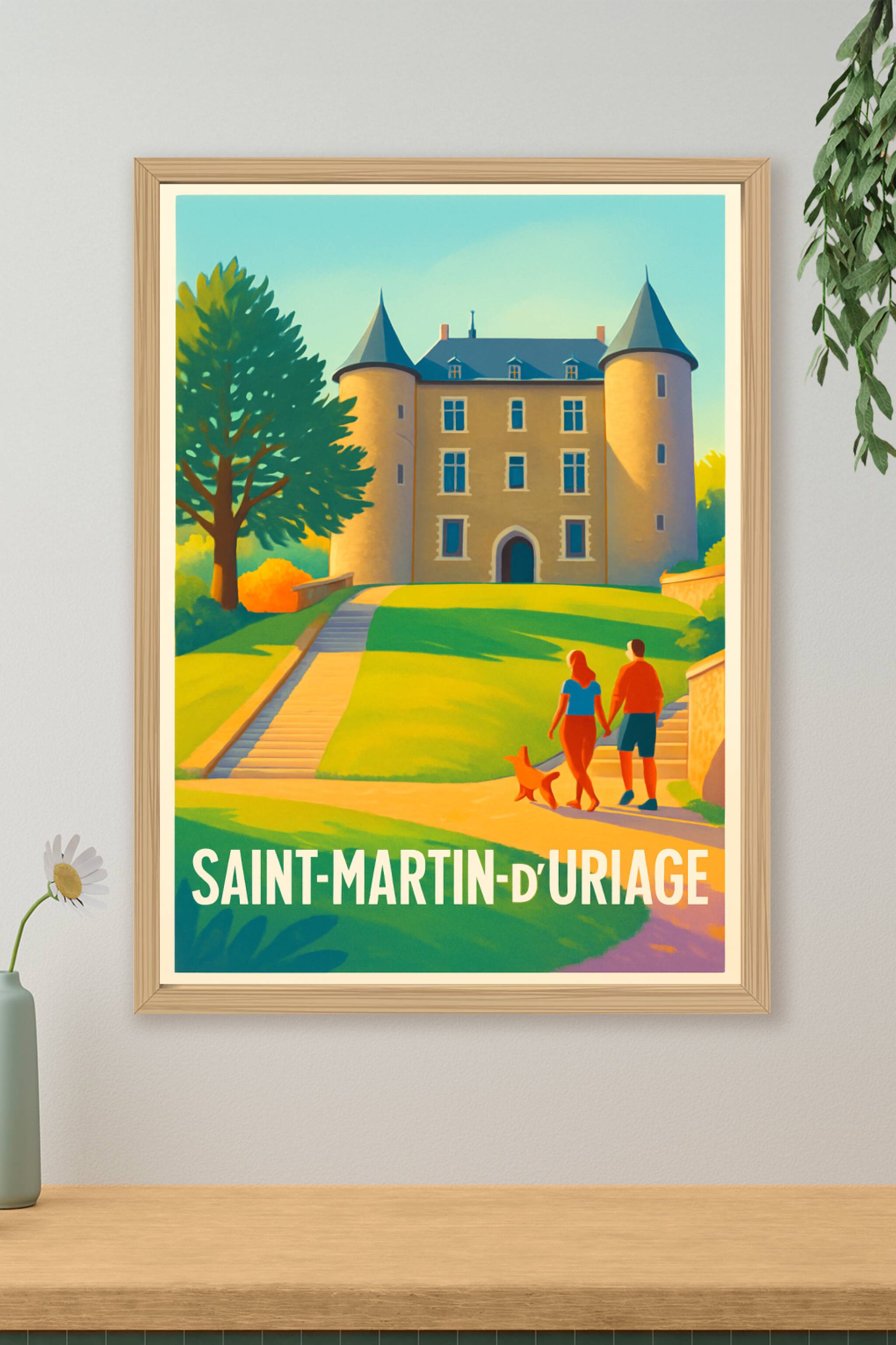Découvrez l'élégance et la tranquillité de Saint-Martin-d'Uriage avec cette affiche illustrée, représentant un couple et leur chien marchant vers l...