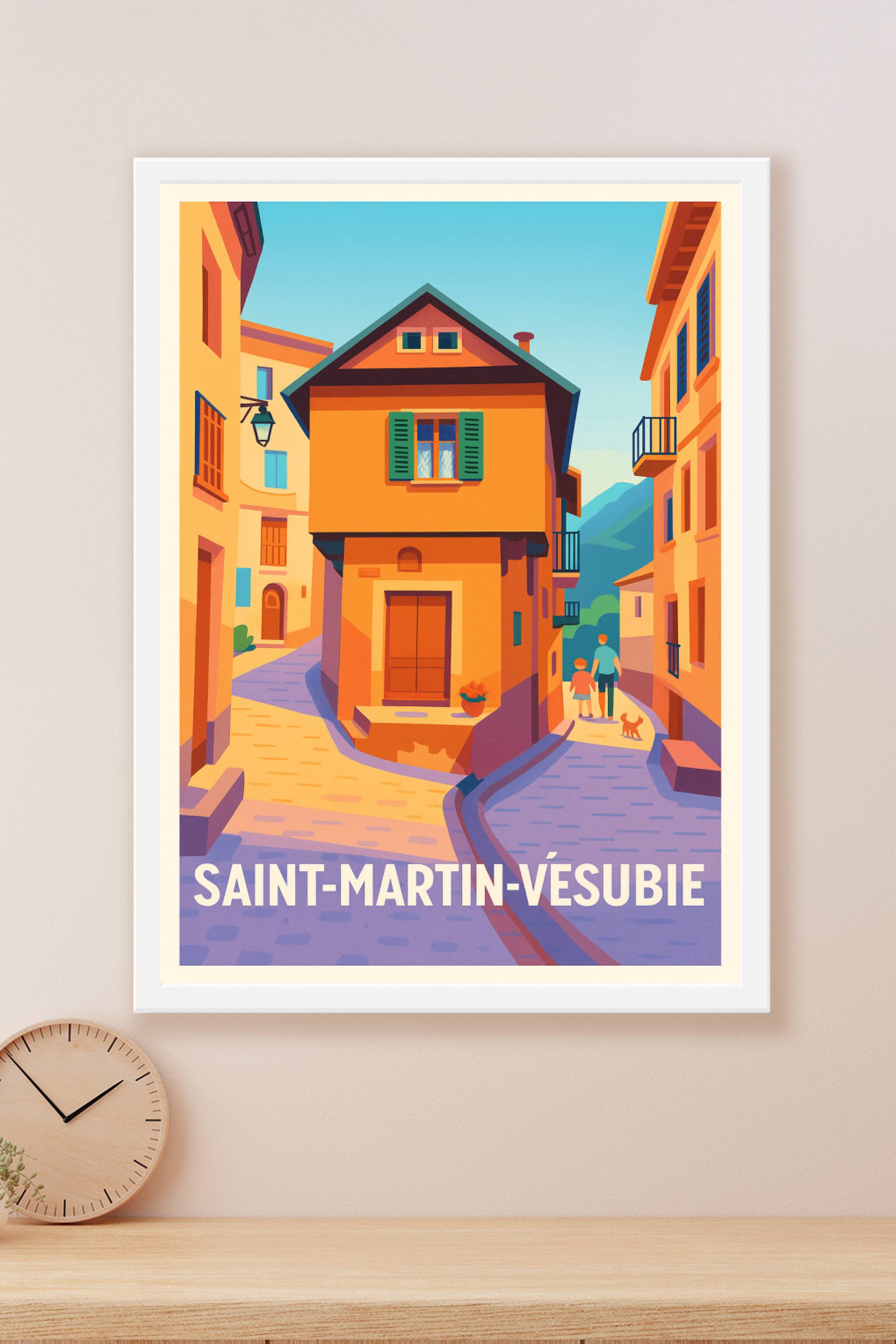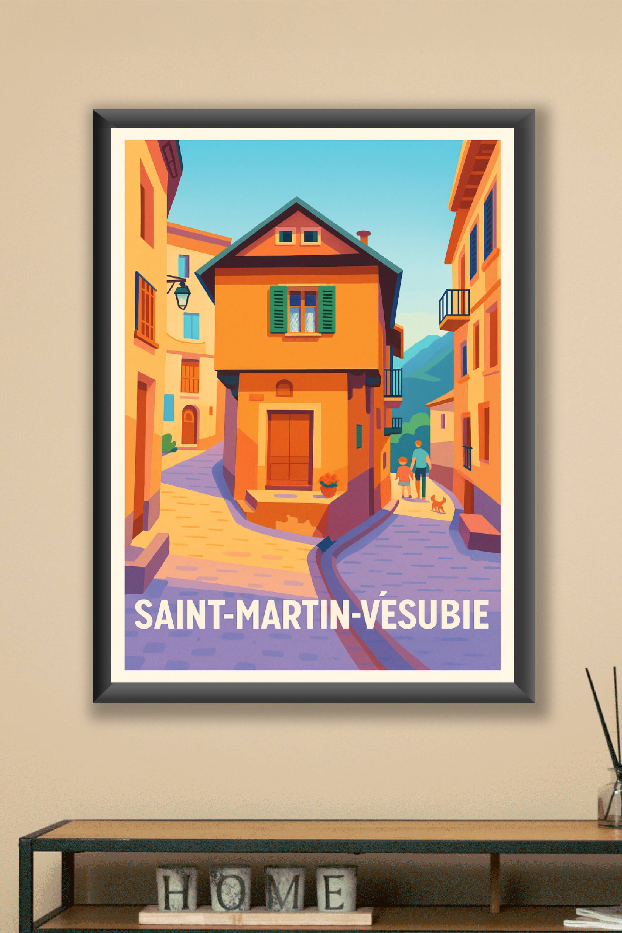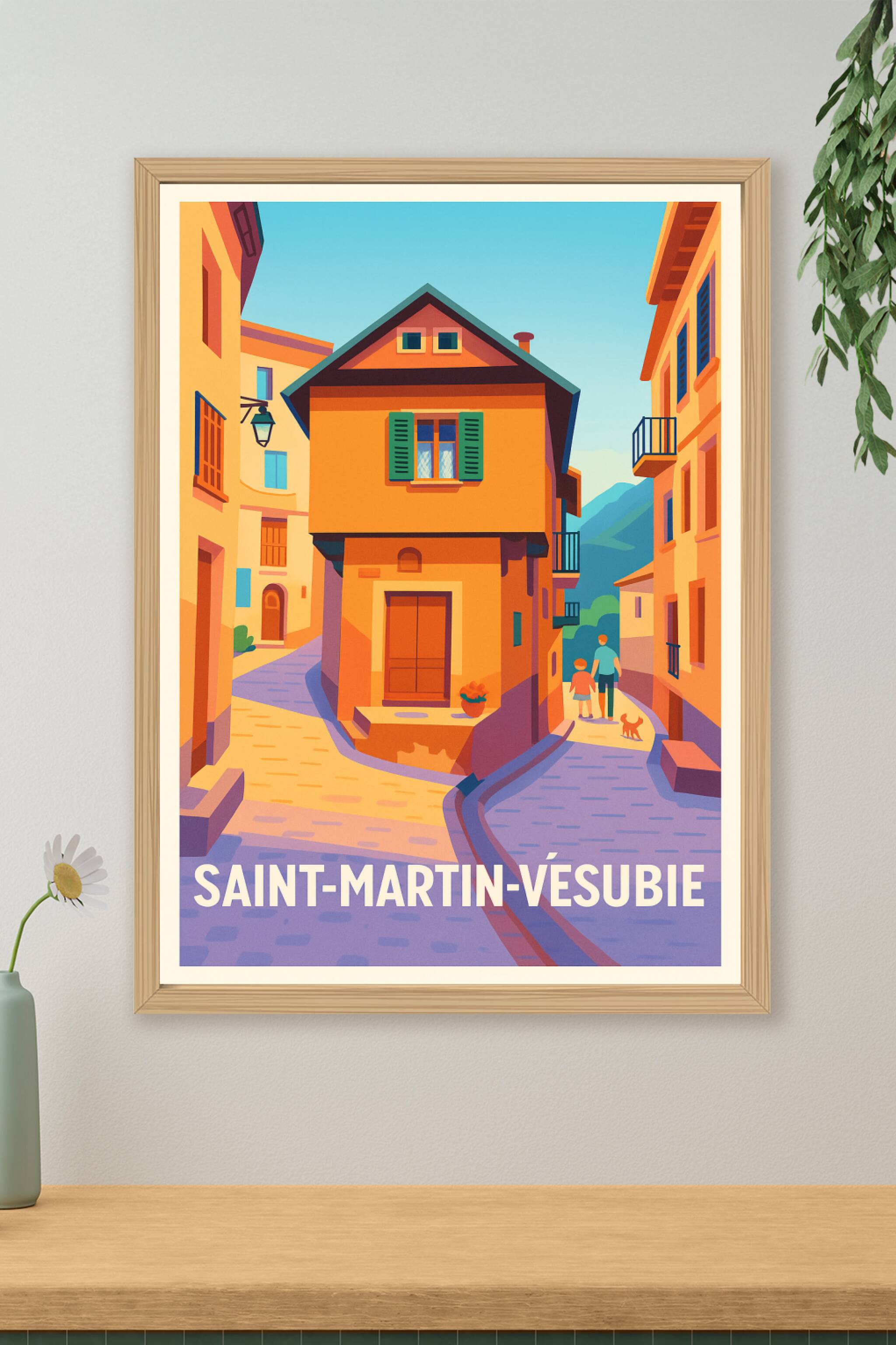 Découvrez l'atmosphère chaleureuse et colorée de Saint-Martin-Vésubie avec cette affiche illustrée qui retranscrit à la perfection le charme des ru...