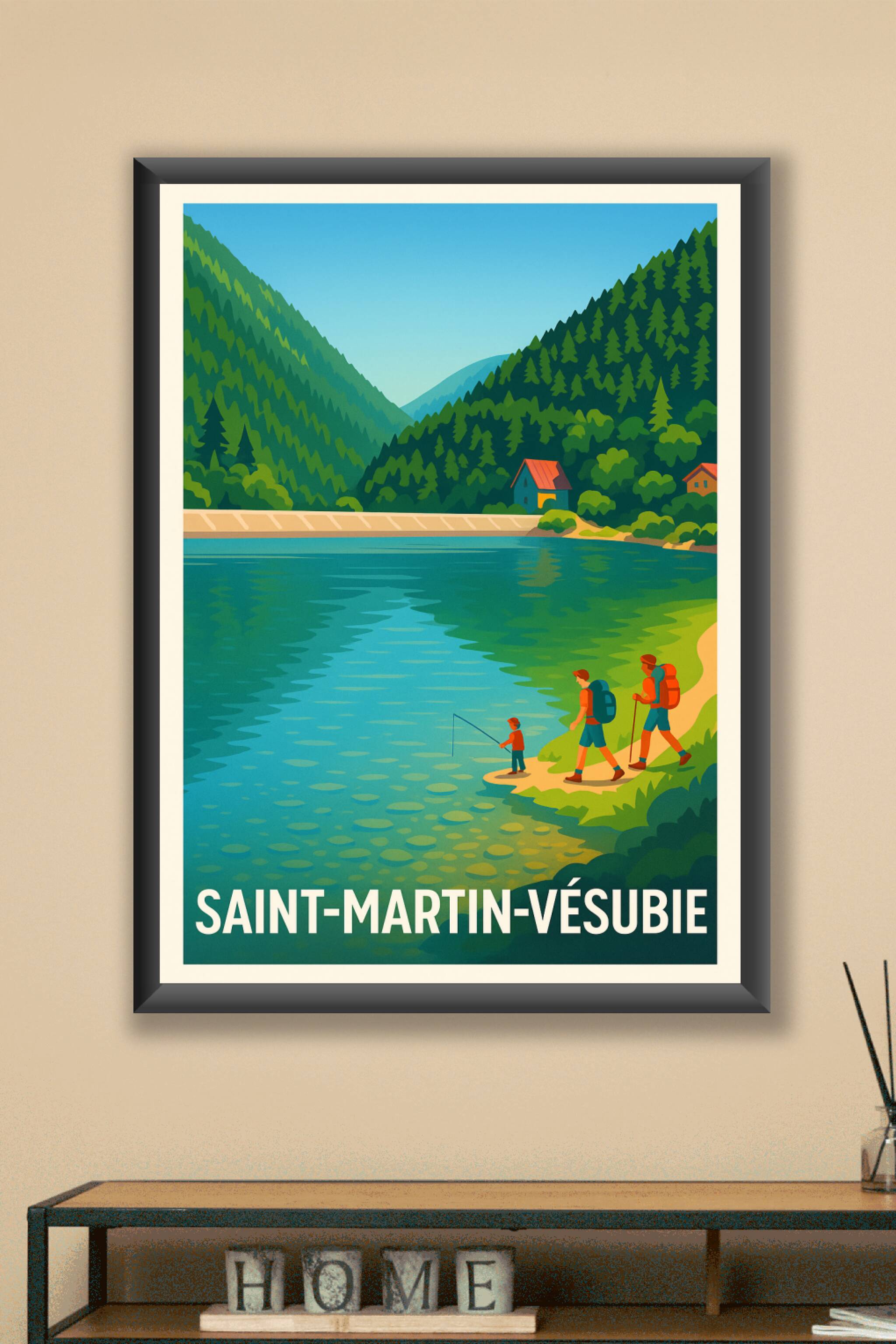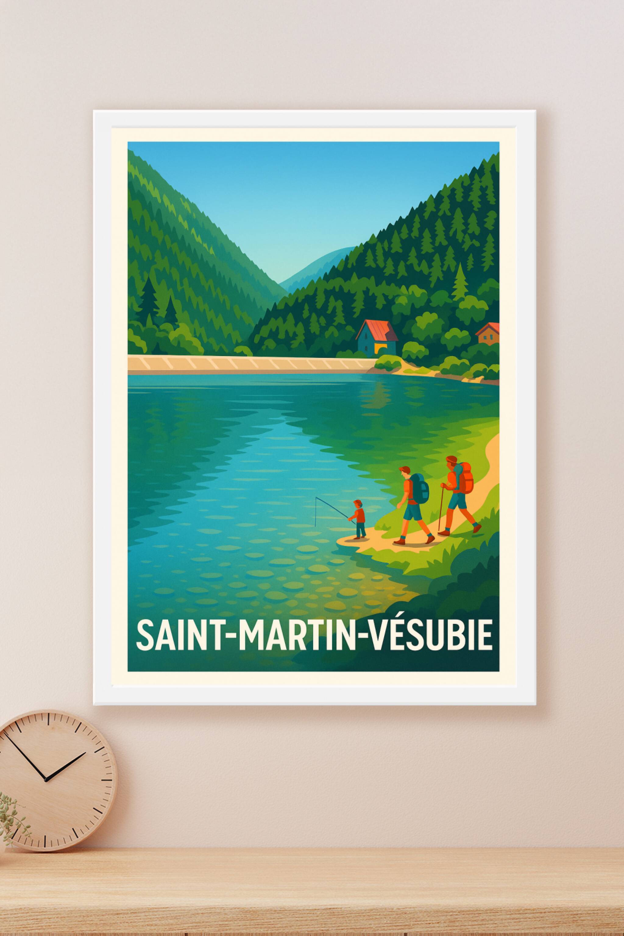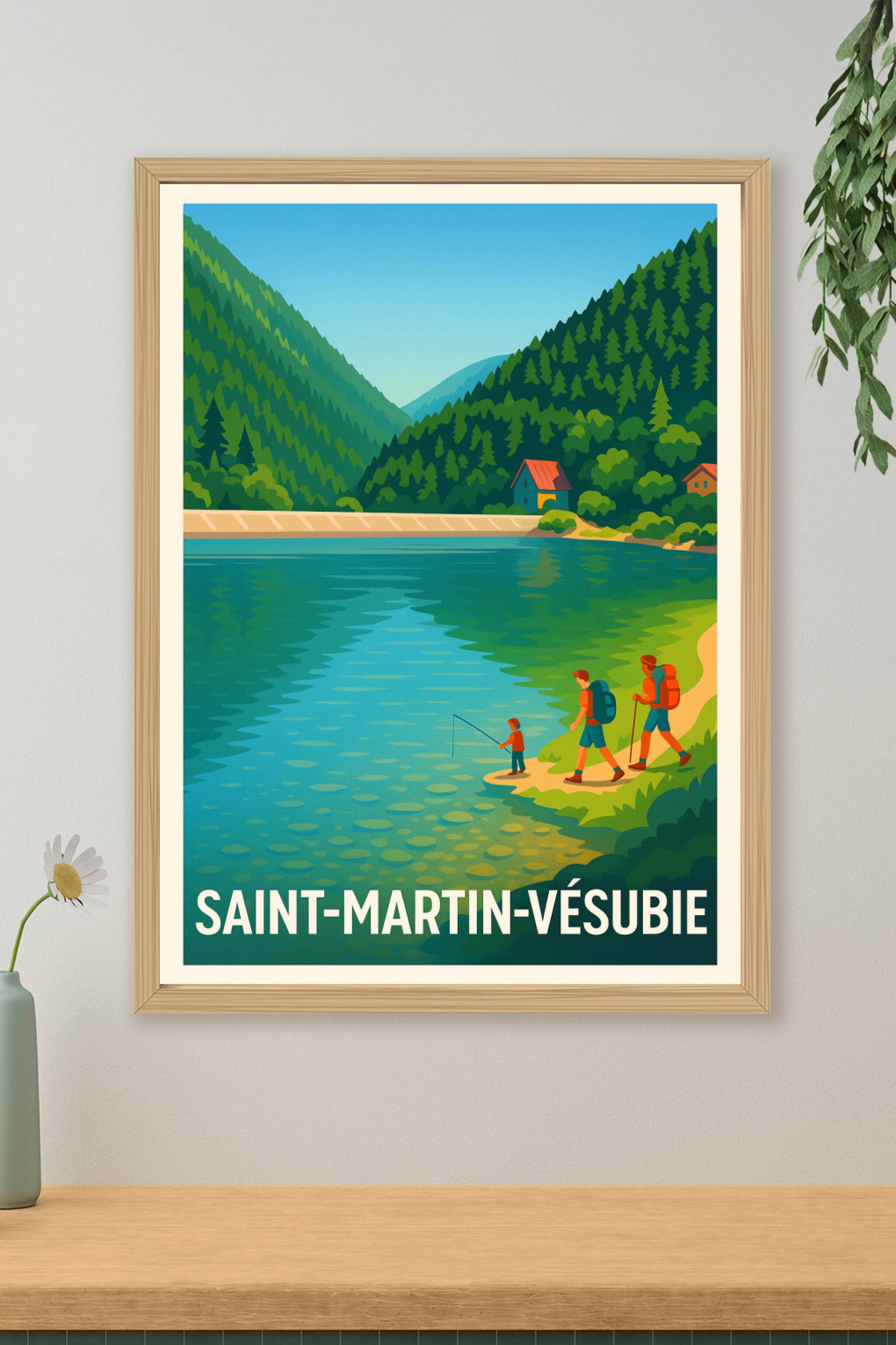 Découvrez l'atmosphère paisible et revitalisante de Saint-Martin-Vésubie avec cette affiche illustrée mettant en scène une scène de pêche au bord d...