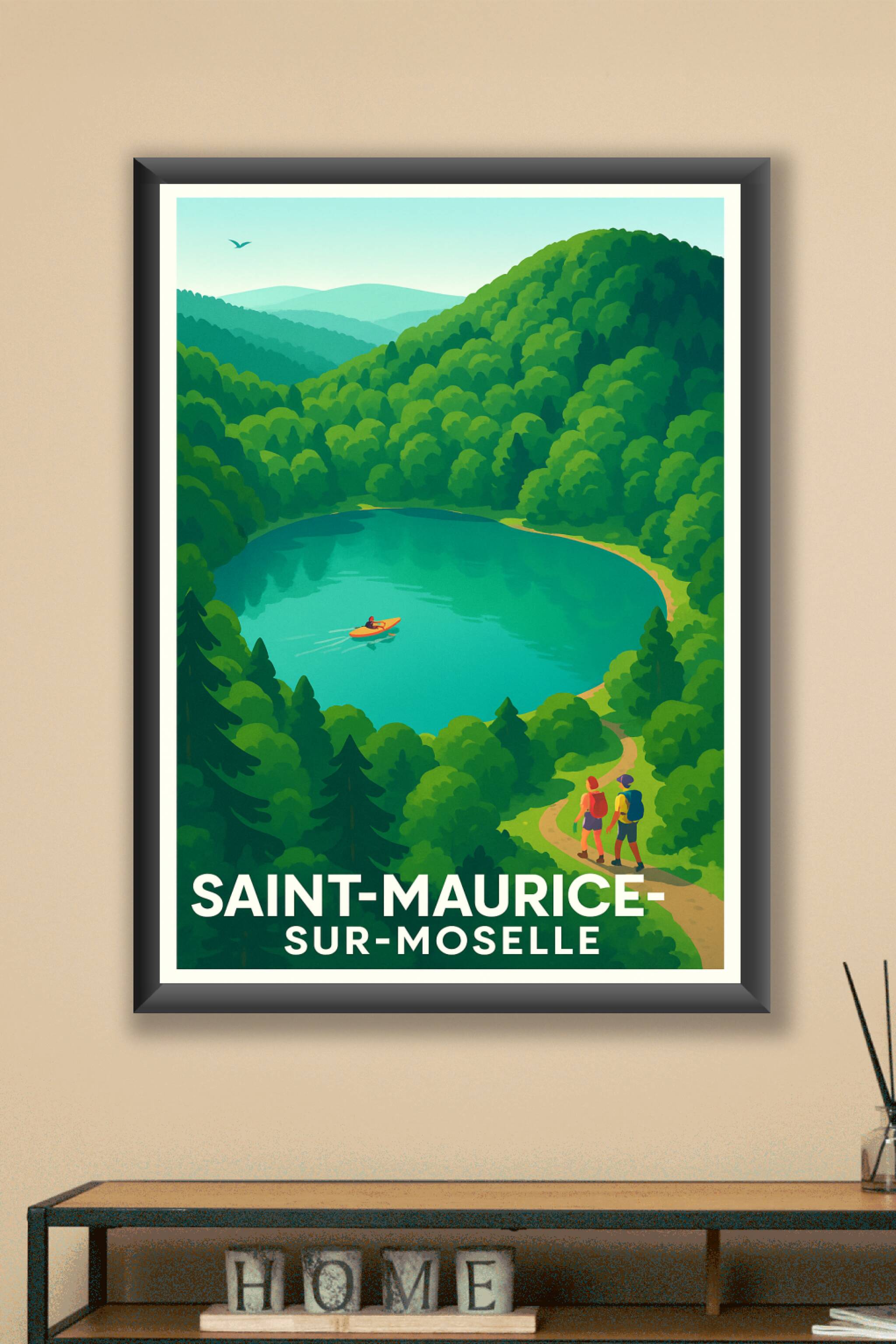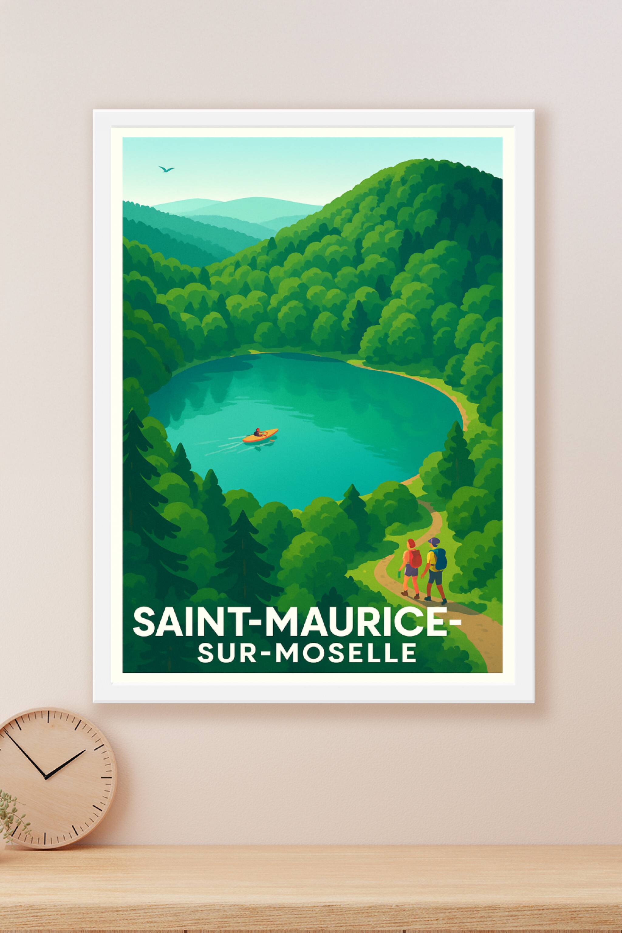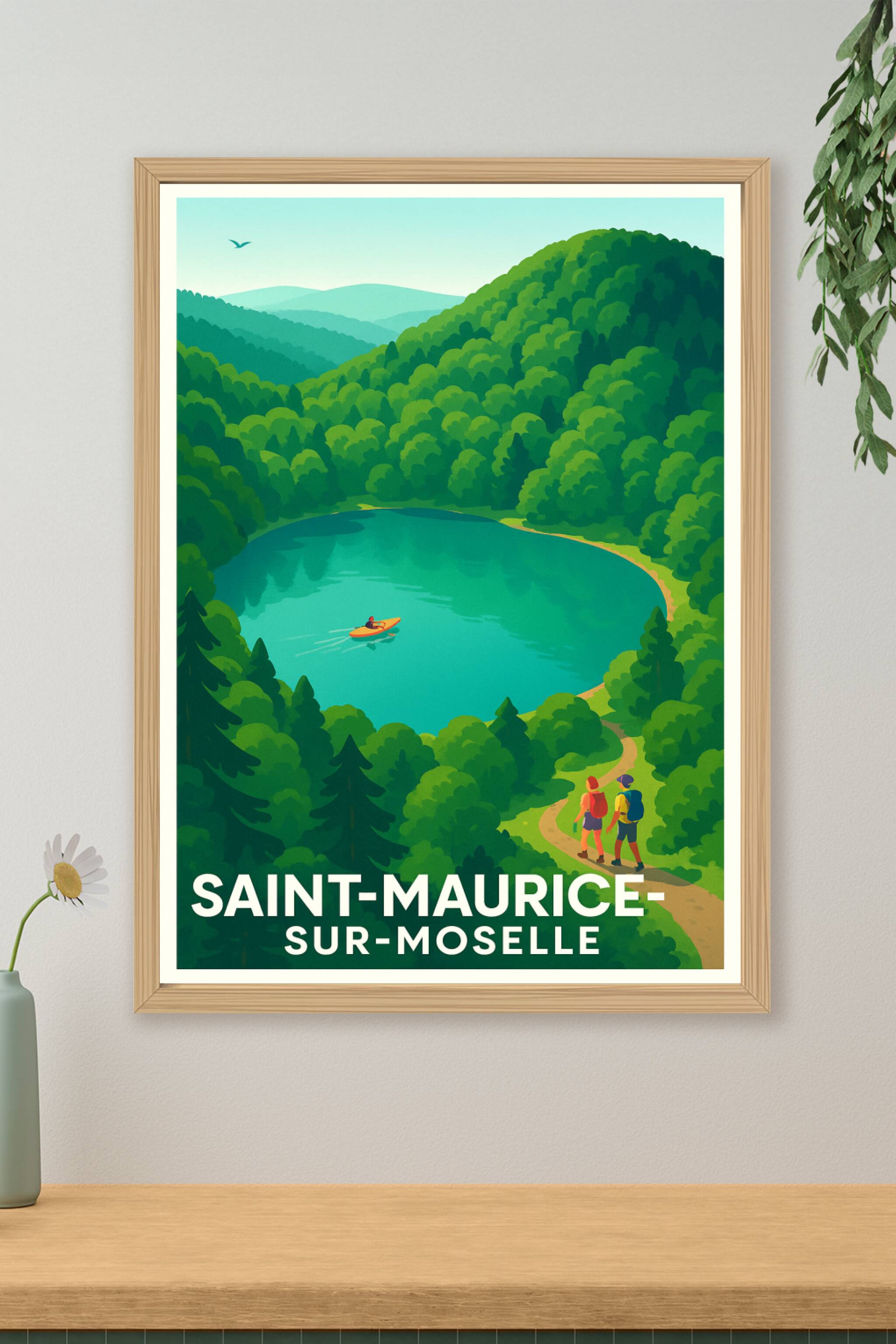 Découvrez la beauté sauvage et apaisante de Saint-Maurice-sur-Moselle grâce à cette affiche illustrée où une balade en forêt longe un lac turquoise...