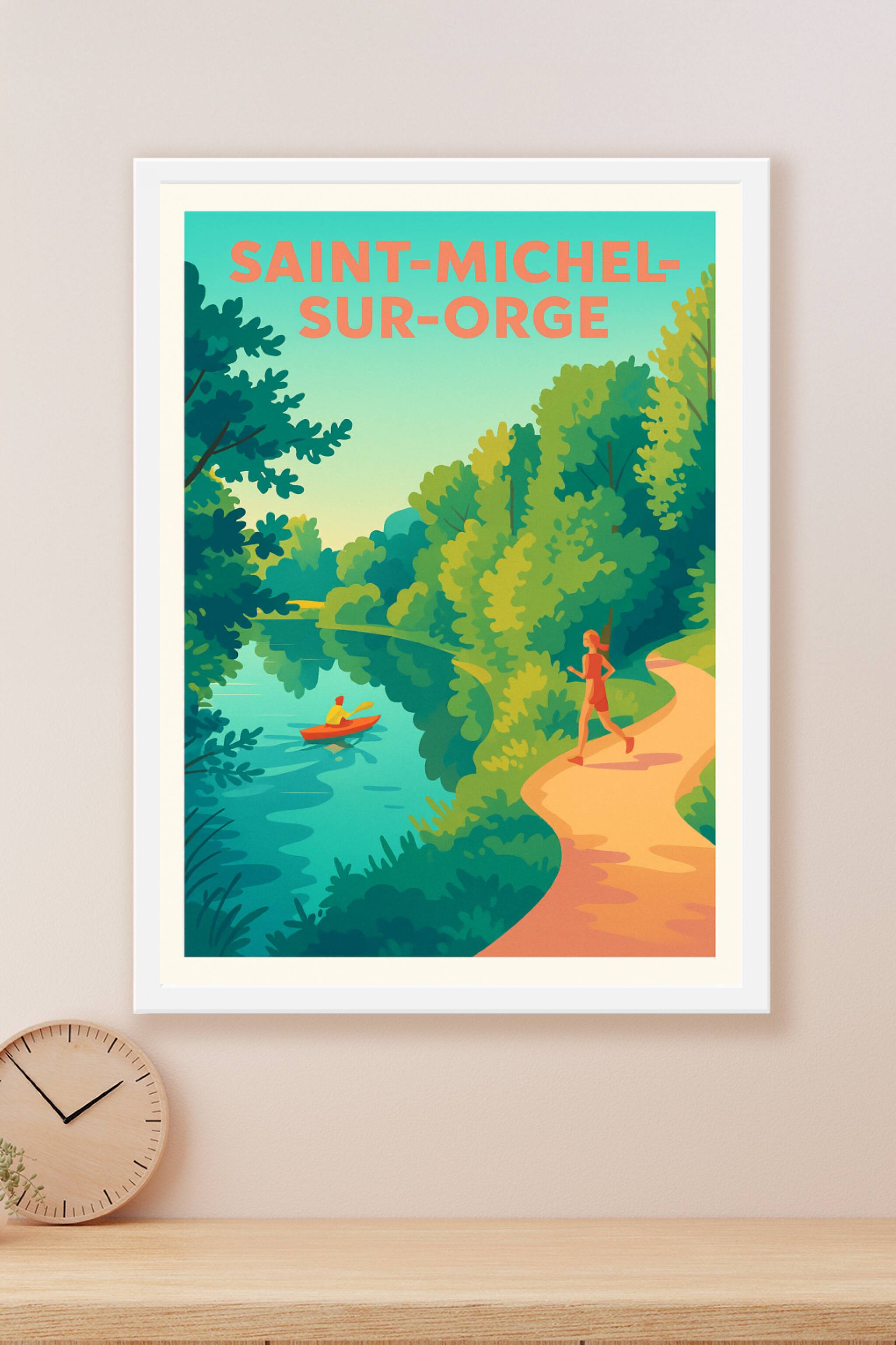 Découvrez la sérénité de Saint-Michel-sur-Orge avec cette superbe affiche illustrée mettant en scène un paysage naturel paisible où randonneur et k...