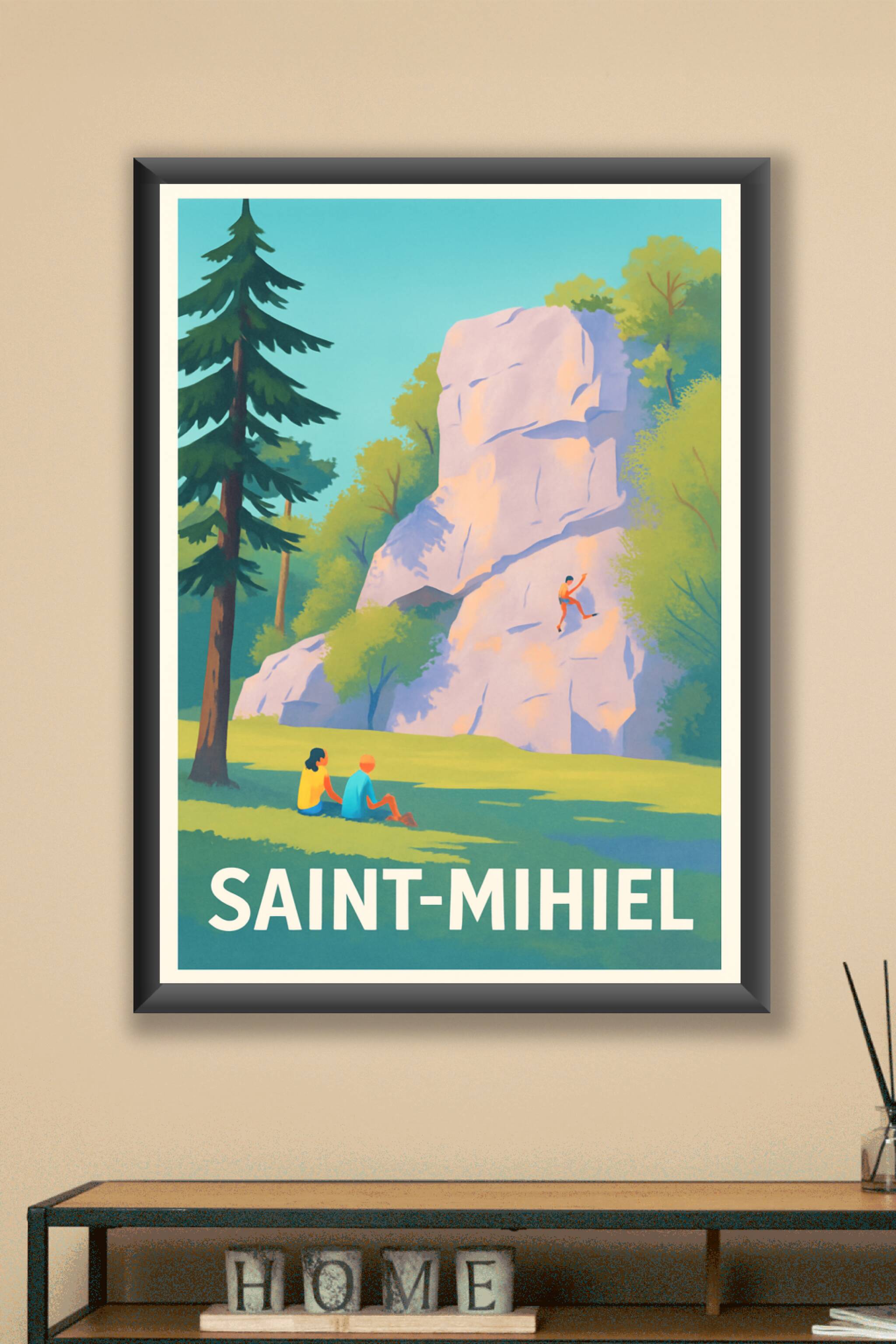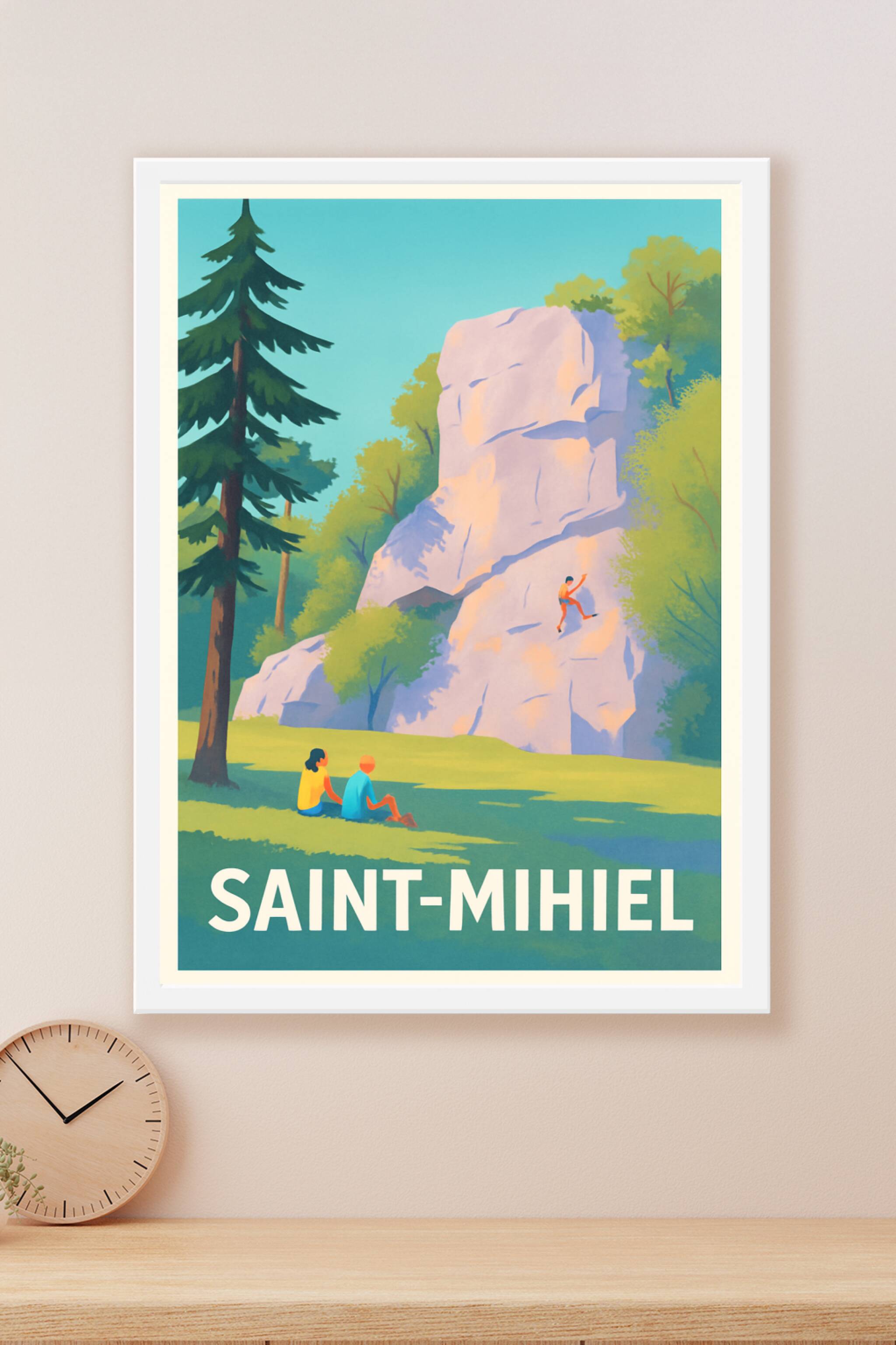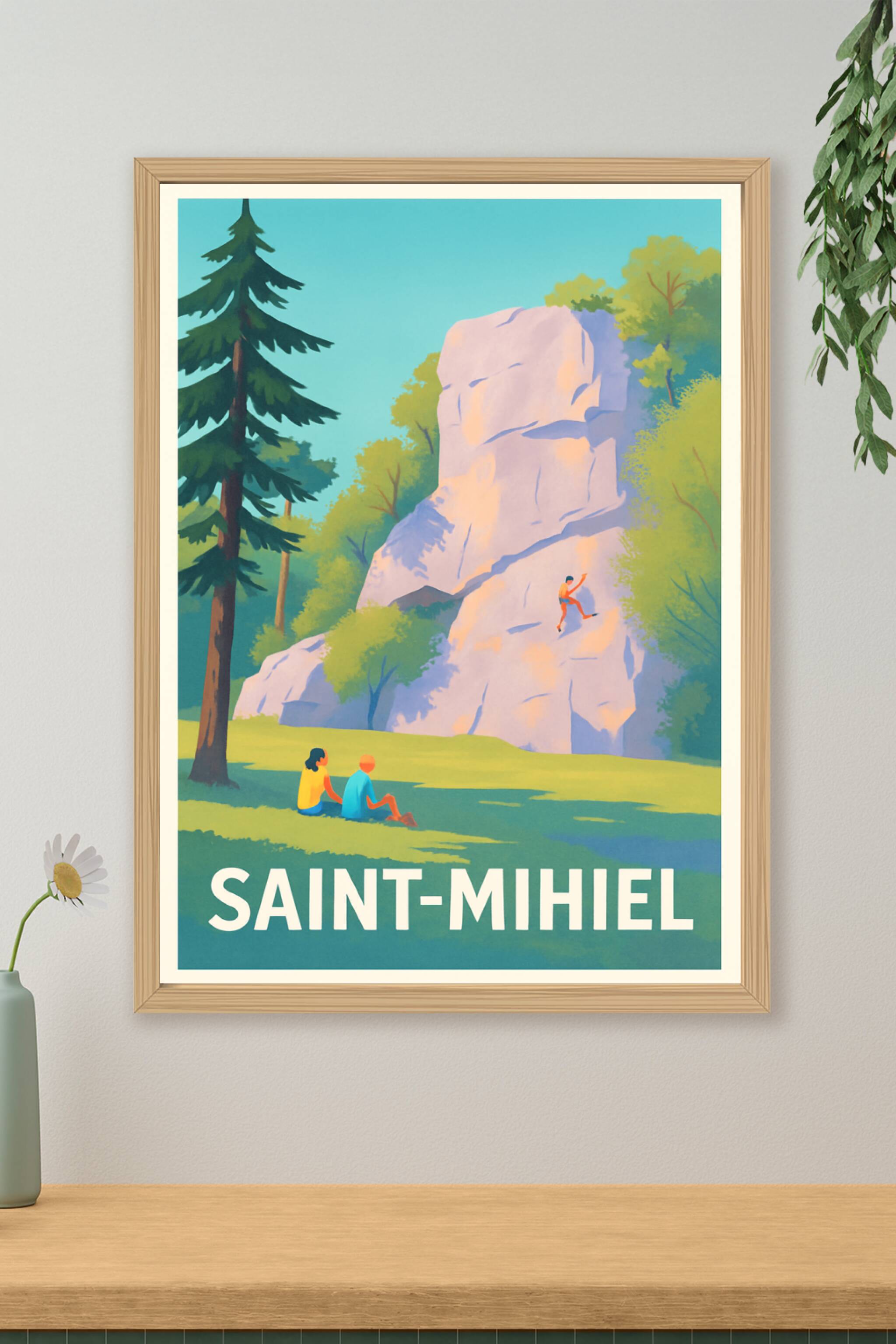 Découvrez la beauté naturelle de Saint-Mihiel avec cette affiche illustrée qui met en scène une scène paisible de plein air où l'escalade et la dét...