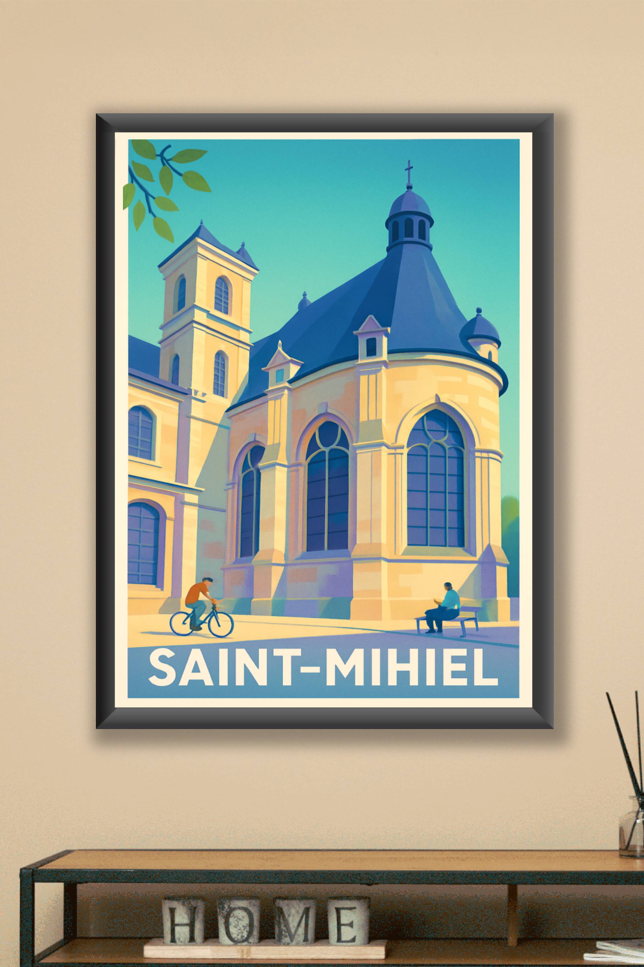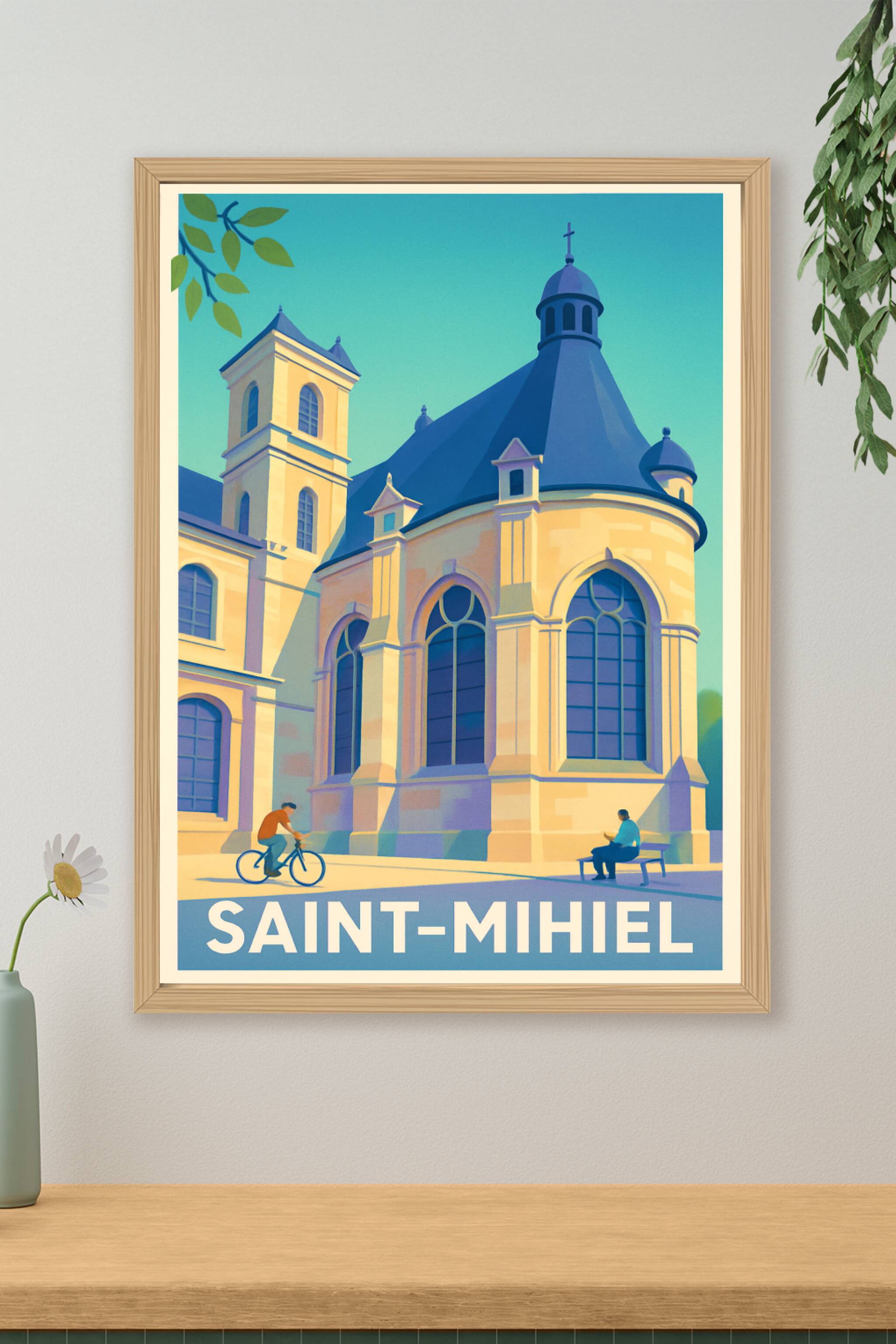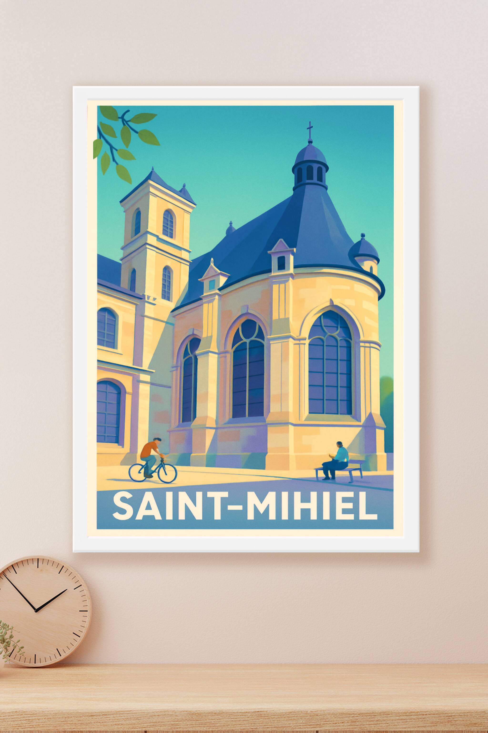 Découvrez le charme intemporel de Saint-Mihiel avec cette affiche illustrée qui met en valeur l'architecture élégante et paisible de la ville. Le p...