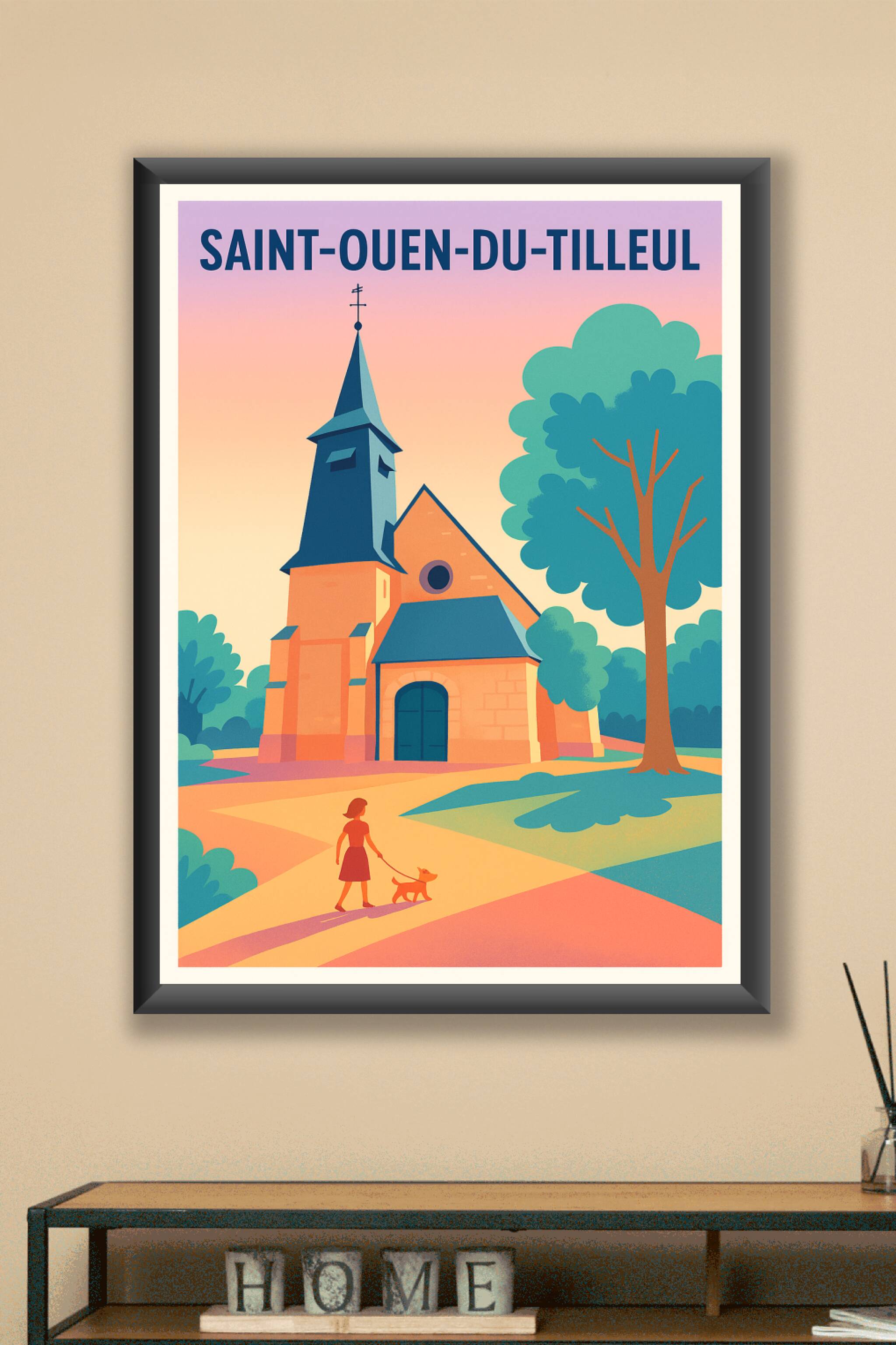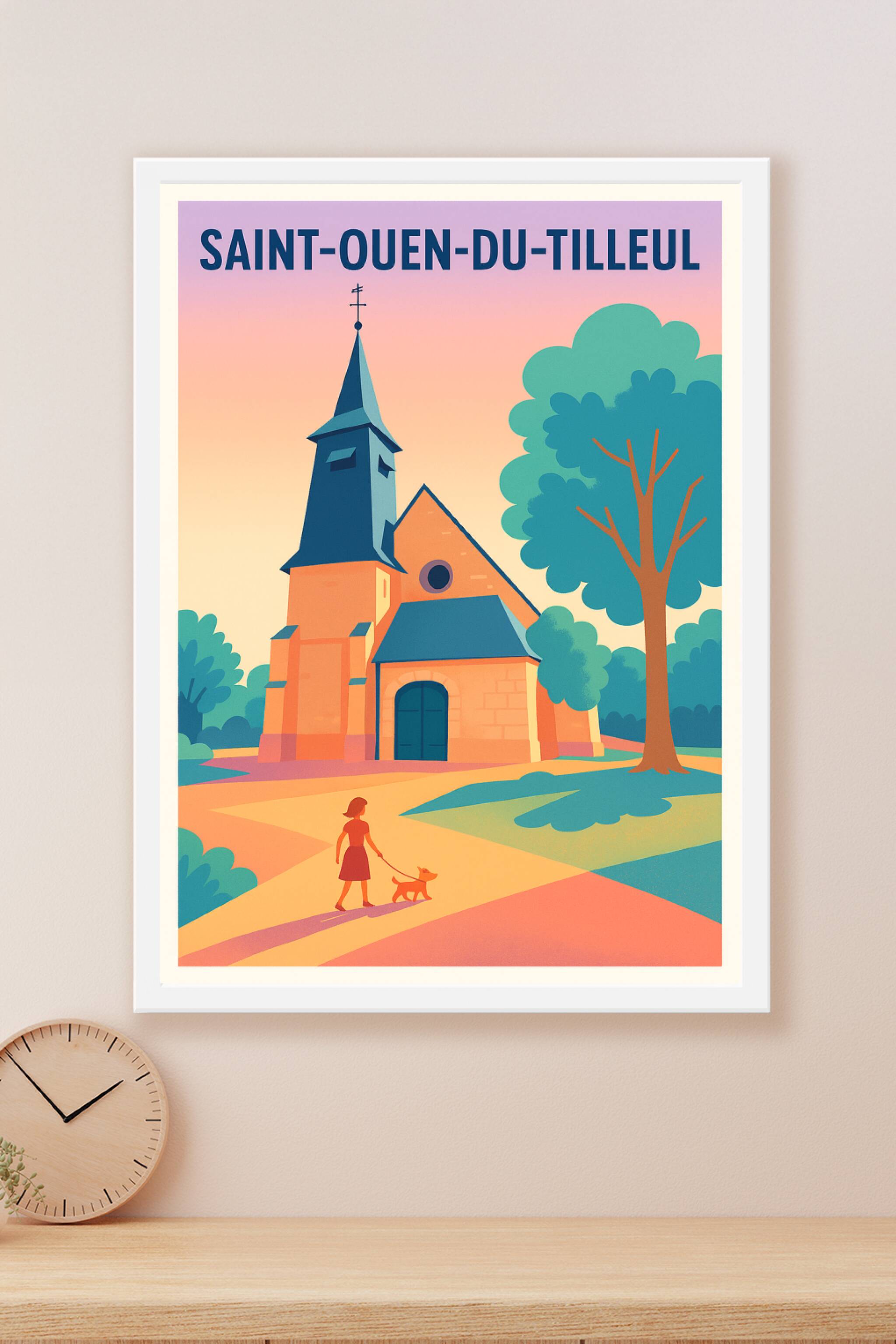 Apportez une touche de sérénité à votre intérieur avec cette affiche illustrant Saint-Ouen-du-Tilleul, mettant en scène une église typique entourée d'arbres et une balade tranquille au coucher du soleil. Ce poster au style doux et coloré capture l'essence d'un village paisible et authentique. Imprimé en tirage "Fine Art" sur papier coton 305g, il garantit une qualité d'impression exceptionnelle et une durabilité optimale. Disponible en formats A1 à A4, avec ou sans cadre, cette affiche est idéale pour sublimer votre décoration ou offrir un souvenir raffiné de Saint-Ouen-du-Tilleul. Profitez d’un produit 100% fabriqué en France, qui allie qualité premium et esthétique intemporelle.