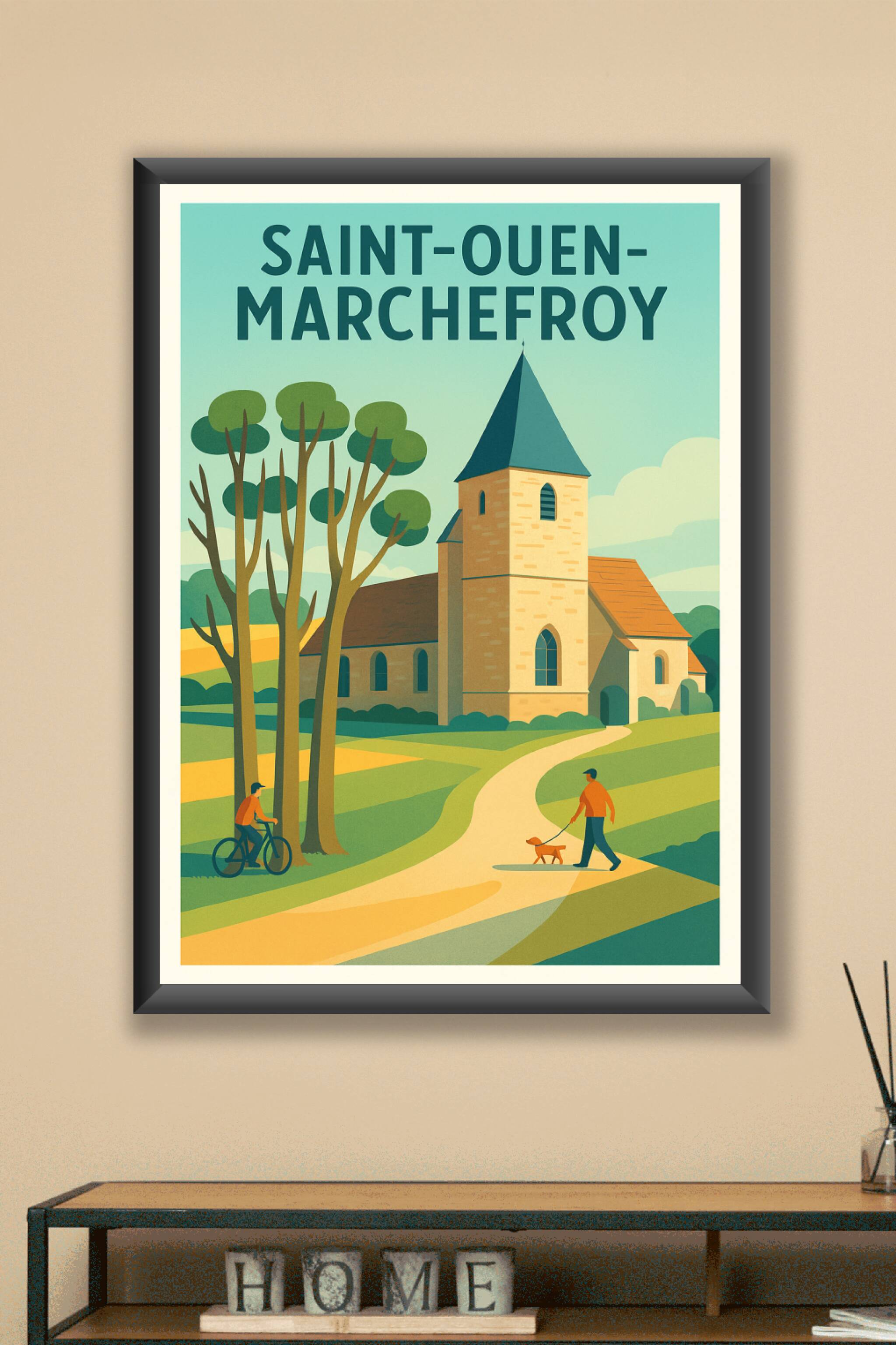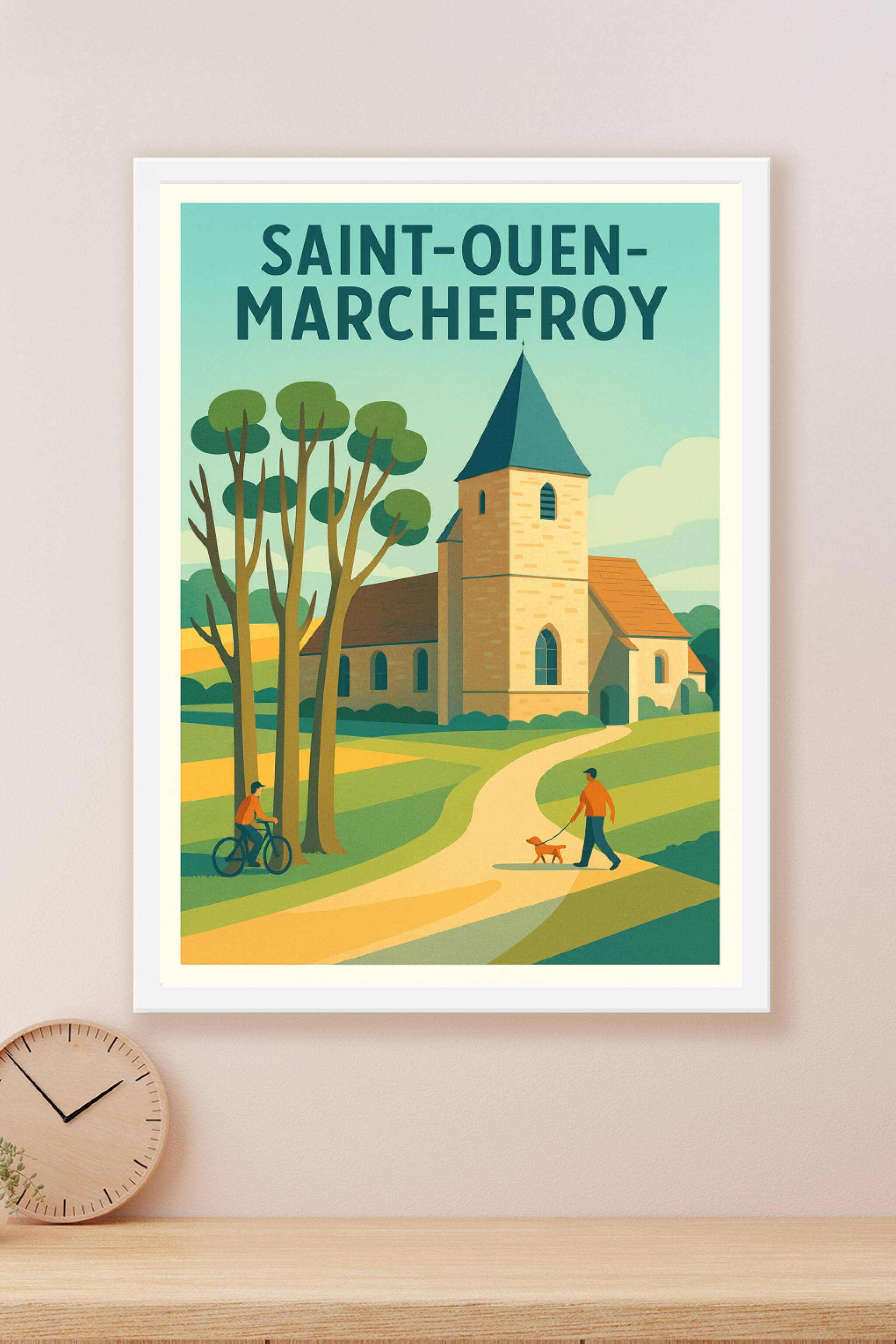 Apportez une touche de calme et de nature à votre intérieur avec cette affiche illustrée représentant l'église pittoresque de Saint-Ouen-Marchefroy...