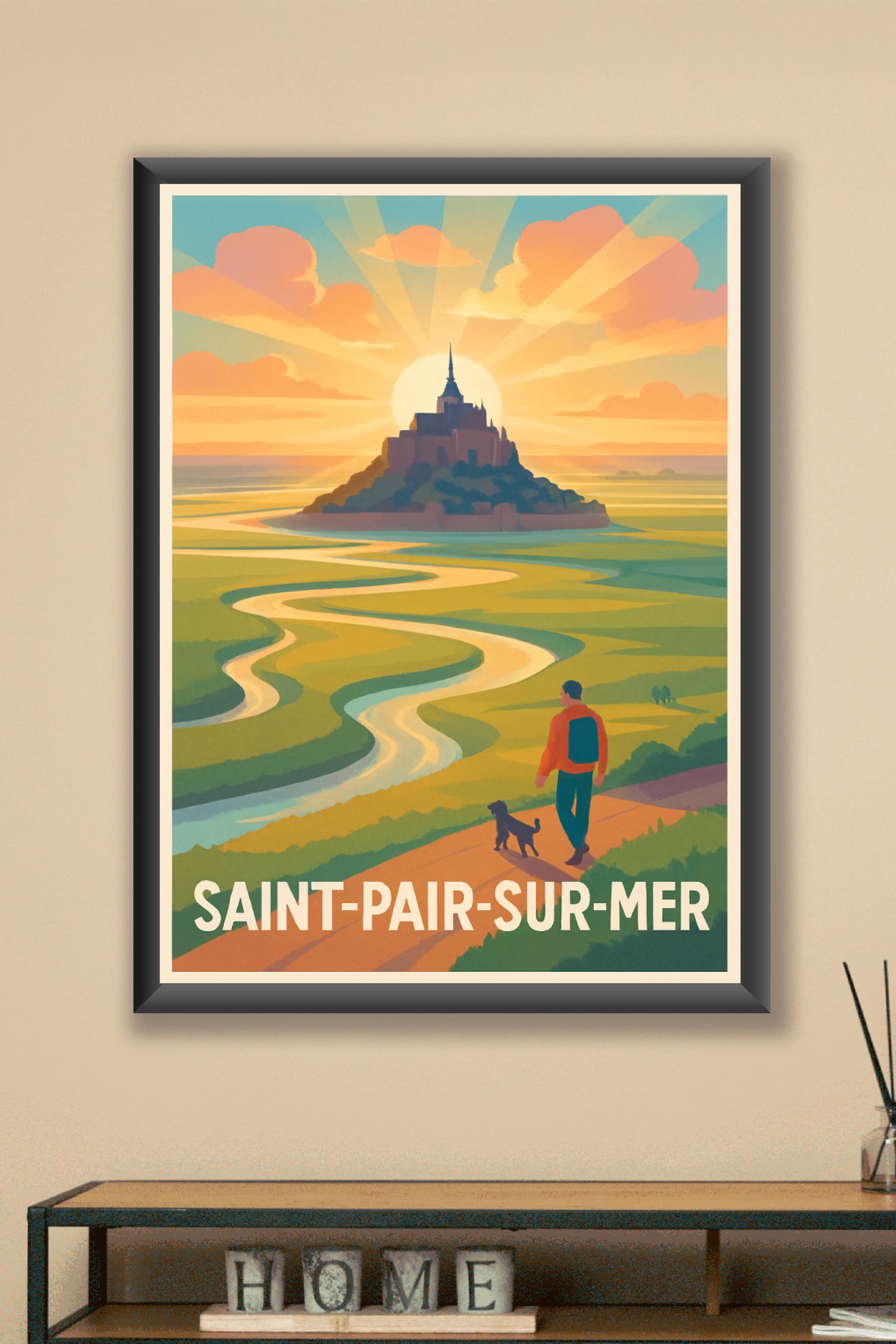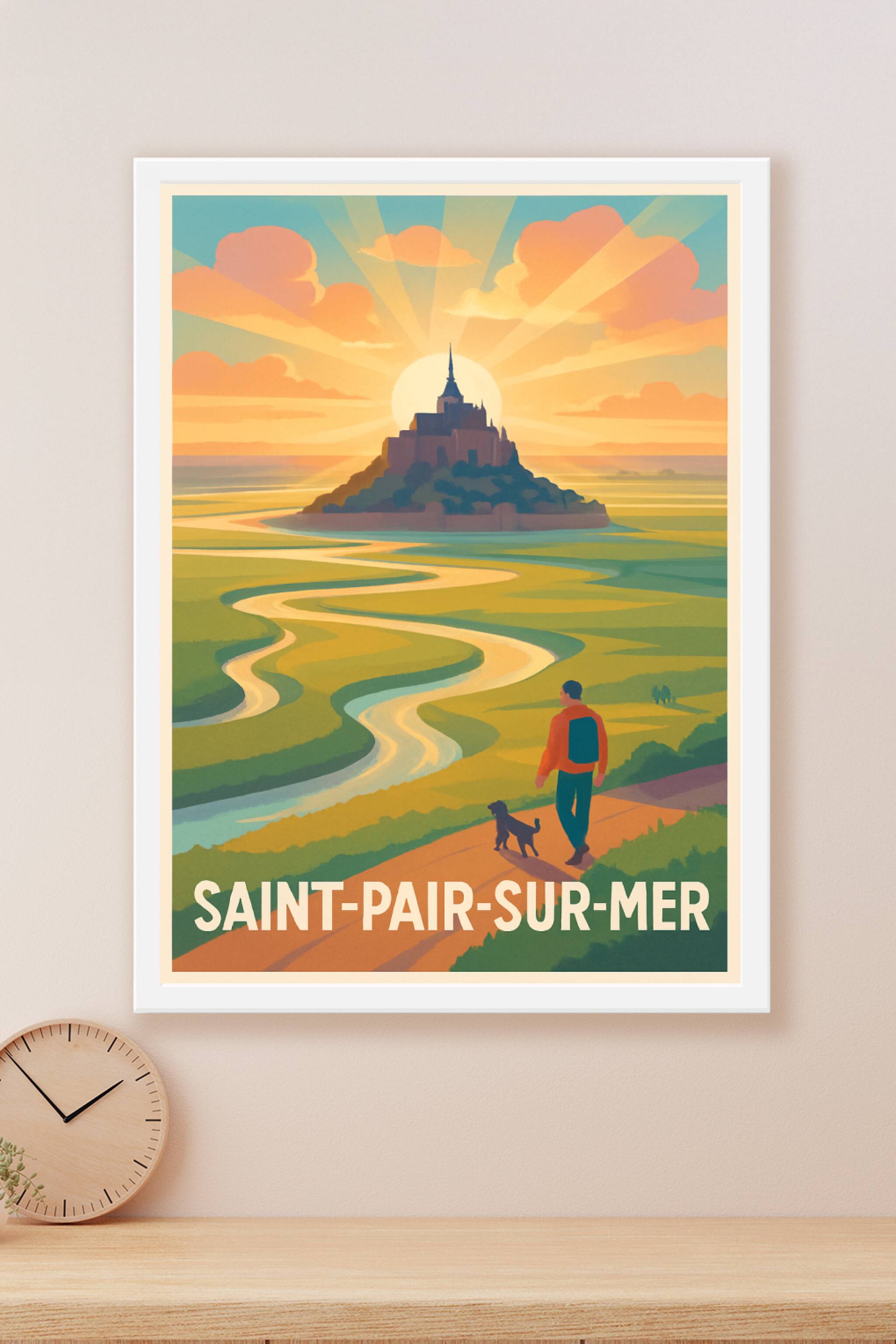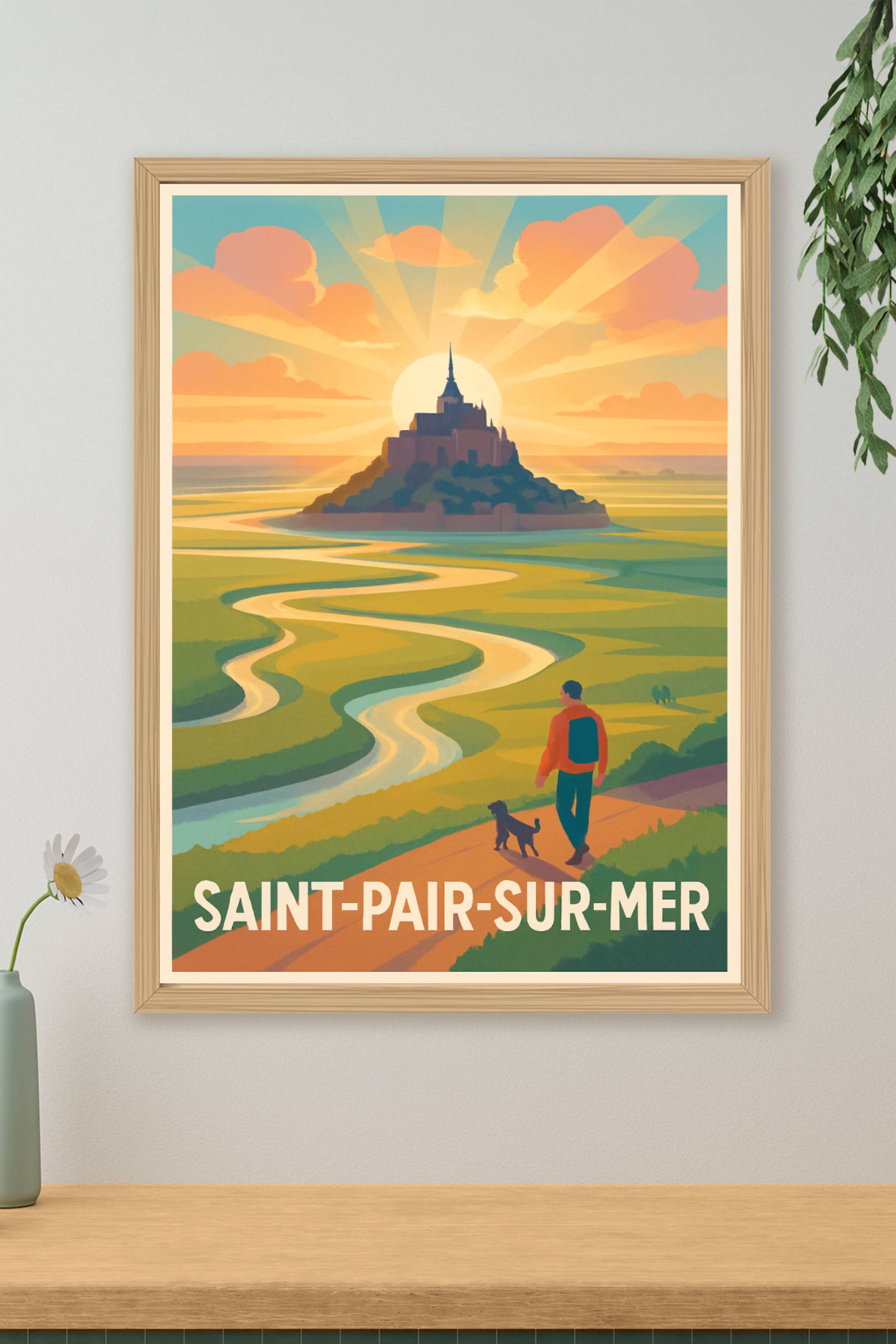 Découvrez la sérénité de Saint-Pair-sur-Mer avec cette affiche illustrant un paysage enchanteur où un promeneur et son chien admirent un coucher de...