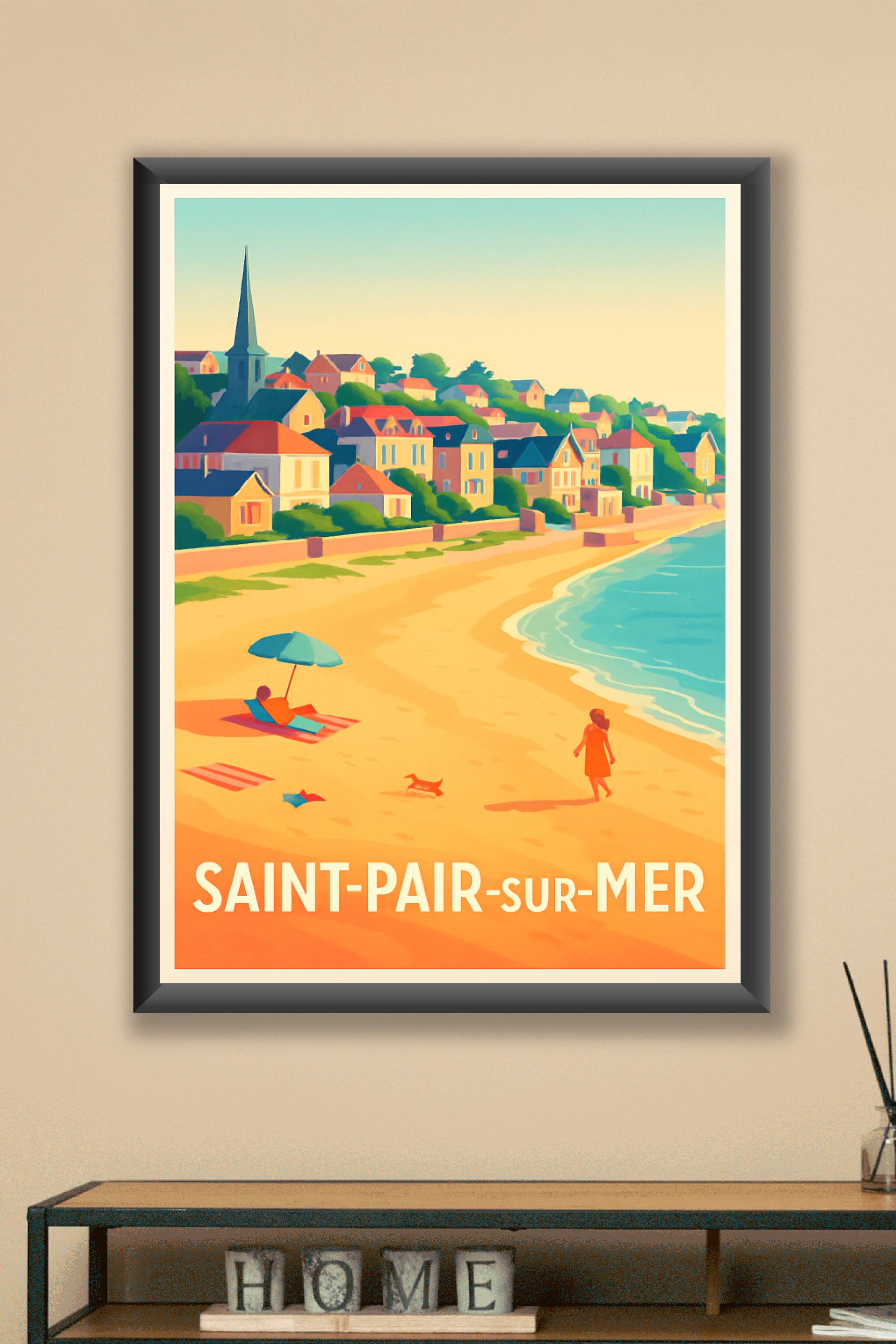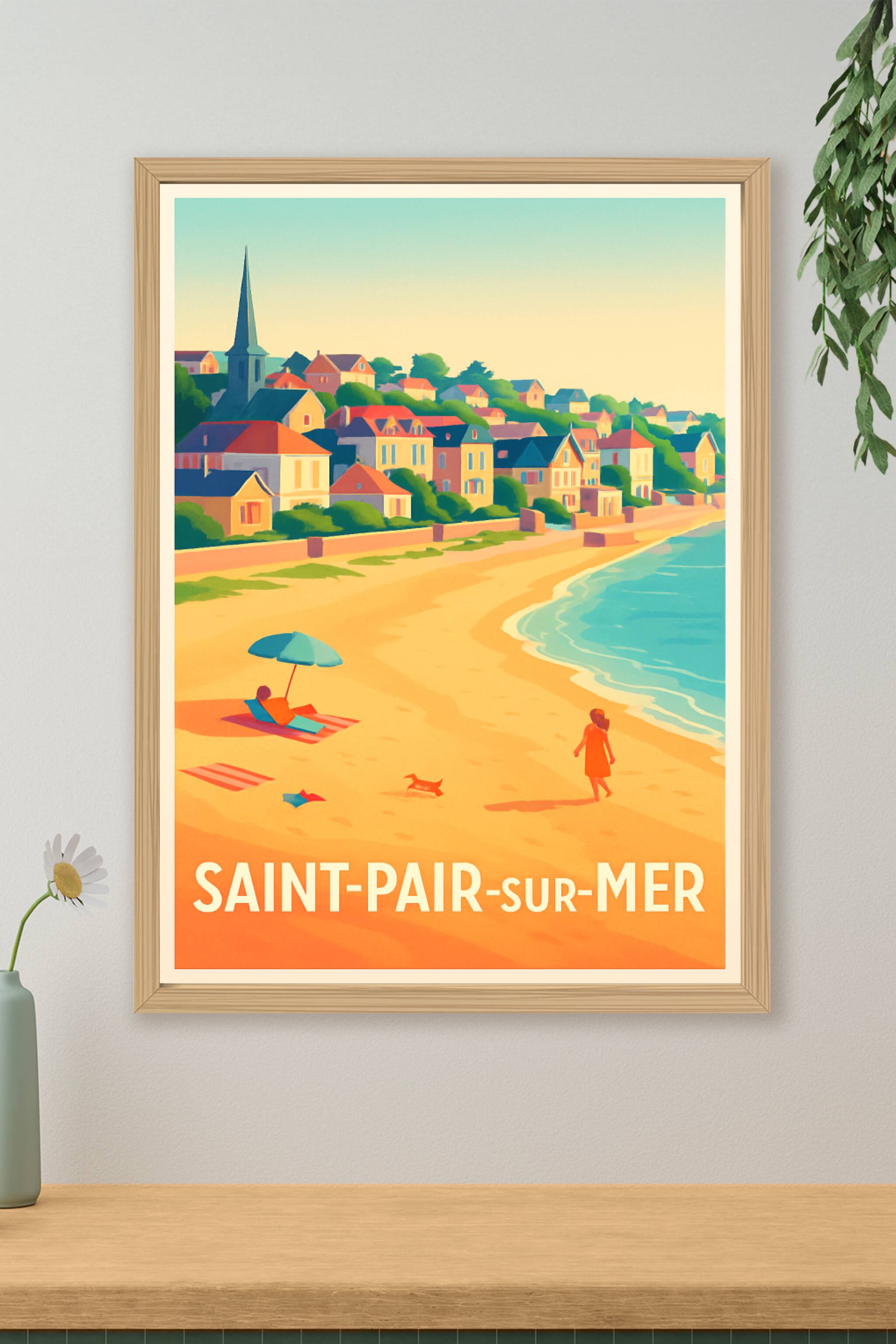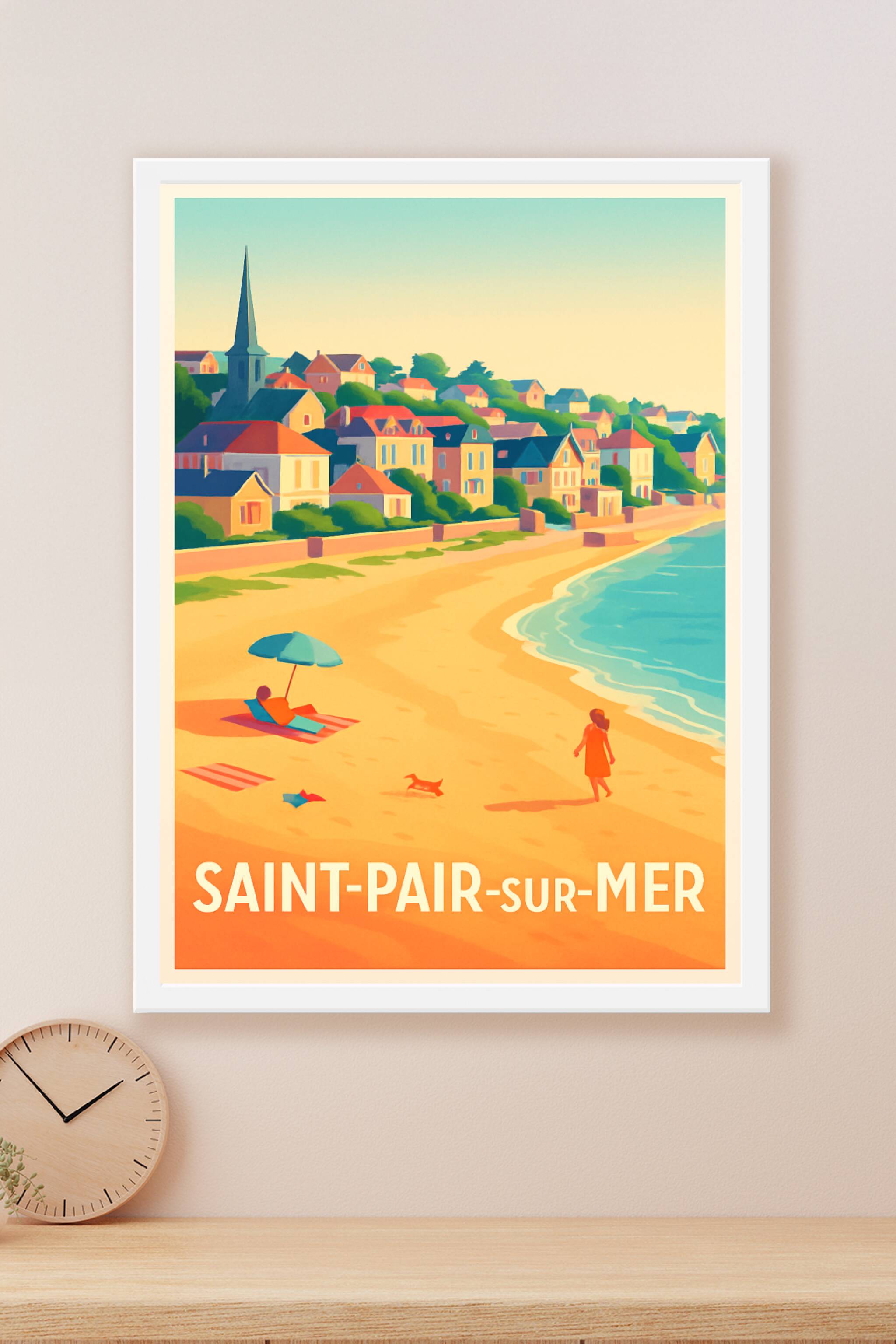 Découvrez l'atmosphère paisible de Saint-Pair-sur-Mer avec cette affiche vibrante qui capture la douceur de la vie en bord de mer. Ce poster illust...