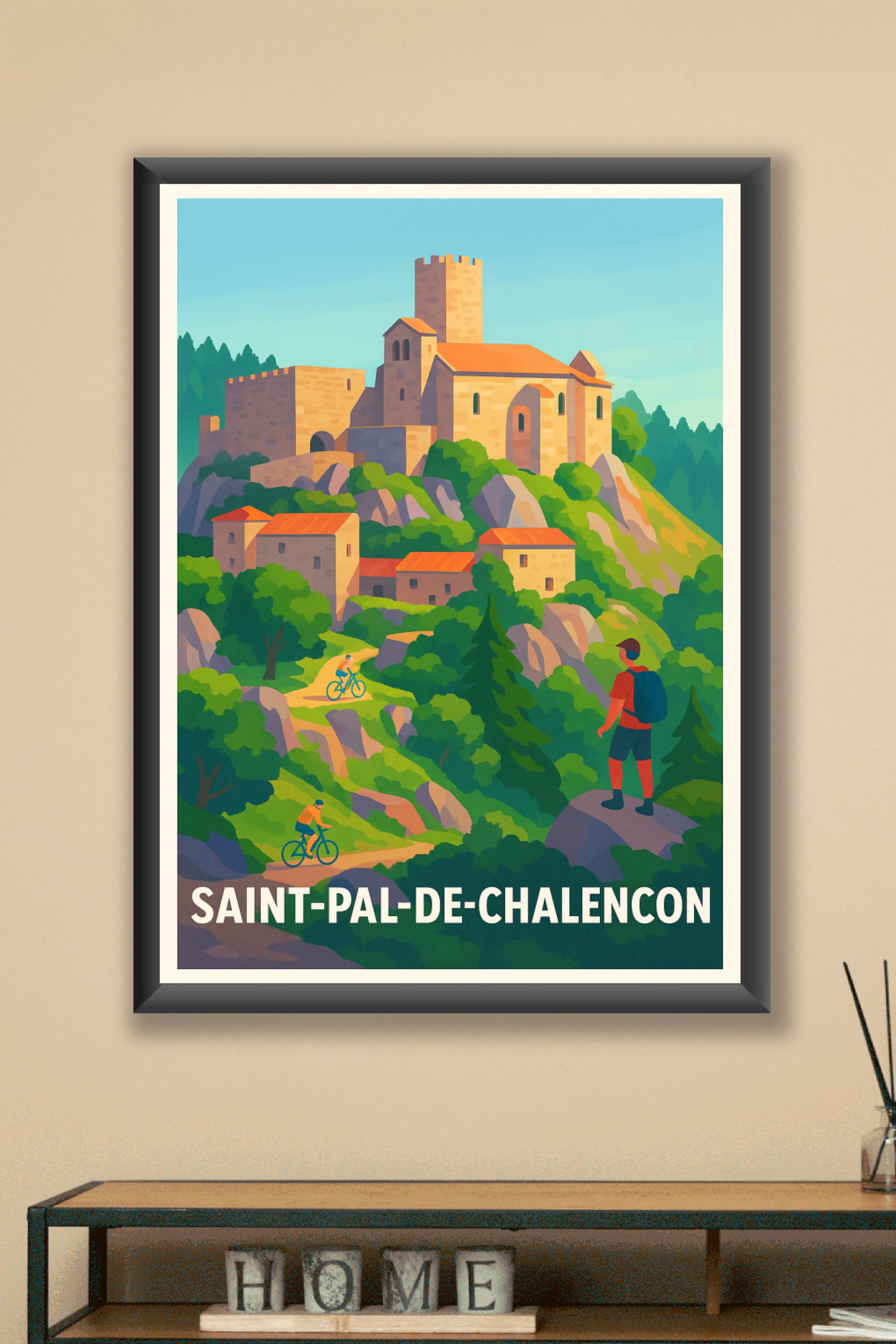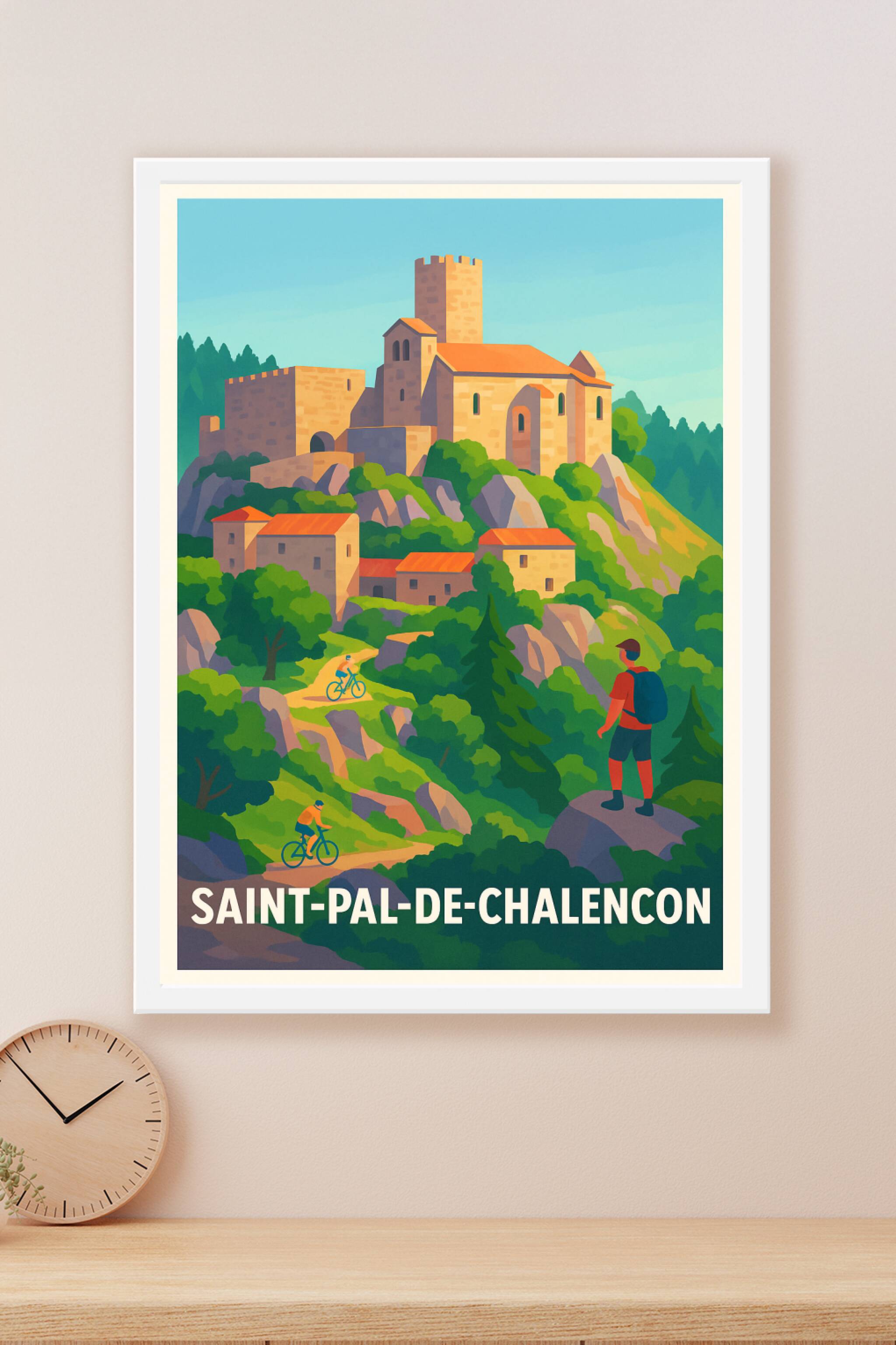 Découvrez le charme naturel et médiéval de Saint-Pal-de-Chalencon avec cette affiche illustrée mettant en avant un paysage vallonné, parcouru par d...