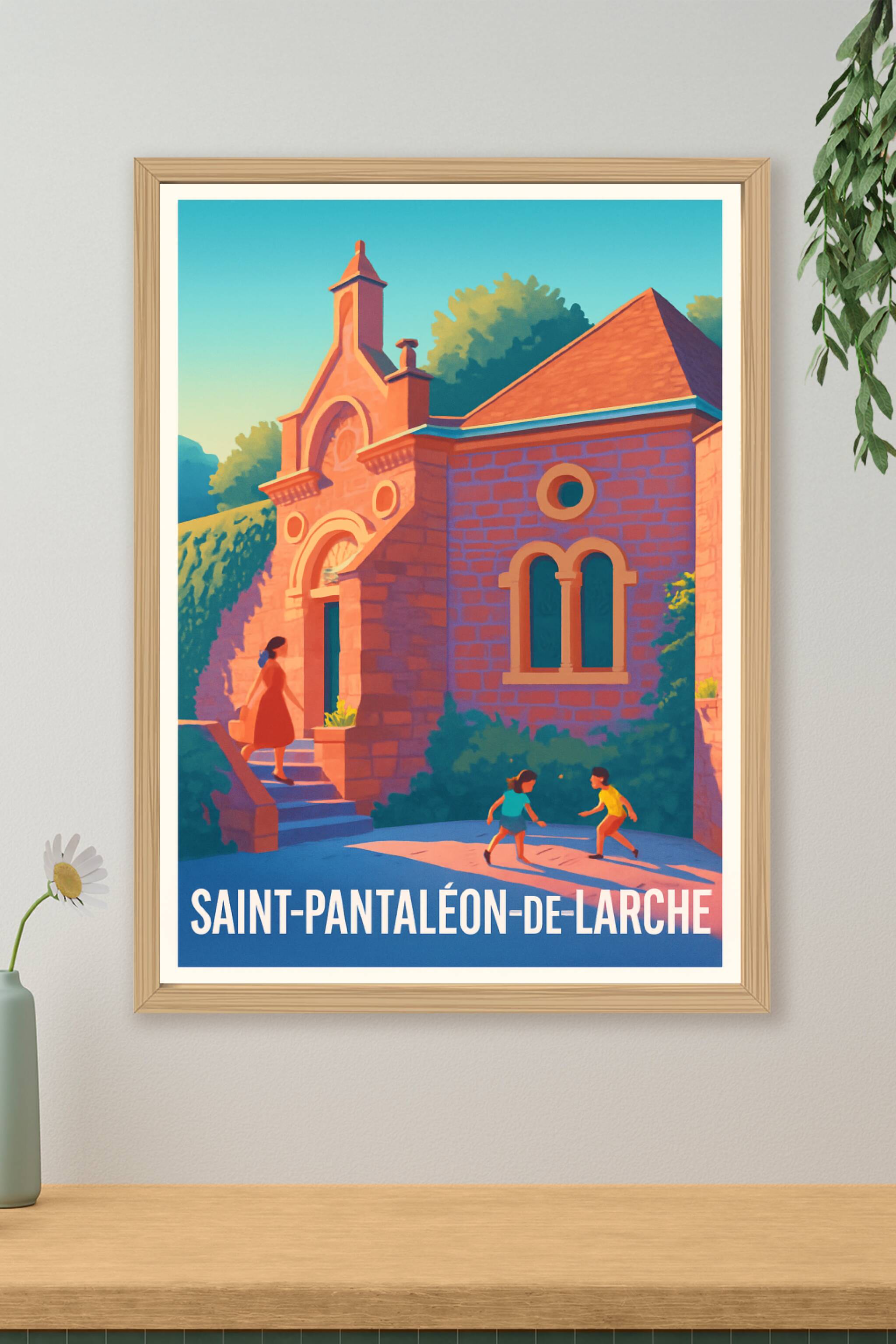 Découvrez l'atmosphère paisible et lumineuse de Saint-Pantaléon-de-Larche à travers cette affiche illustrée mettant en scène son architecture typiq...