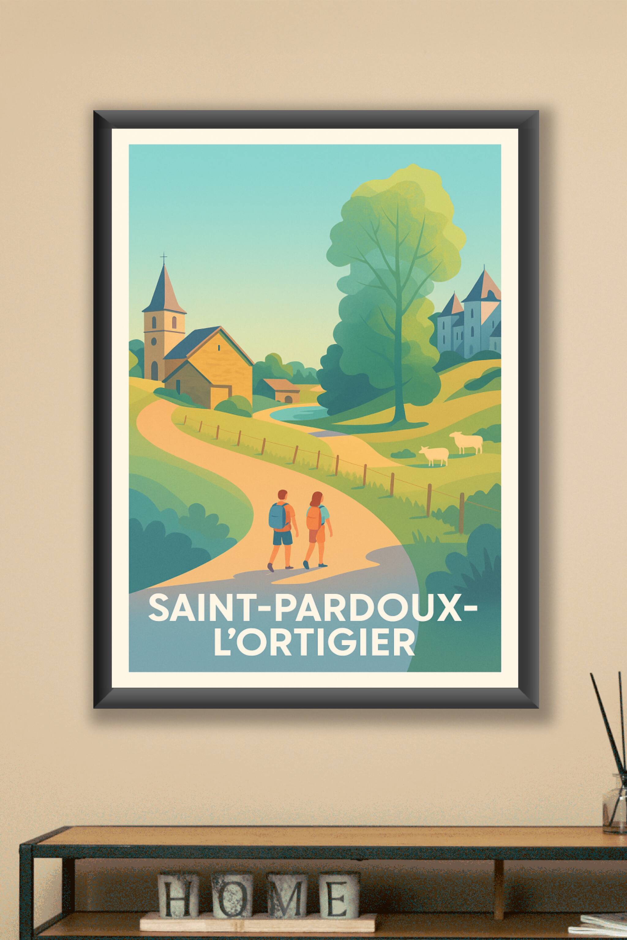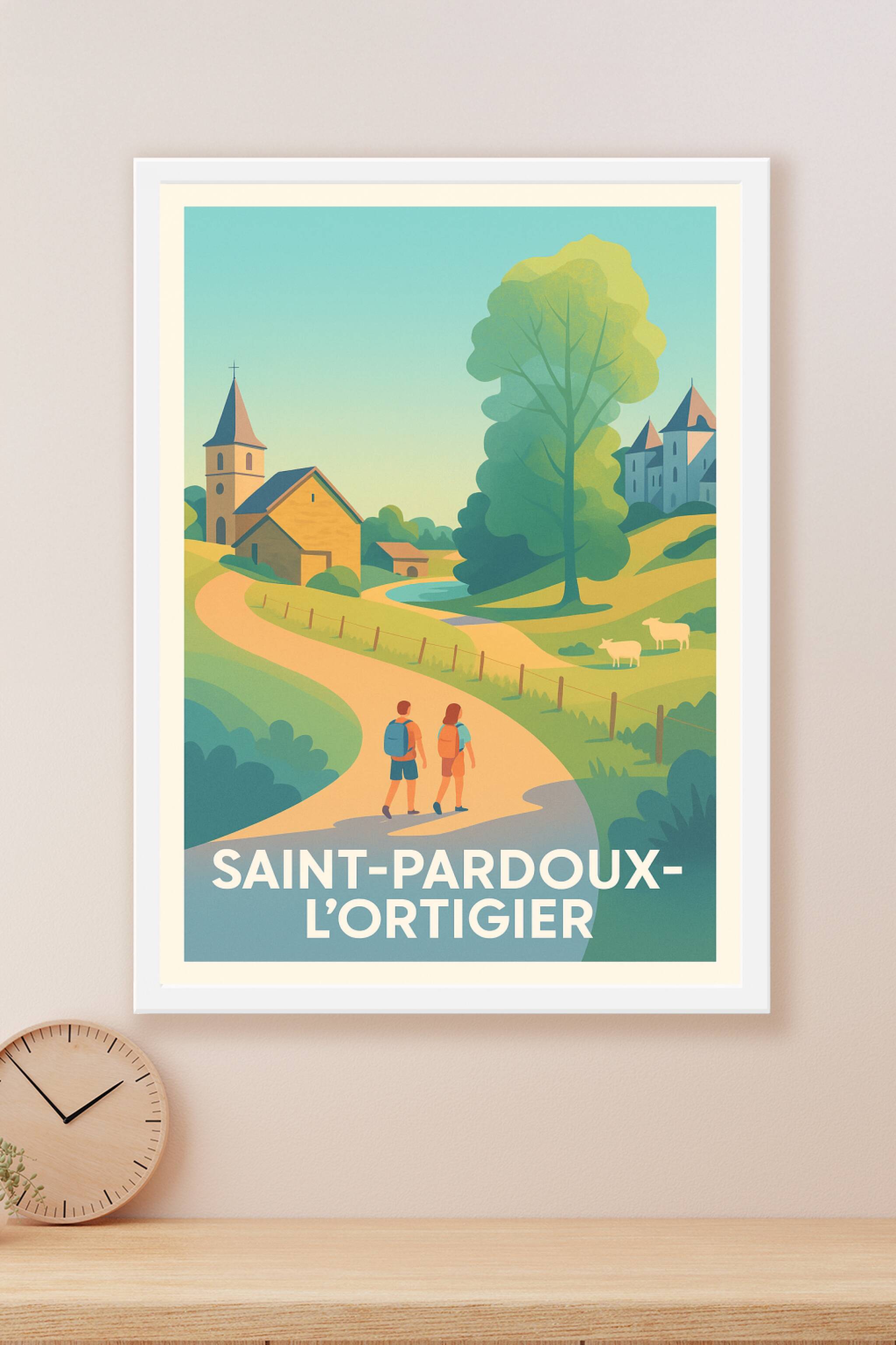 Découvrez la sérénité de Saint-Pardoux-l’Ortigier avec cette affiche illustrant un chemin campagnard bucolique, bordé d’une église et de charmantes...
