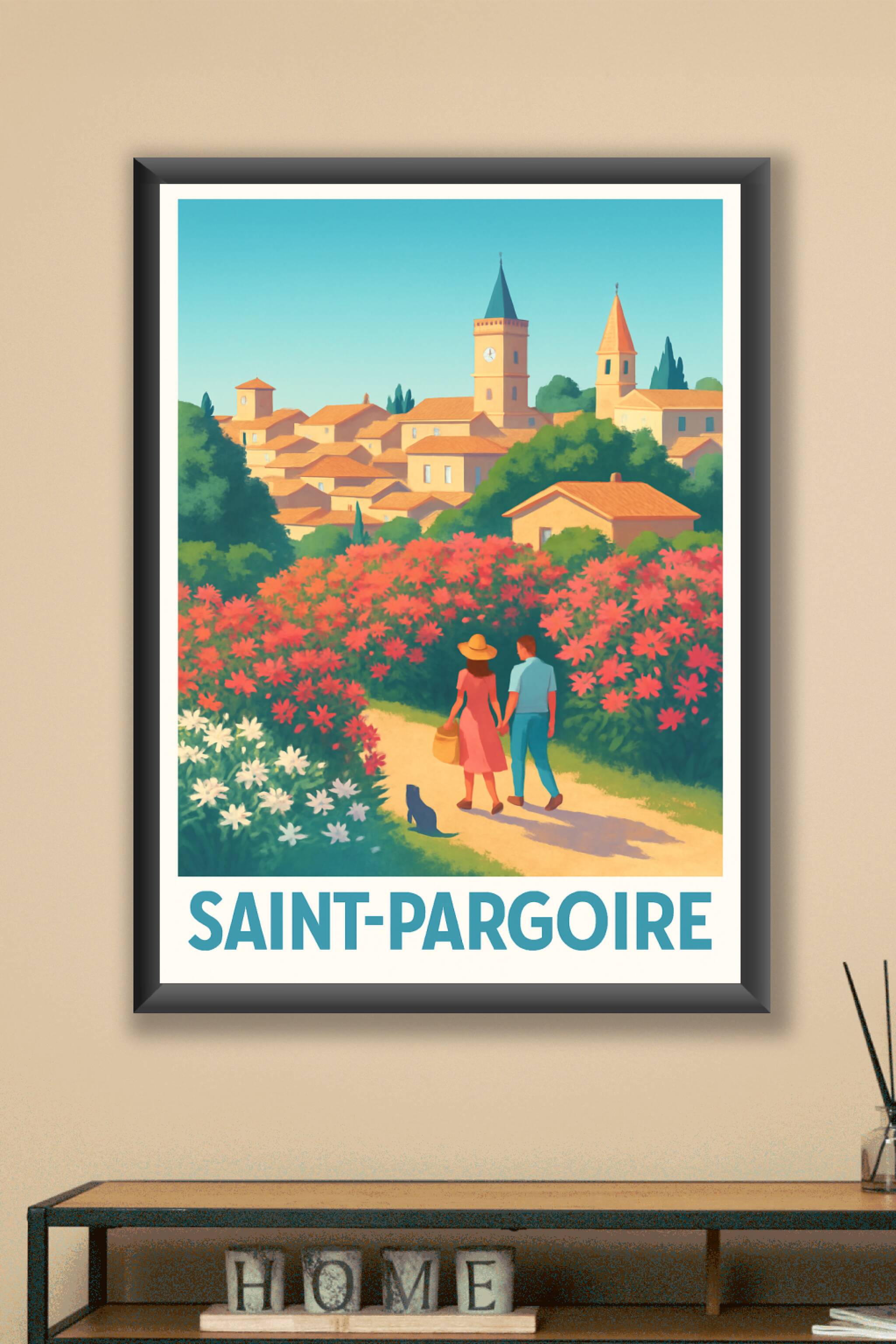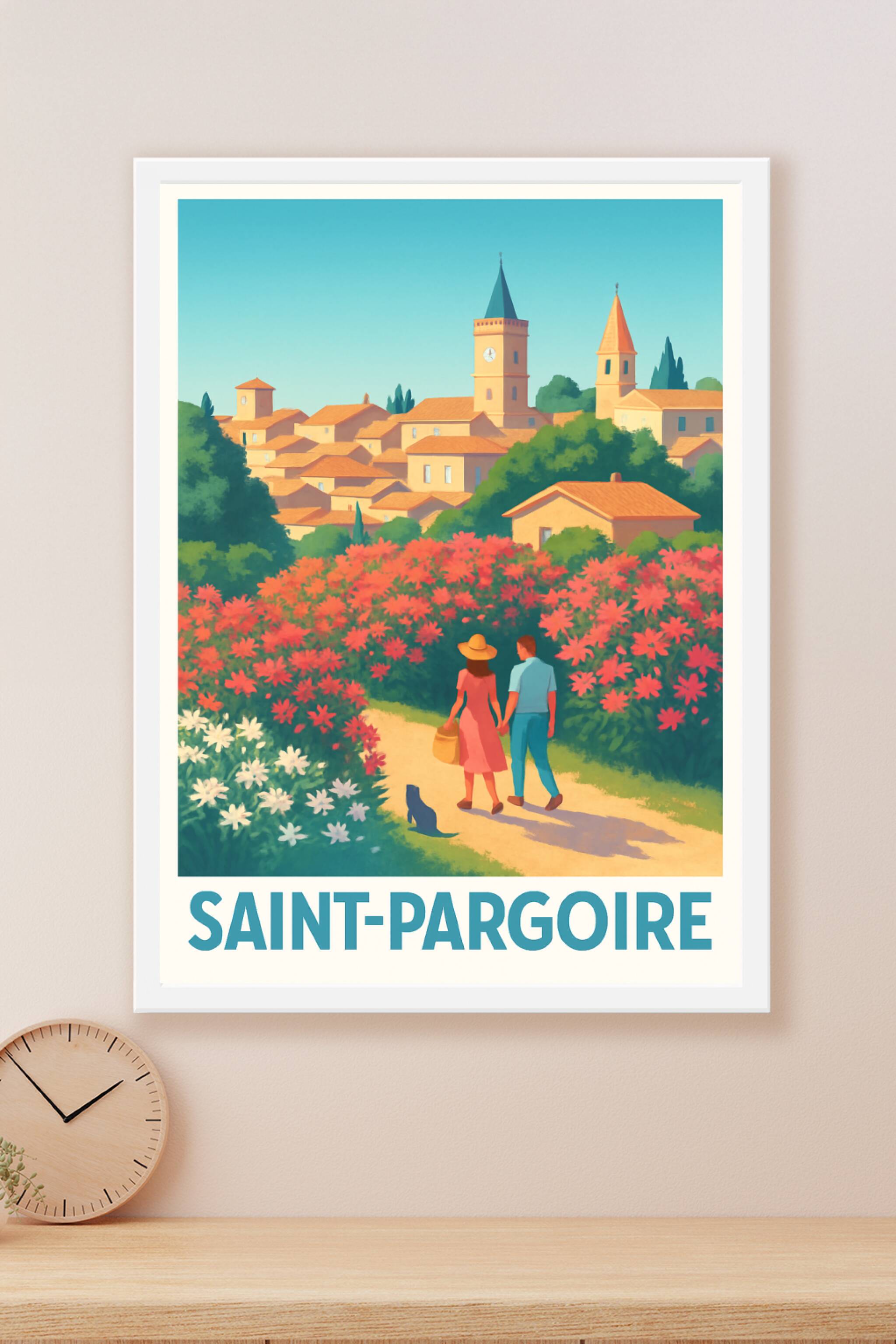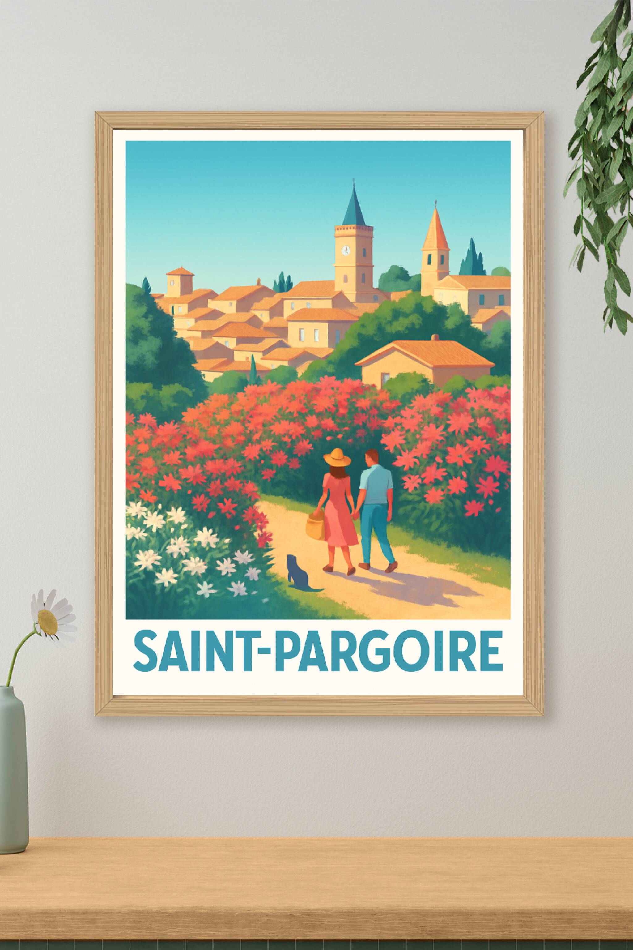 Découvrez le charme bucolique de Saint-Pargoire avec cette affiche illustrée, mettant en scène une promenade romantique au milieu des fleurs éclata...