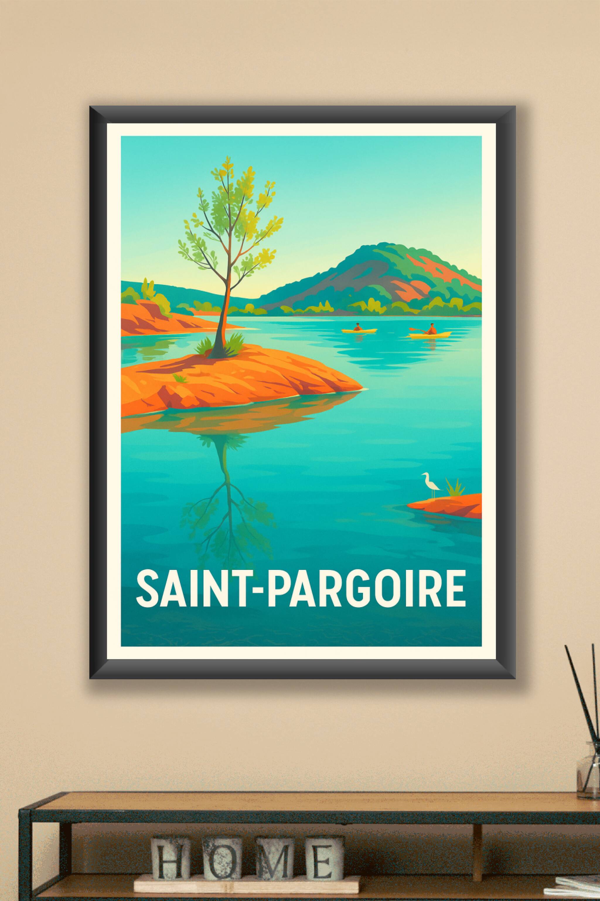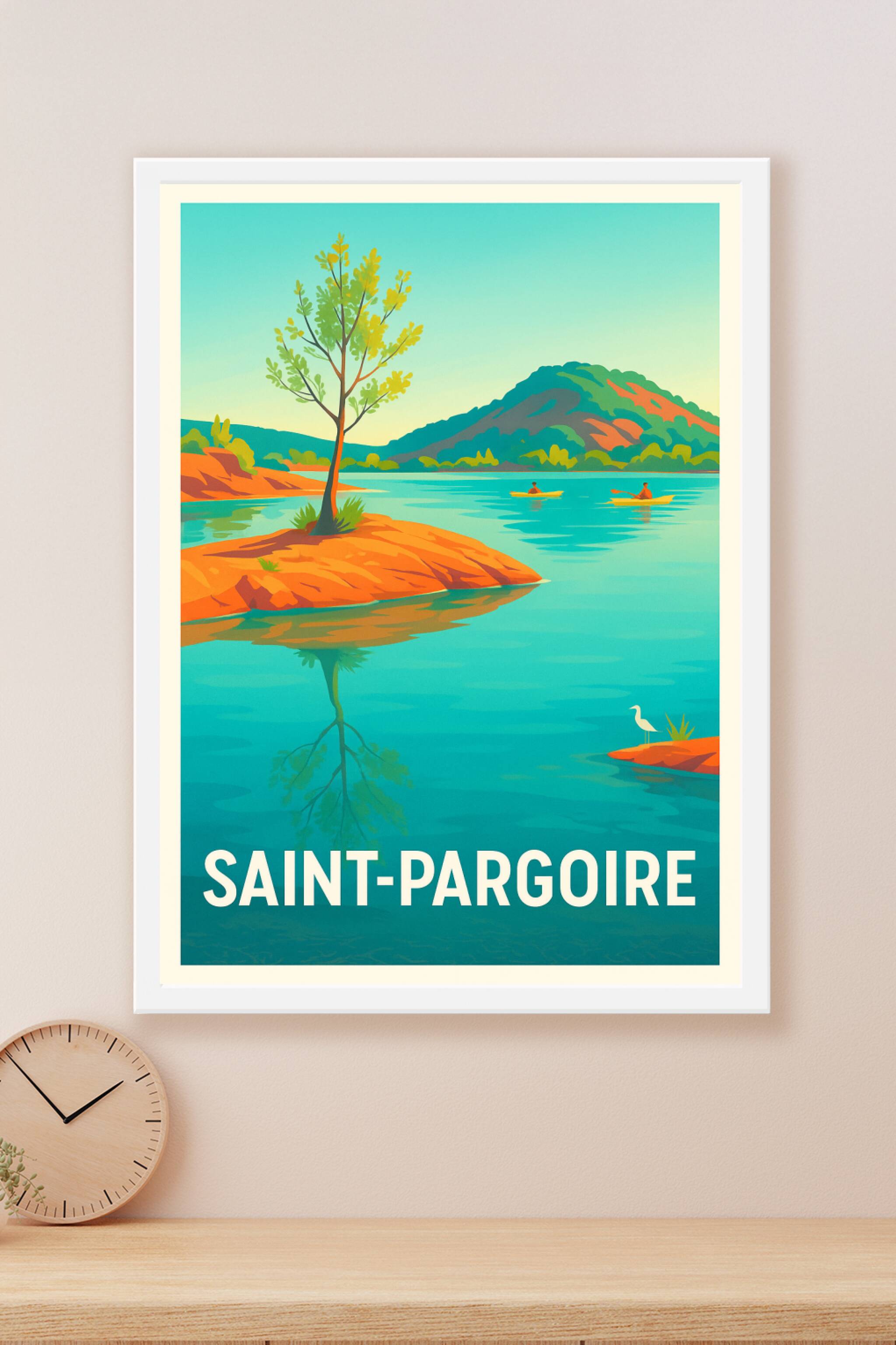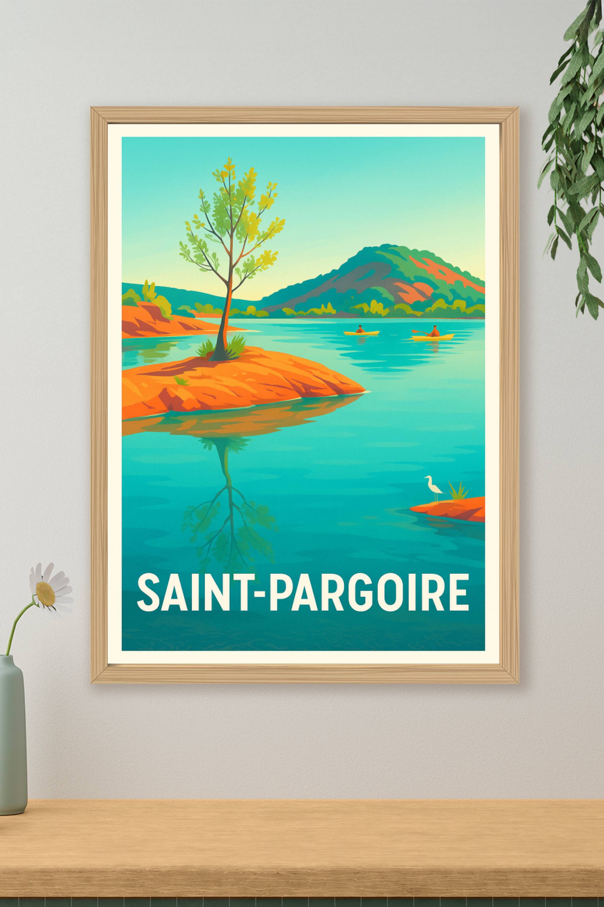 Découvrez la sérénité de Saint-Pargoire avec cette affiche au style vintage qui met en valeur ses paysages aquatiques paisibles et ses collines ver...