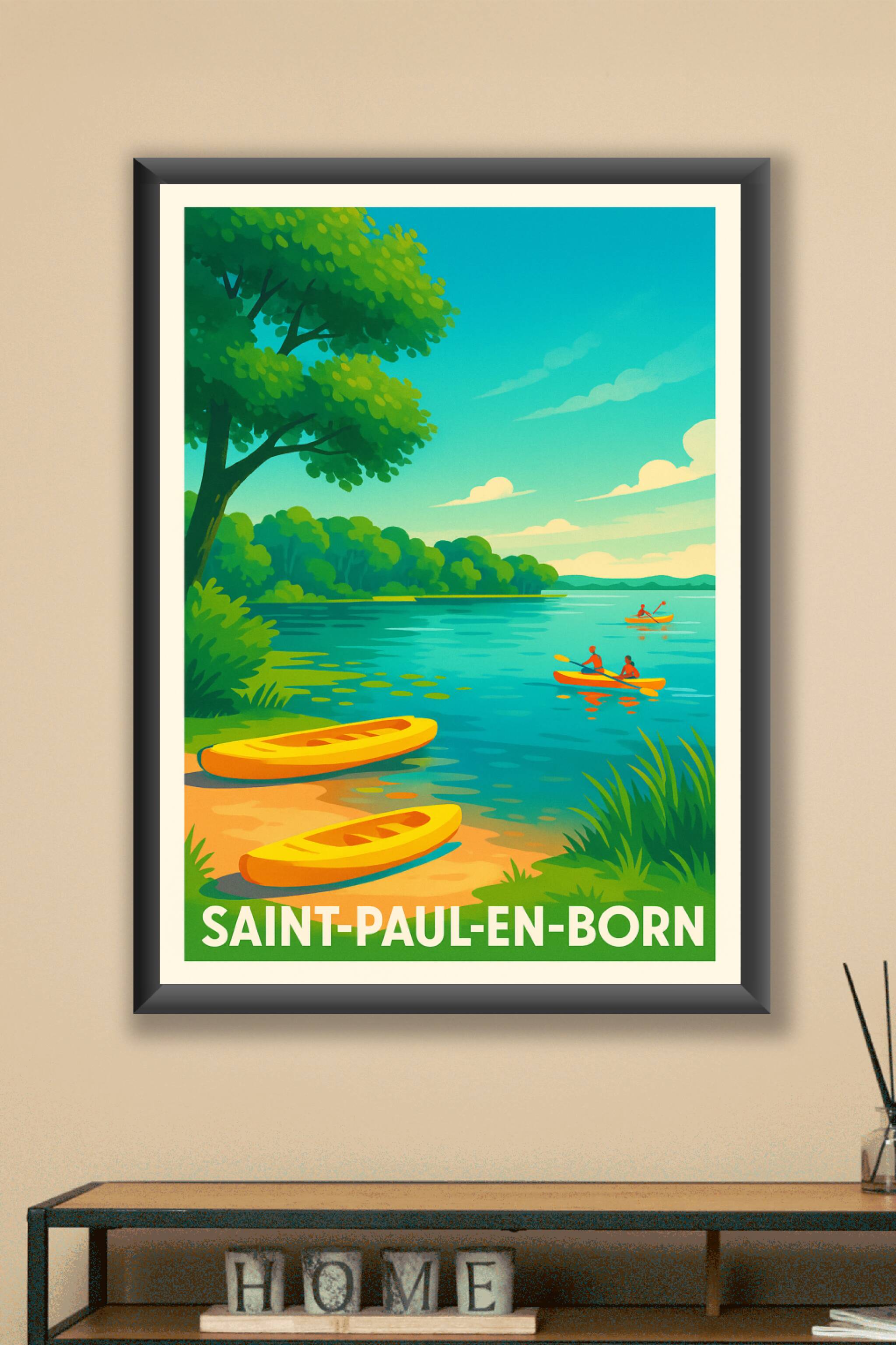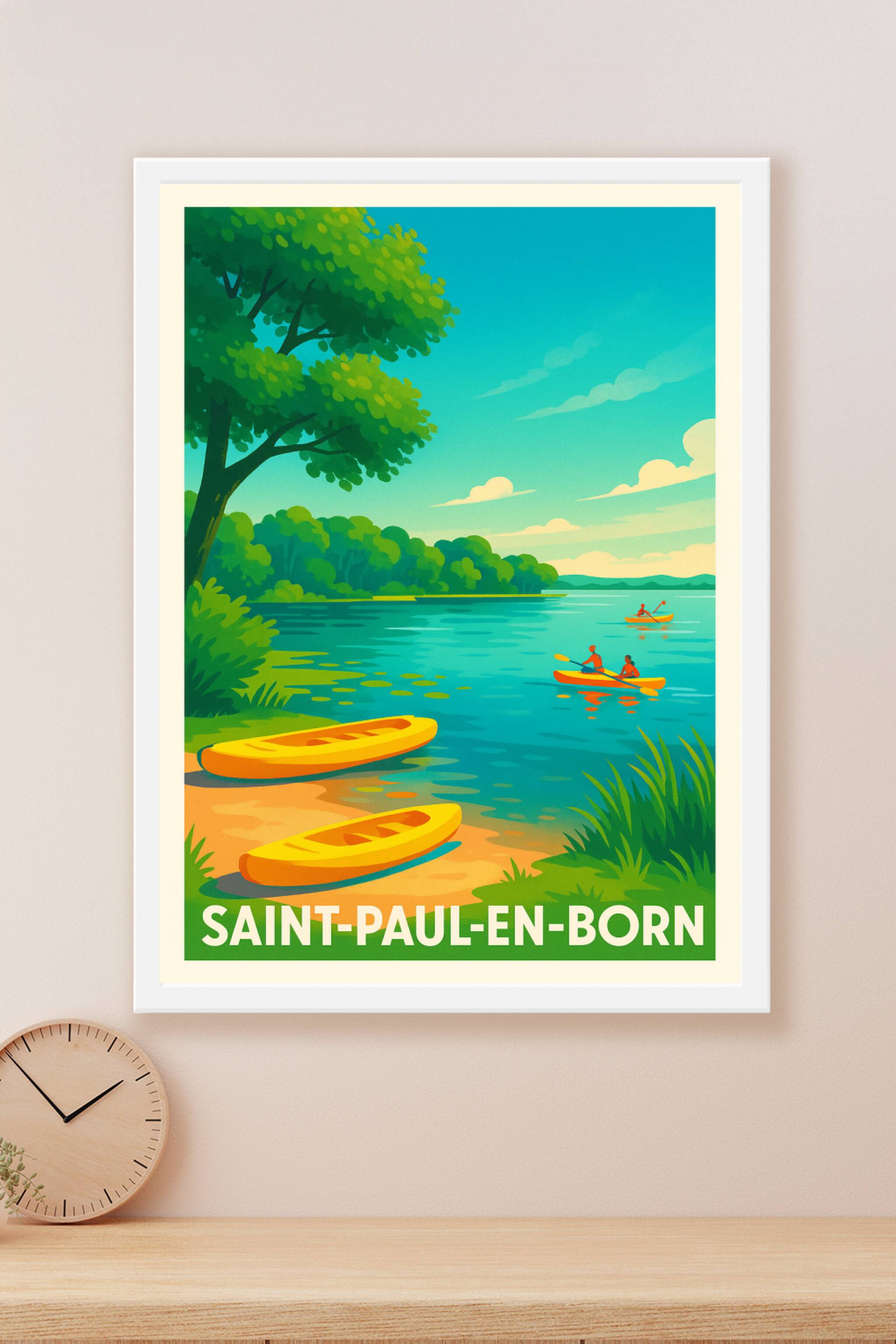 Découvrez l'atmosphère paisible et verdoyante de Saint-Paul-en-Born avec cette affiche illustrée mettant en scène un lac tranquille, des kayaks col...