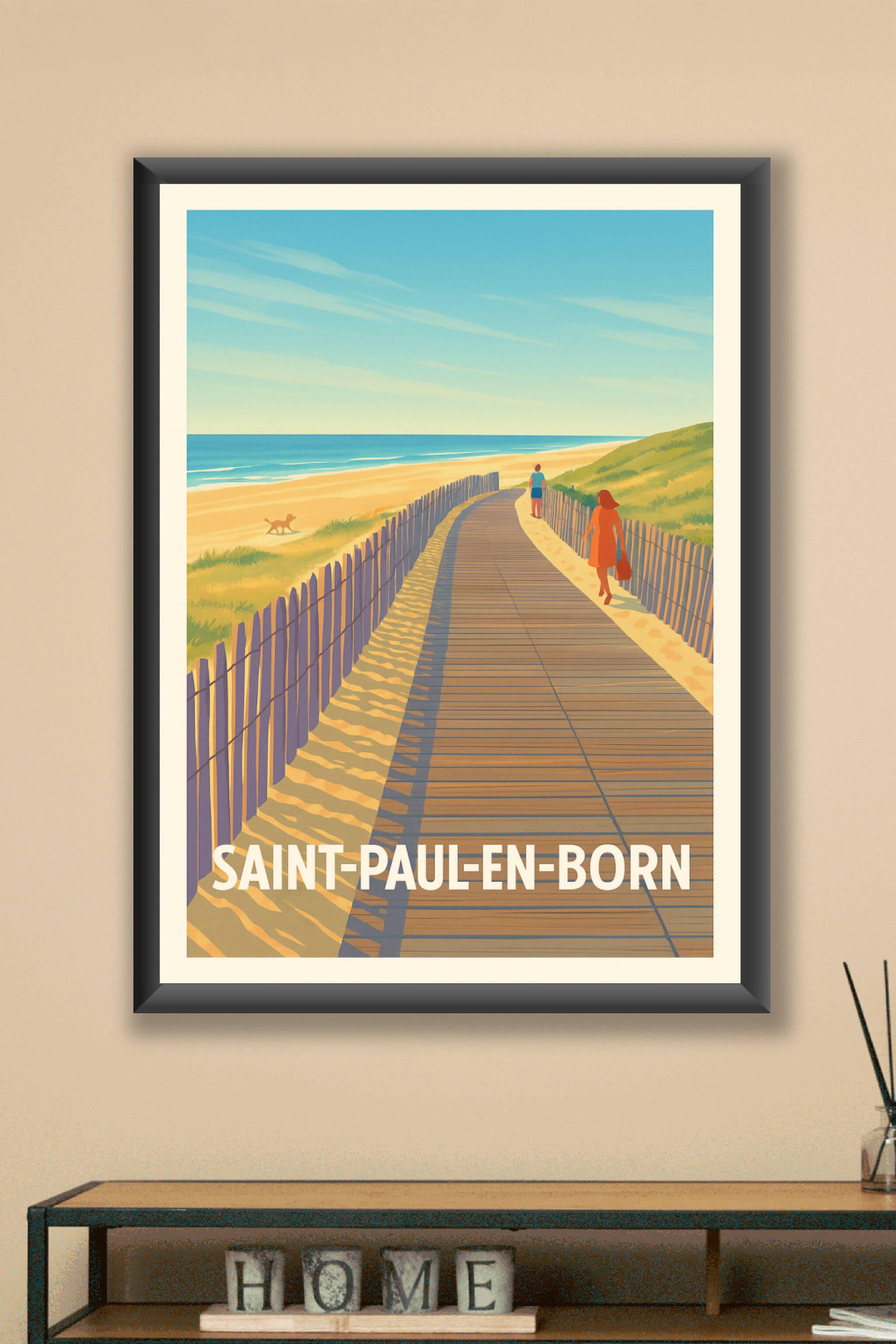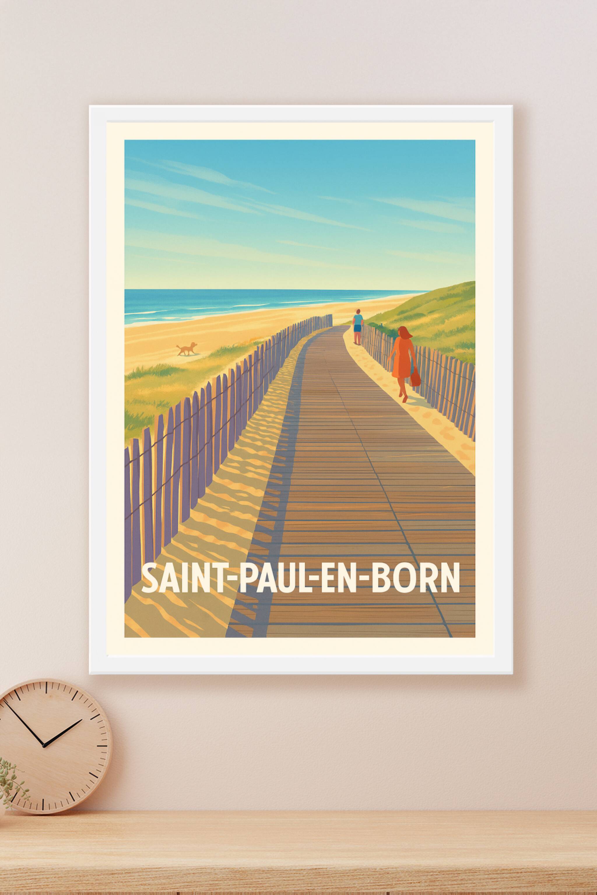 Évadez-vous vers les plages dorées de Saint-Paul-en-Born avec cette affiche au style vintage chaleureux et apaisant. Cette scène illustrée capture ...