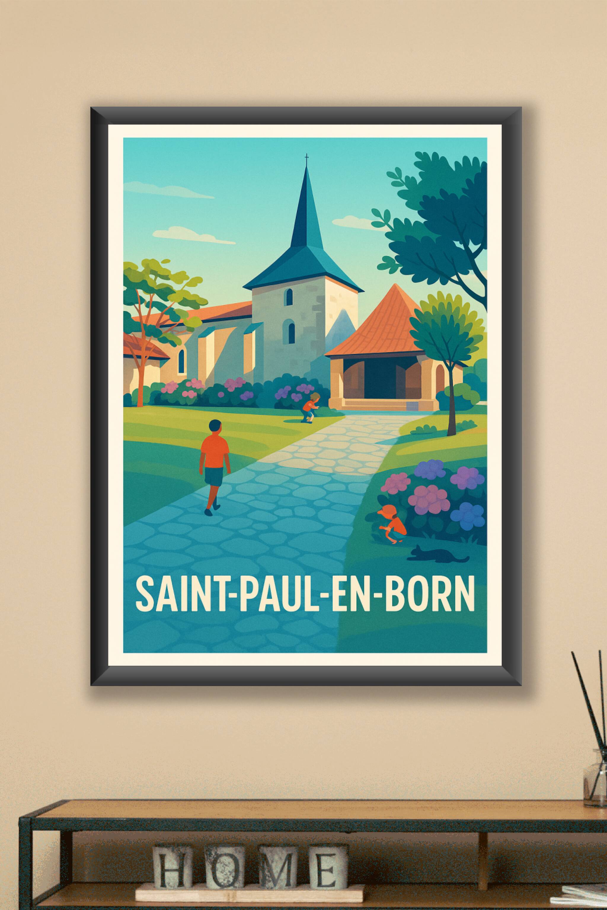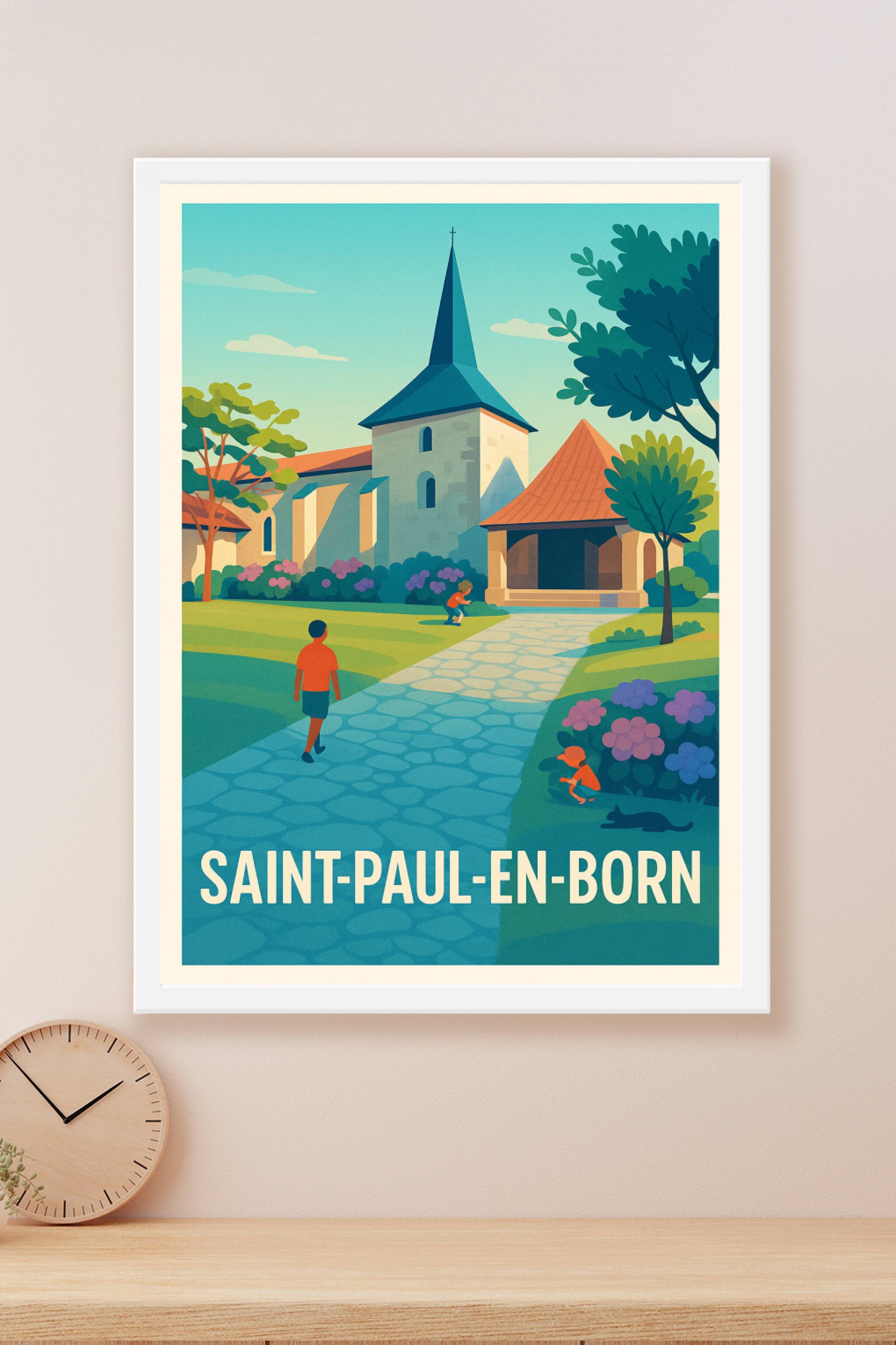 Découvrez la quiétude et l'authenticité de Saint-Paul-en-Born à travers cette affiche au style illustratif chaleureux et coloré. Le poster met en l...