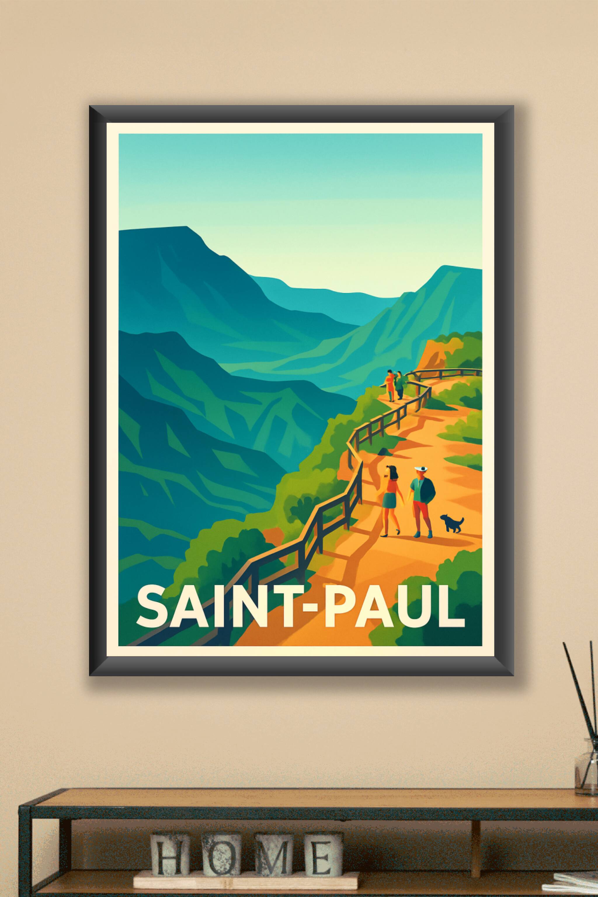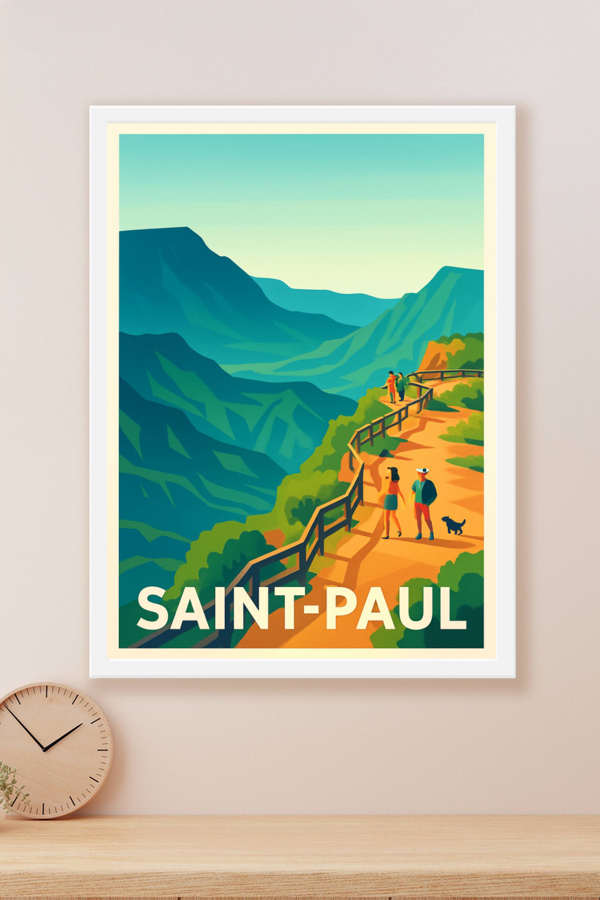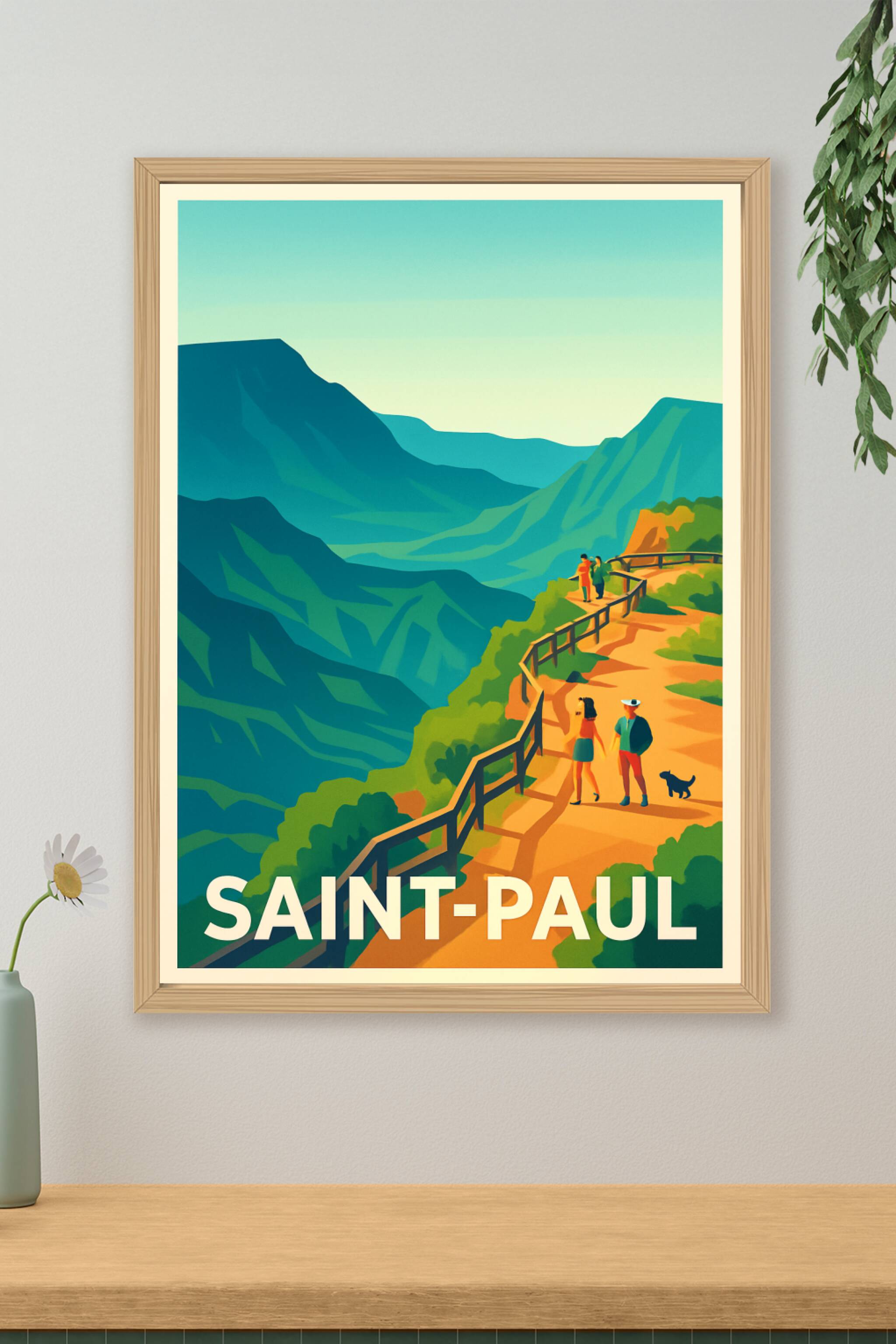 Découvrez la beauté époustouflante de Saint-Paul avec cette affiche illustrée qui capture un sentier de randonnée panoramique bordé de montagnes ma...