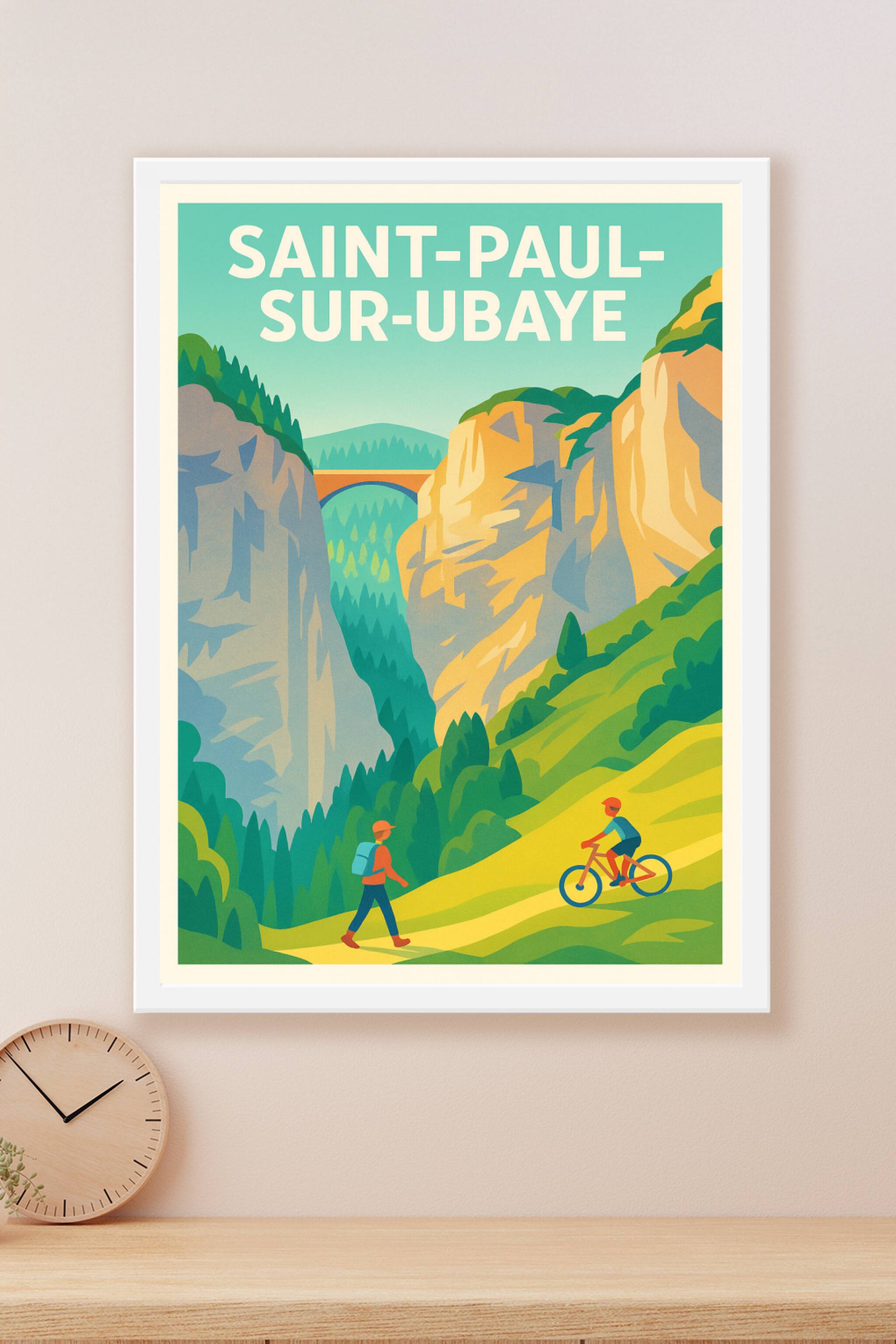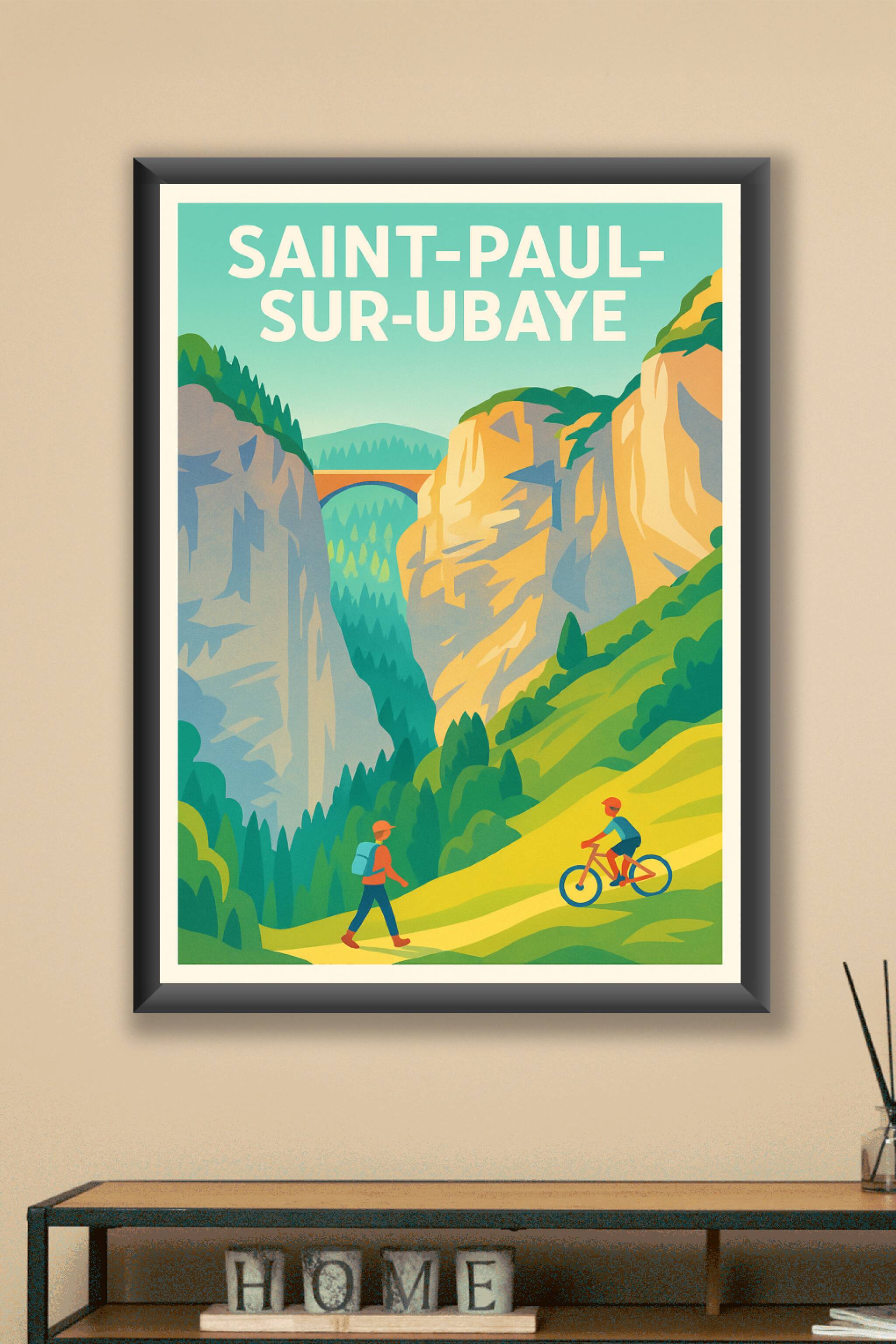 Immergez-vous dans la beauté préservée de Saint-Paul-sur-Ubaye avec cette affiche illustrée mettant en scène les massifs rocheux et la verdure luxuriante de la région. Cette scène de randonnée et de cyclisme capture l’esprit d’aventure et la fraîcheur des paysages alpins. Ce poster est imprimé en tirage "Fine Art" sur un papier de 305g coton, garantissant des couleurs éclatantes et une qualité d’impression exceptionnelle. Disponible en plusieurs formats, du A1 au A4, avec ou sans cadre, il s’adapte parfaitement à votre intérieur pour offrir une touche naturelle et dynamique. Profitez d’une fabrication 100% française pour un souvenir ou une décoration authentique à offrir aux passionnés de voyages et d’activités outdoor.