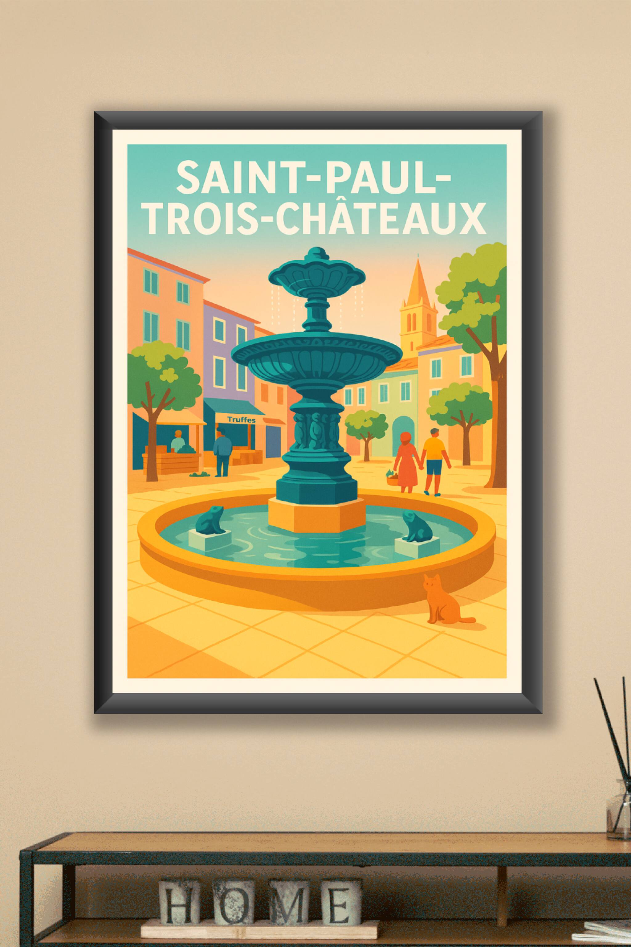 Découvrez l'élégance intemporelle de Saint-Paul-Trois-Châteaux avec cette affiche illustrée mettant en scène la célèbre fontaine centrale de la vil...