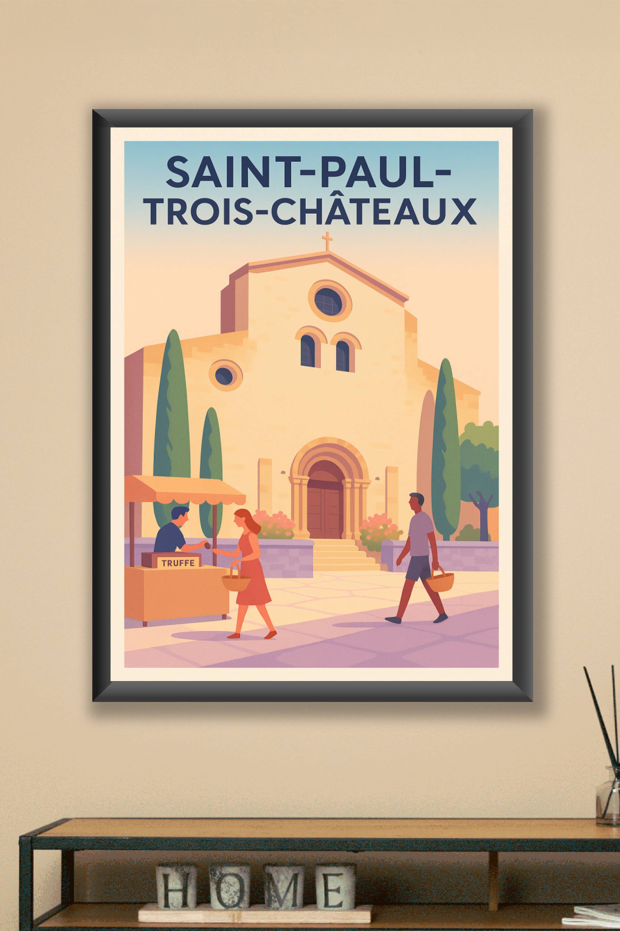 Découvrez l'élégance paisible de Saint-Paul-Trois-Châteaux à travers cette affiche fine art représentant une scène de marché sous la douceur d'une ...