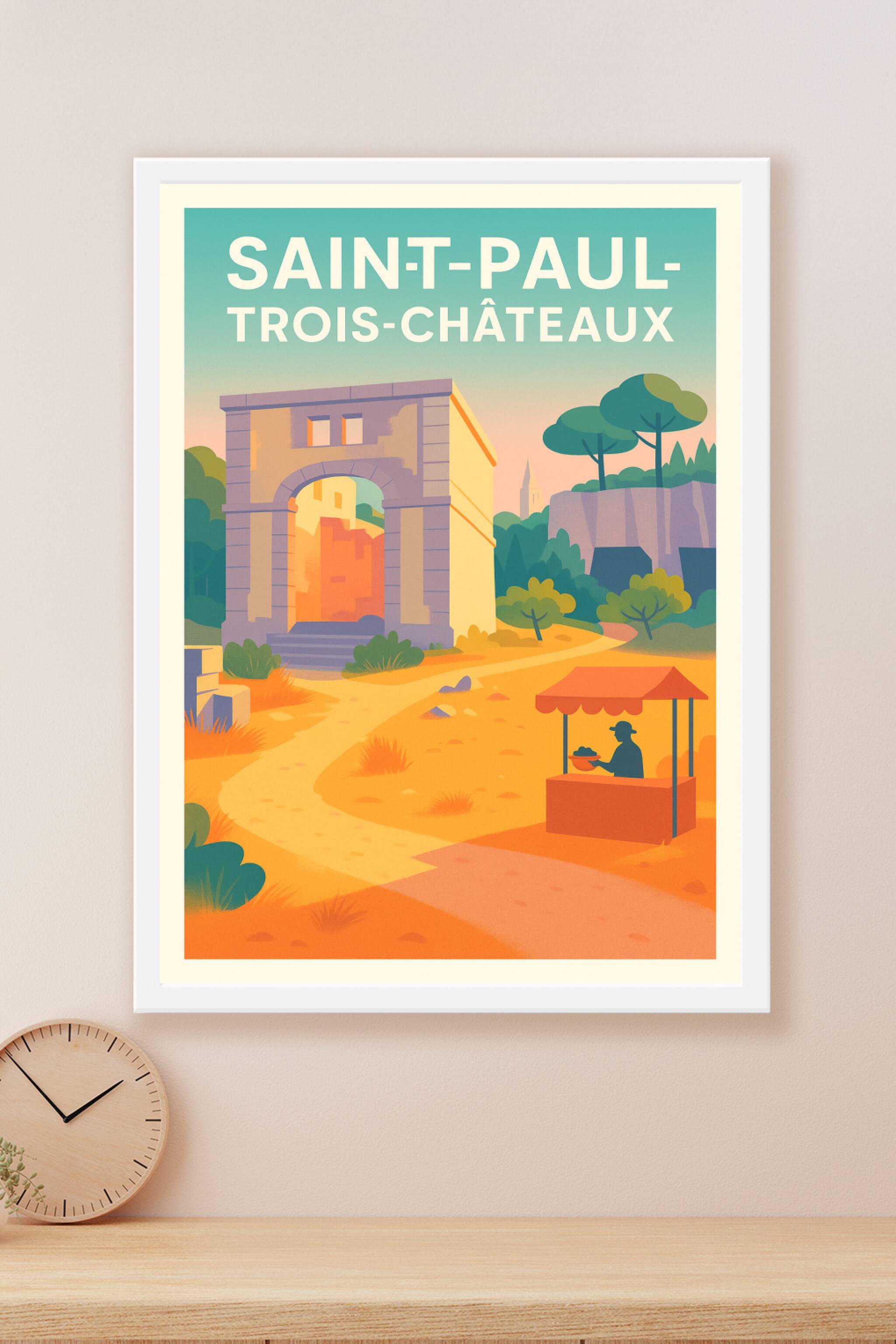 Découvrez l'atmosphère unique de Saint-Paul-Trois-Châteaux avec cette affiche illustrée au style vintage chaleureux. Ce poster met en valeur les ve...