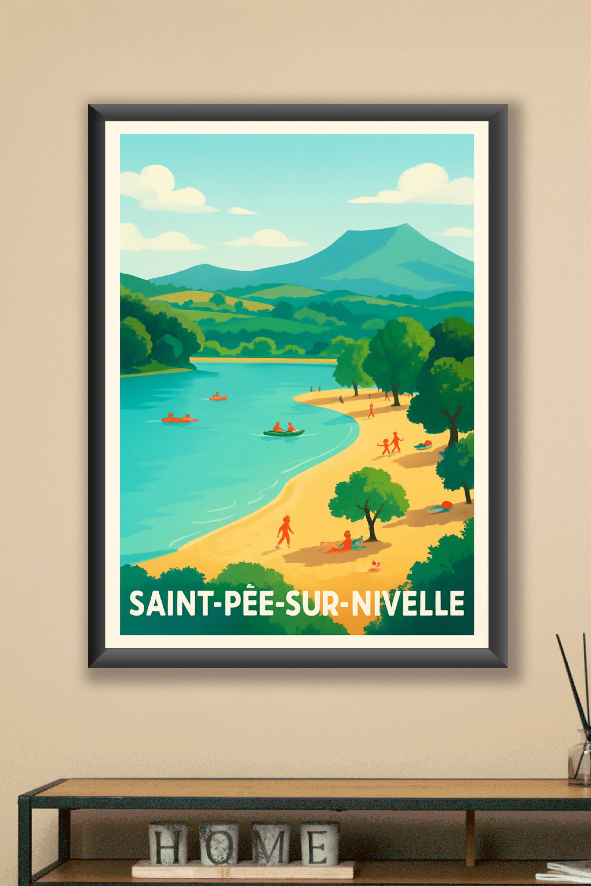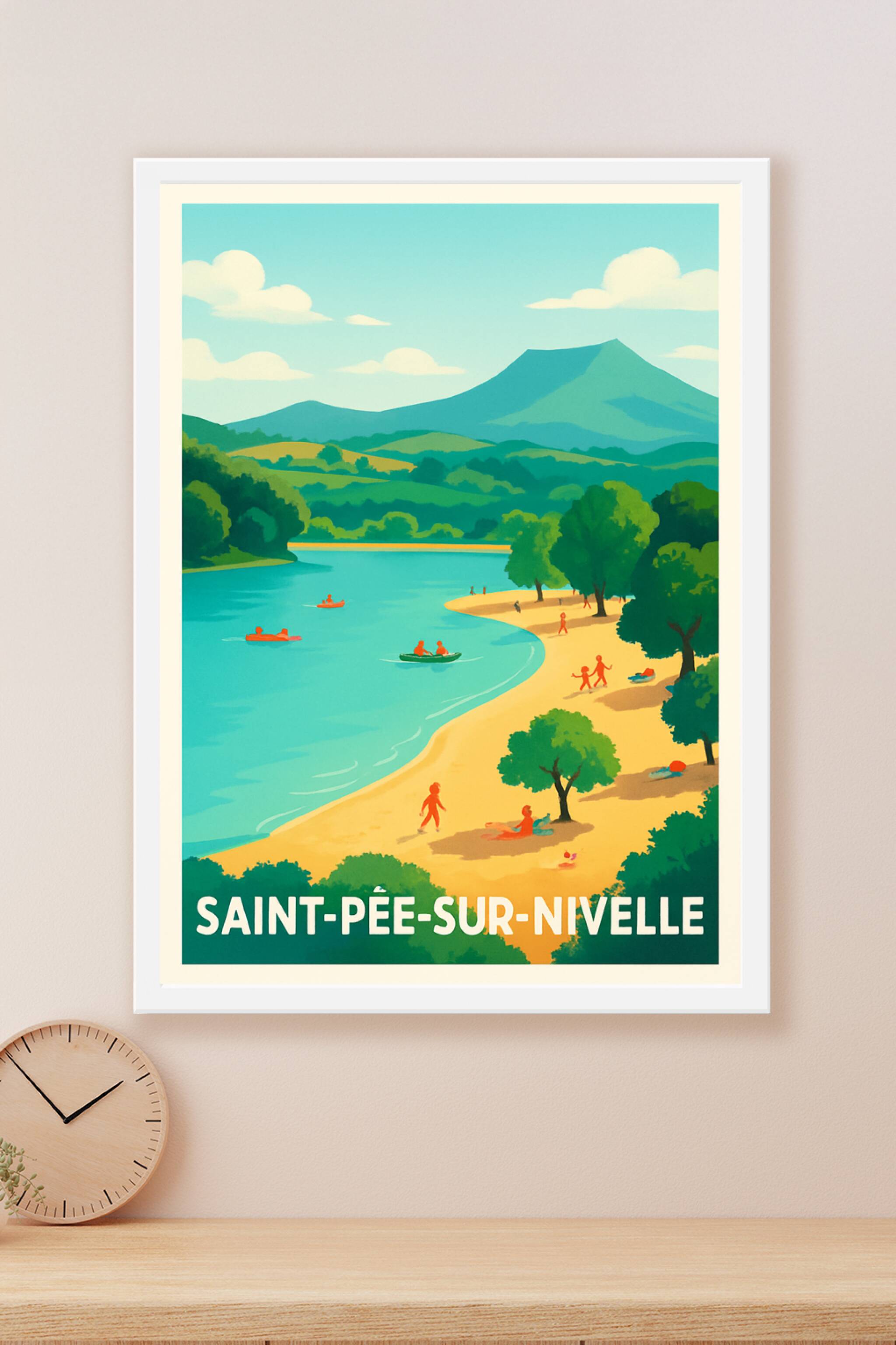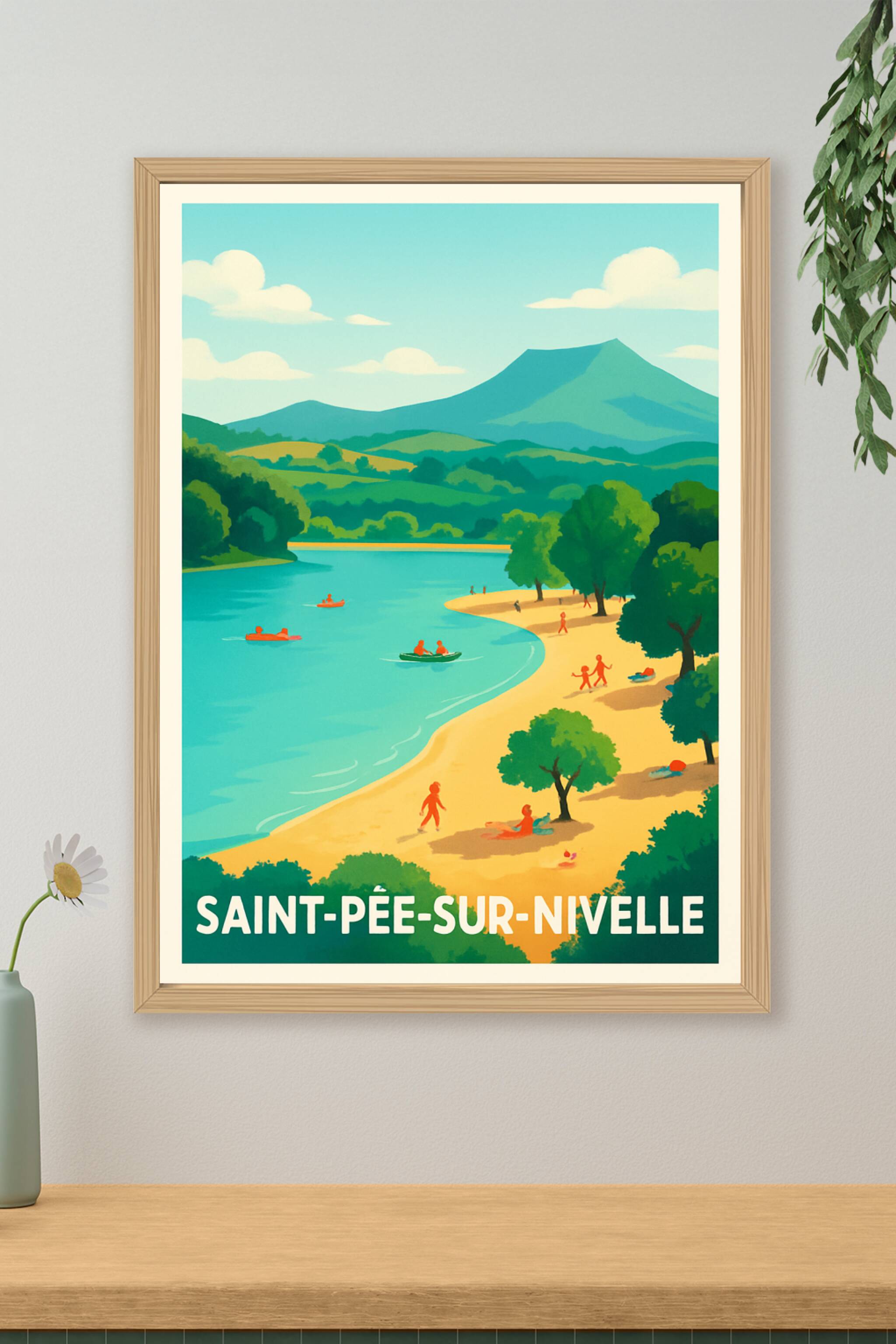 Découvrez la quiétude et la beauté authentique de Saint-Pée-sur-Nivelle avec cette affiche illustrée au style vibrant et lumineux. Ce poster met en scène une plage paisible où les familles et amateurs de loisirs nautiques profitent d’un cadre naturel enchanteur, avec montagnes et forêts en toile de fond. Imprimée en tirage "Fine Art" sur papier 305g coton, cette affiche garantit une qualité d'impression exceptionnelle, aux couleurs profondes et durables. Disponible en formats A1 à A4, avec ou sans cadre, ce poster est idéal pour sublimer votre décoration intérieure ou offrir un souvenir unique des paysages basques. Profitez d'une fabrication 100% française pour une qualité premium à accrocher chez vous.