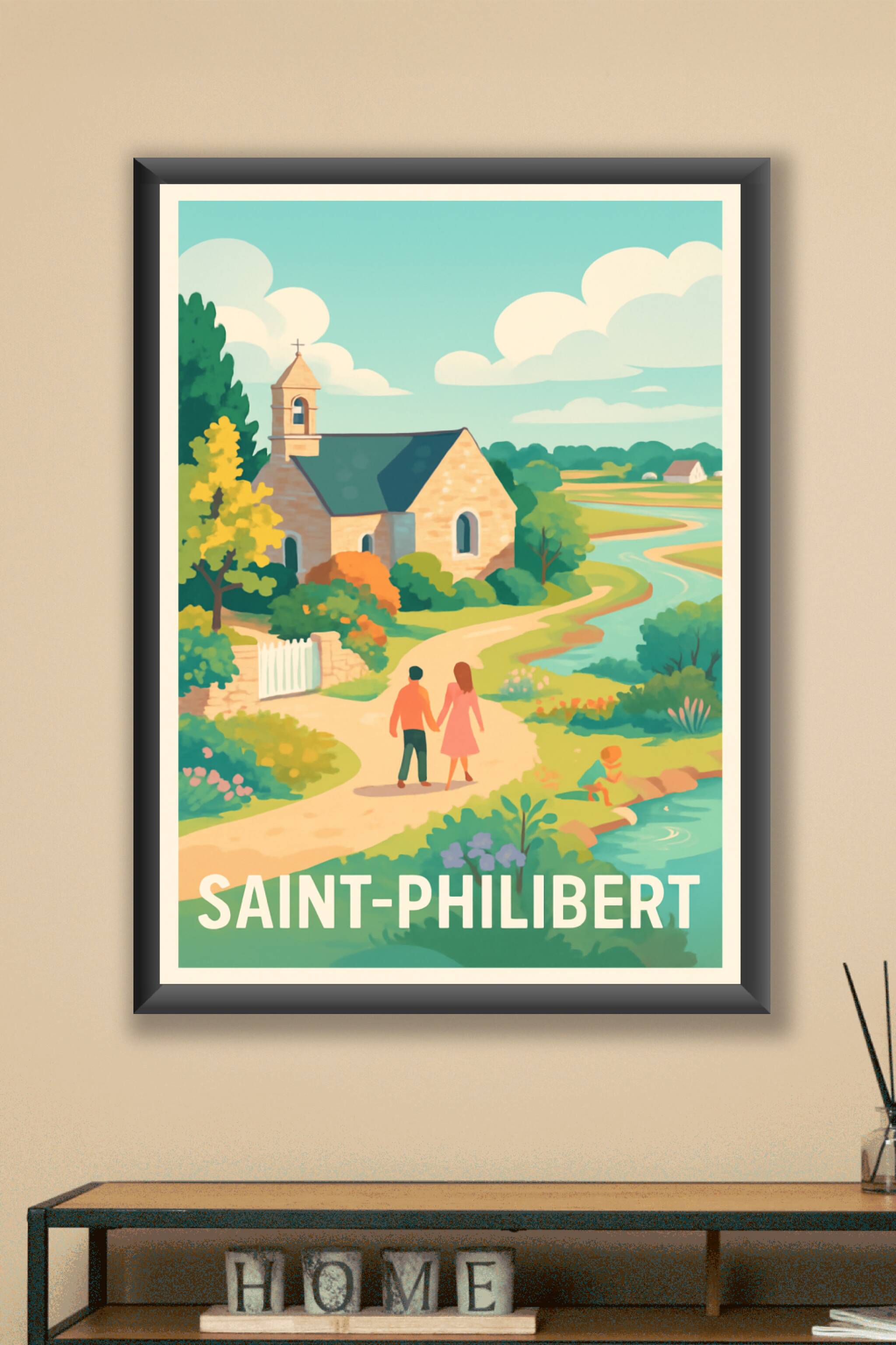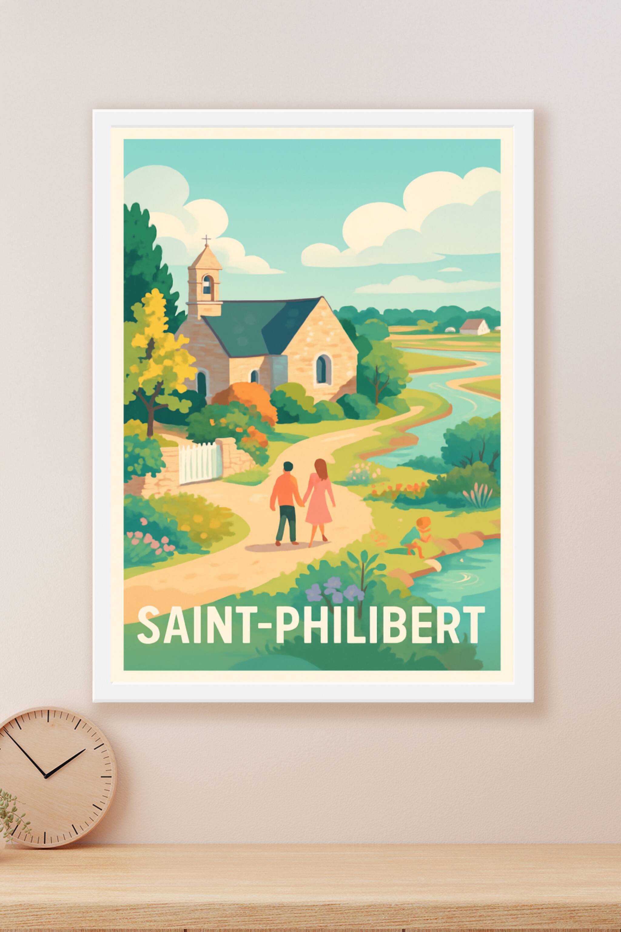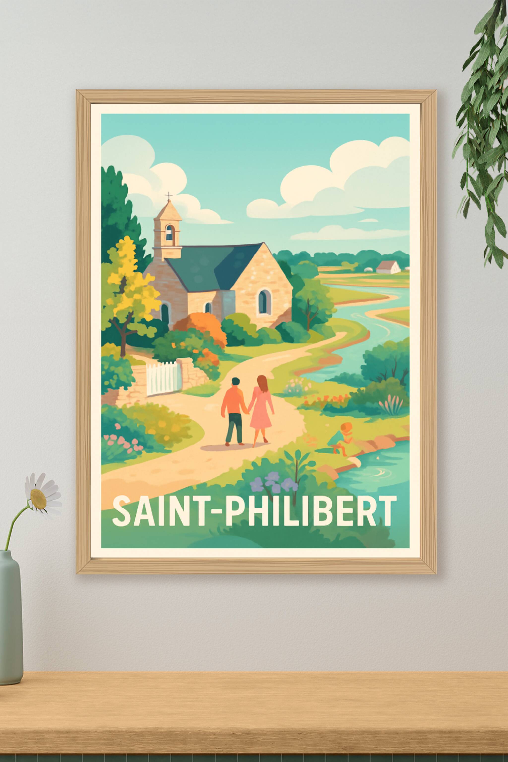 Découvrez la douceur de vivre à Saint-Philibert grâce à cette affiche illustrée représentant une paisible promenade dans un décor champêtre et fleu...