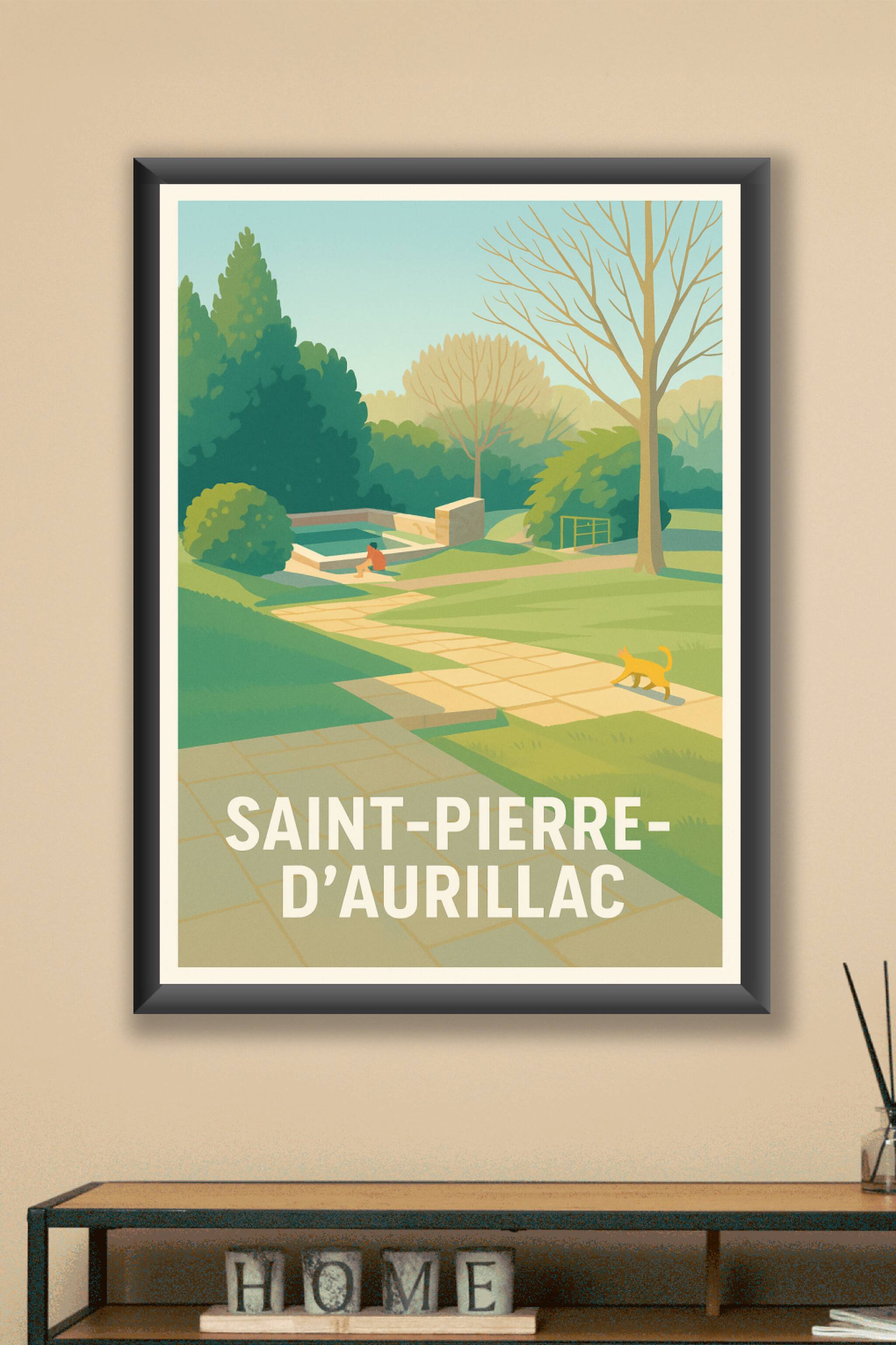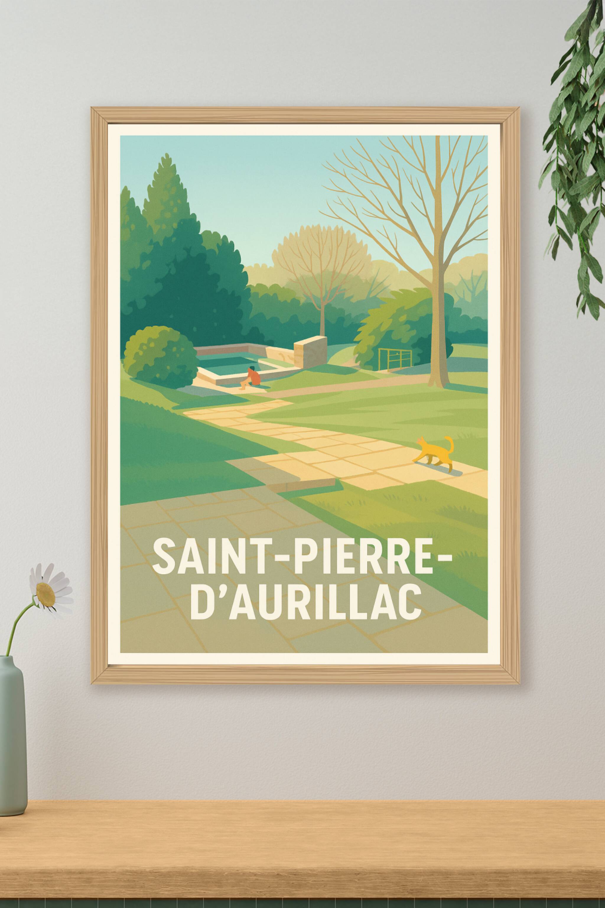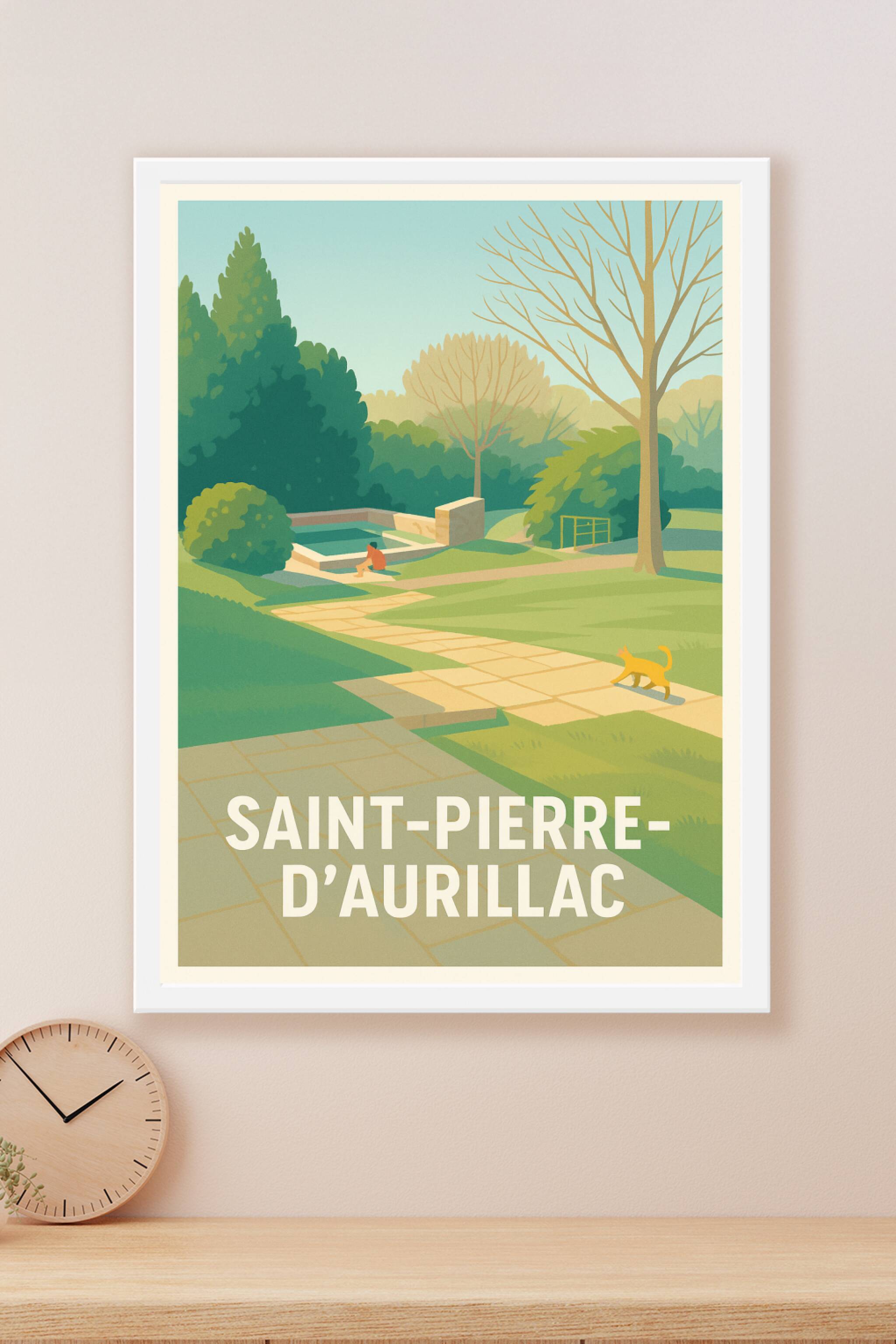 Découvrez la sérénité de Saint-Pierre-d'Aurillac avec cette affiche au style épuré et harmonieux, mettant en scène un jardin paisible baigné de lum...