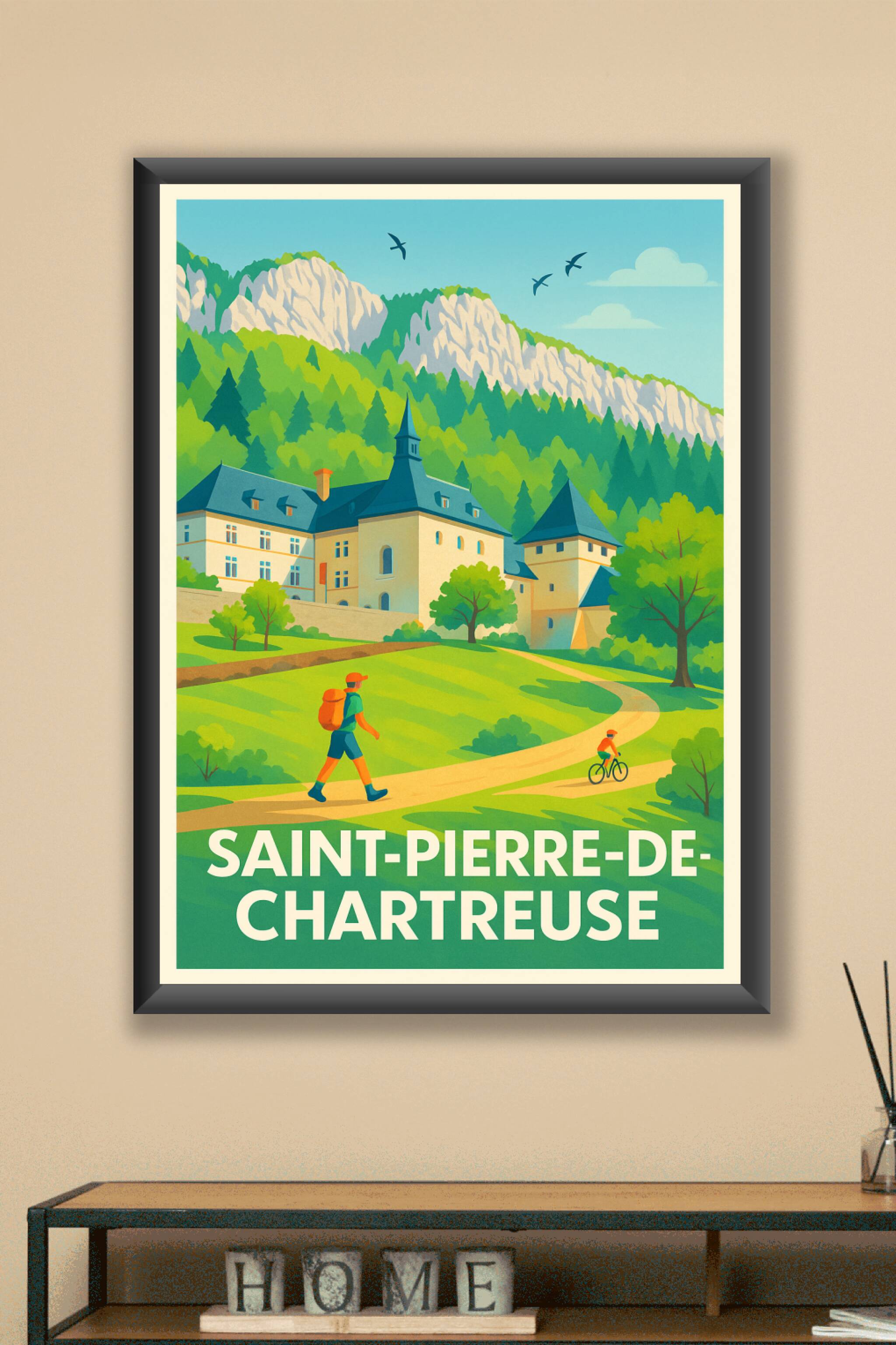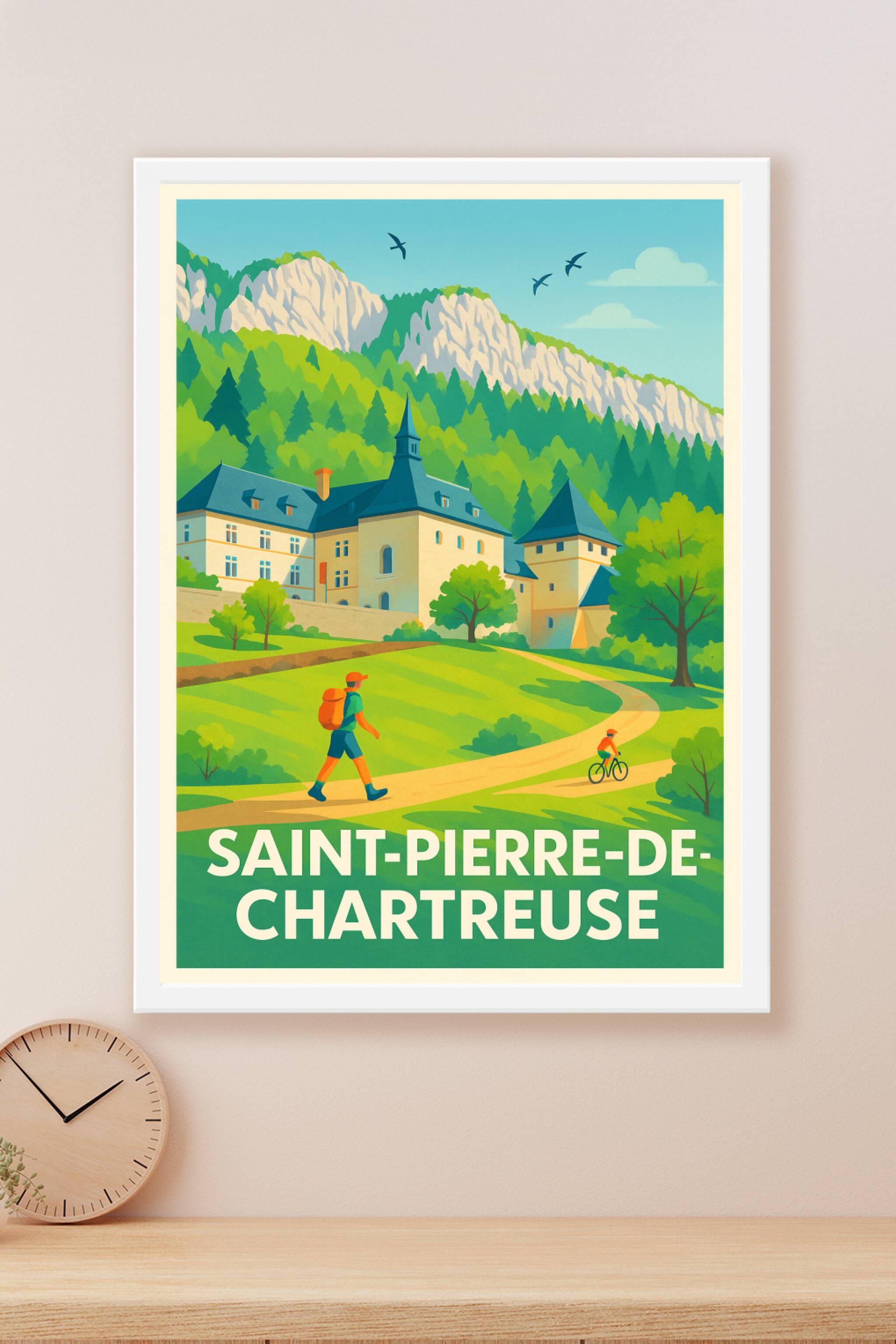 Découvrez l'ambiance paisible et verdoyante de Saint-Pierre-de-Chartreuse à travers cette affiche illustrée au style rétro-vintage. La sérénité du ...