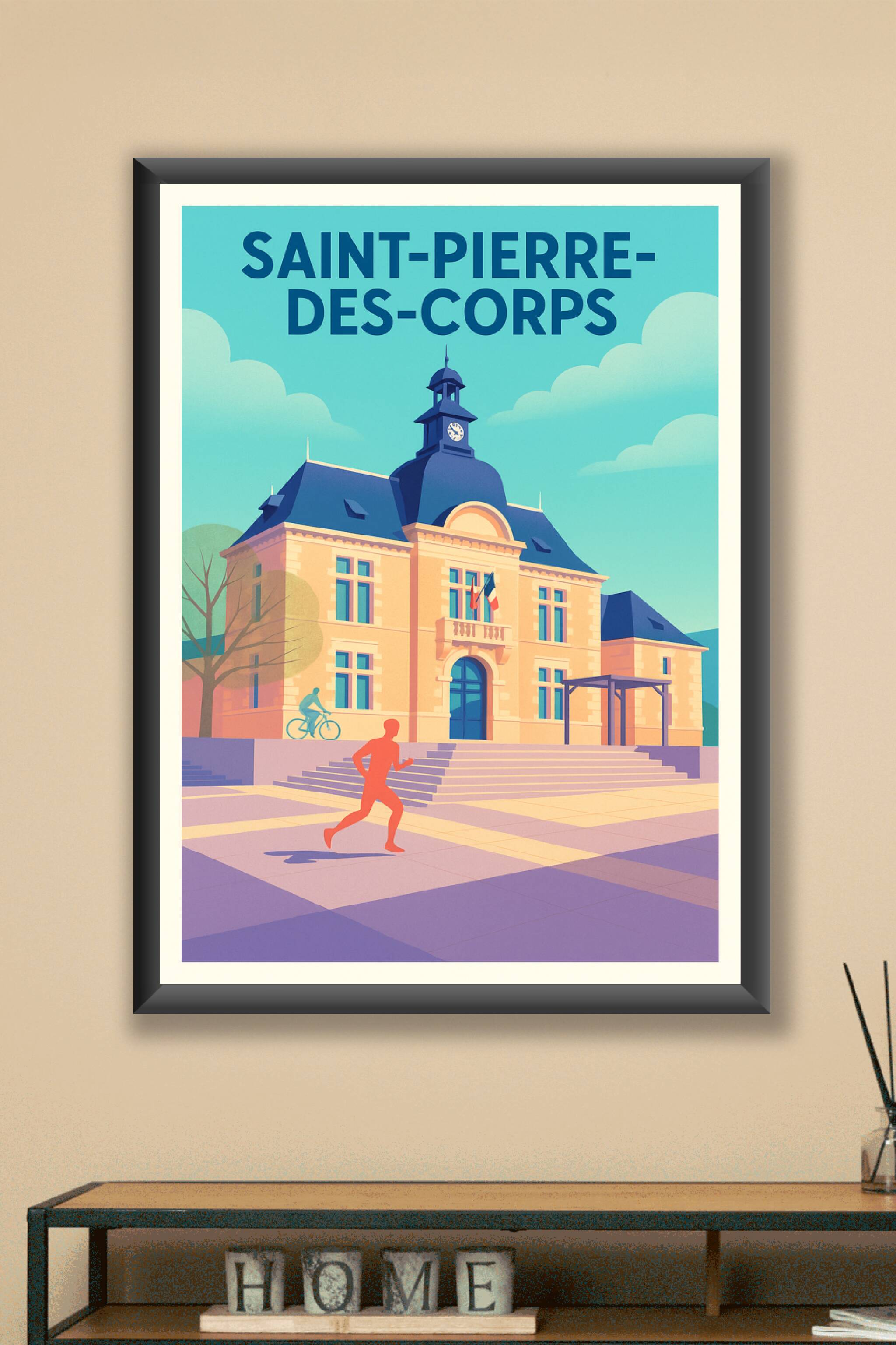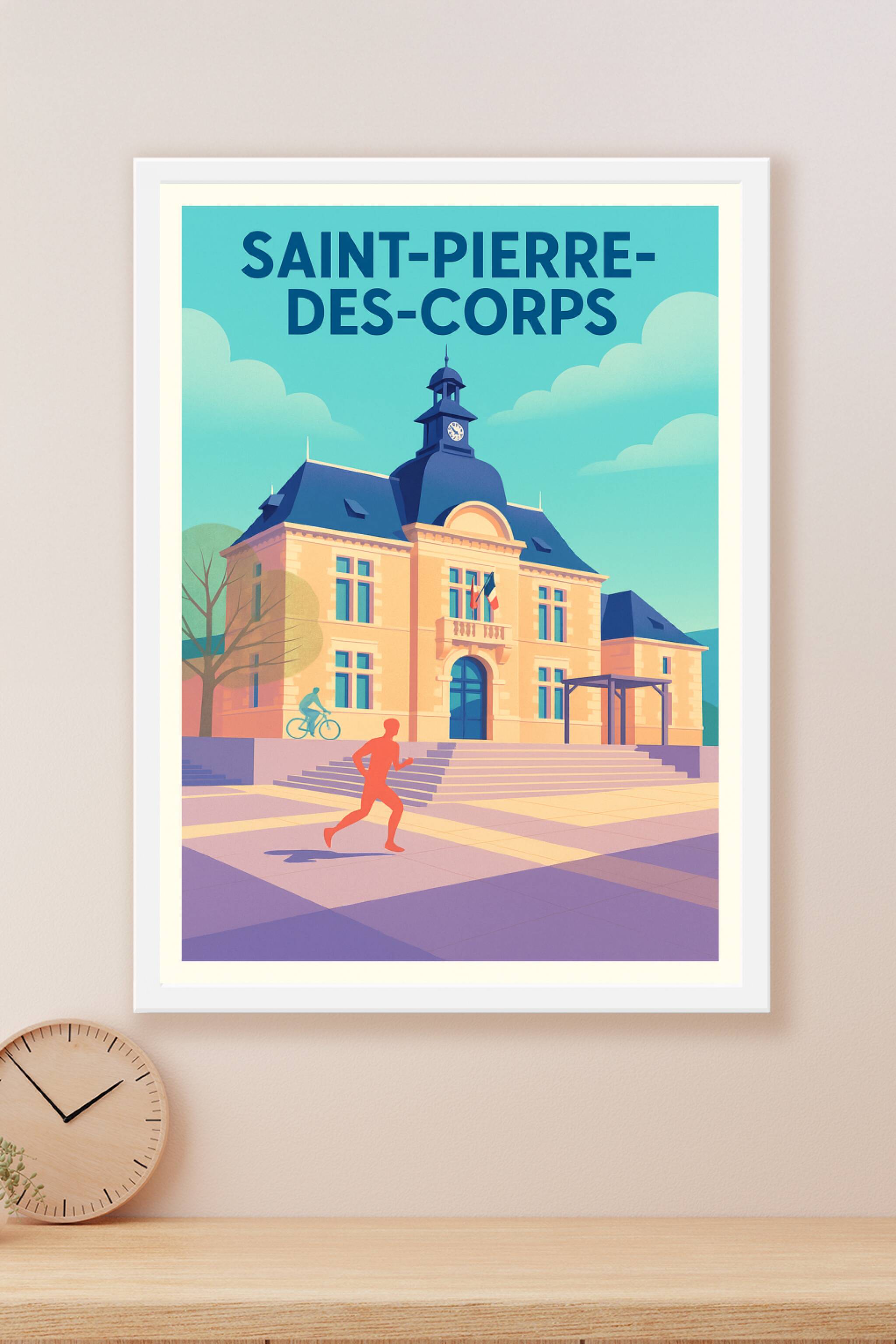 Découvrez cette affiche représentant la mairie emblématique de Saint-Pierre-des-Corps, baignée par une lumière douce et dynamique où un coureur et ...