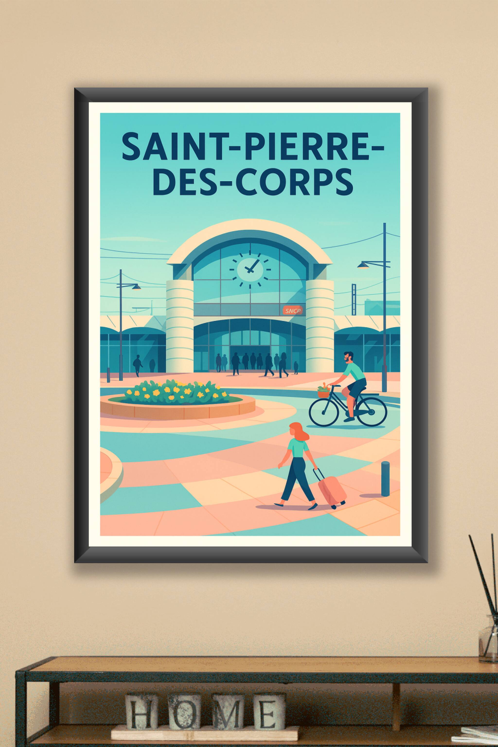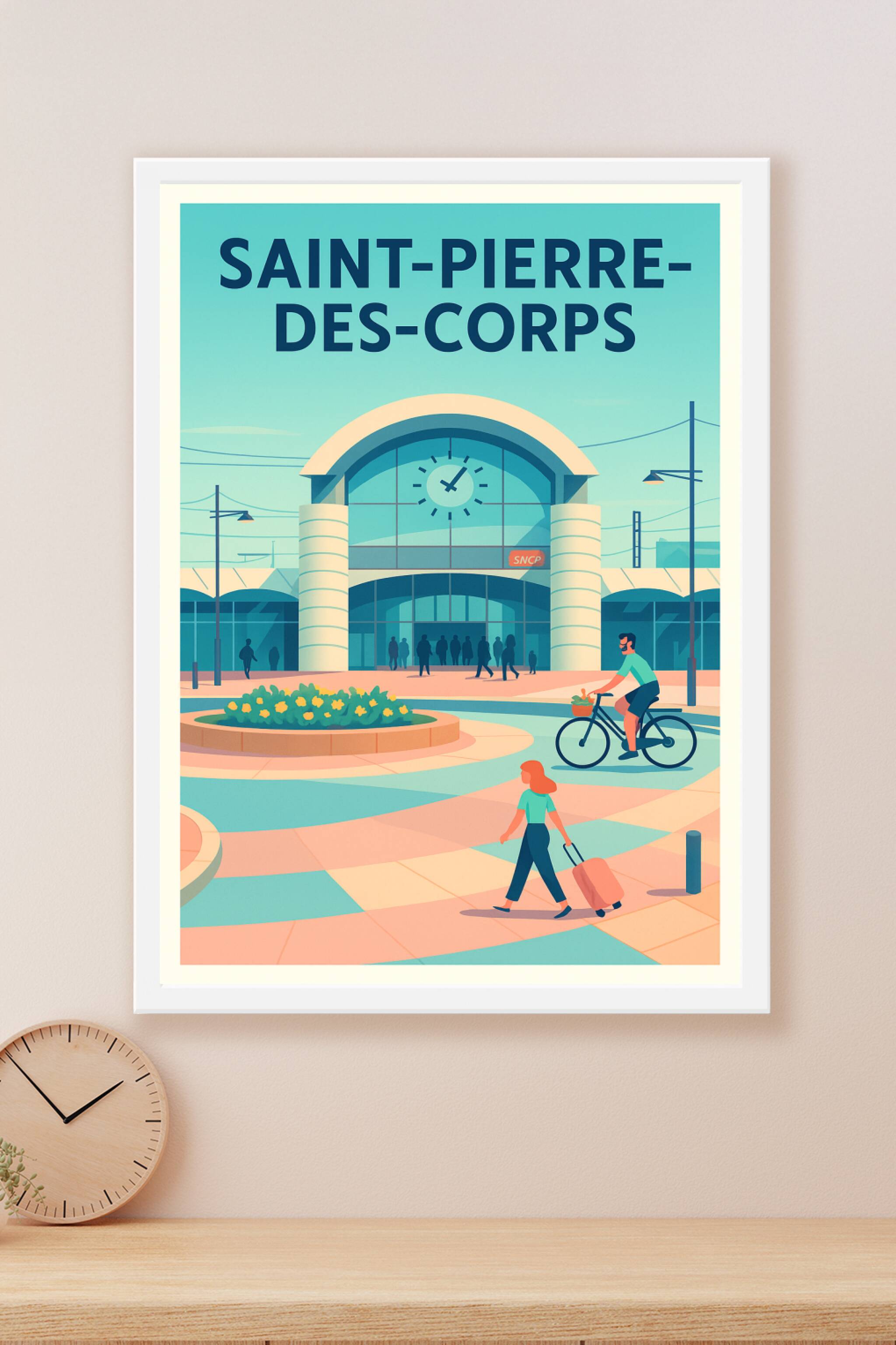 Découvrez cette affiche inspirante qui met en lumière la gare de Saint-Pierre-des-Corps, un lieu emblématique où se croisent voyageurs et locaux da...