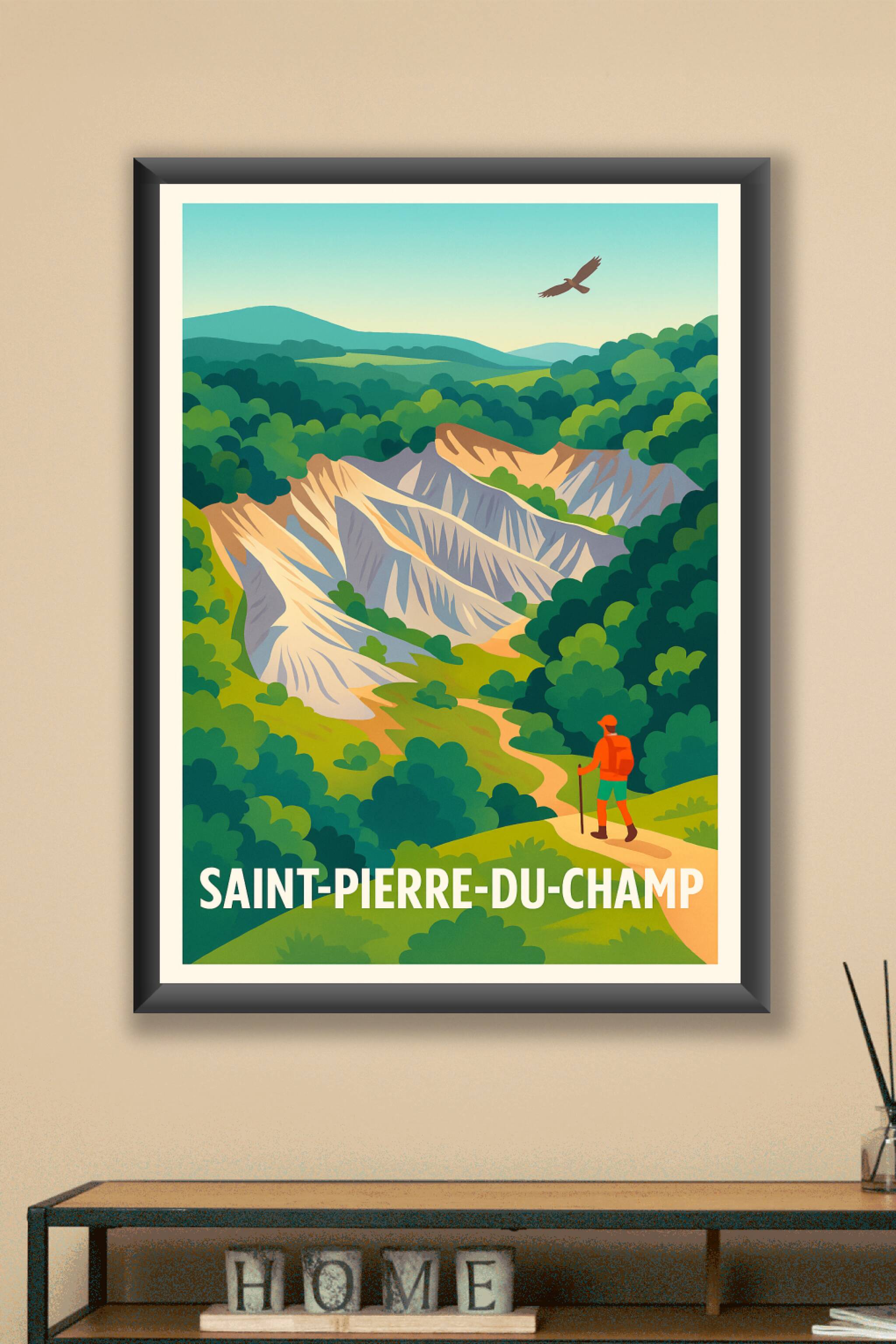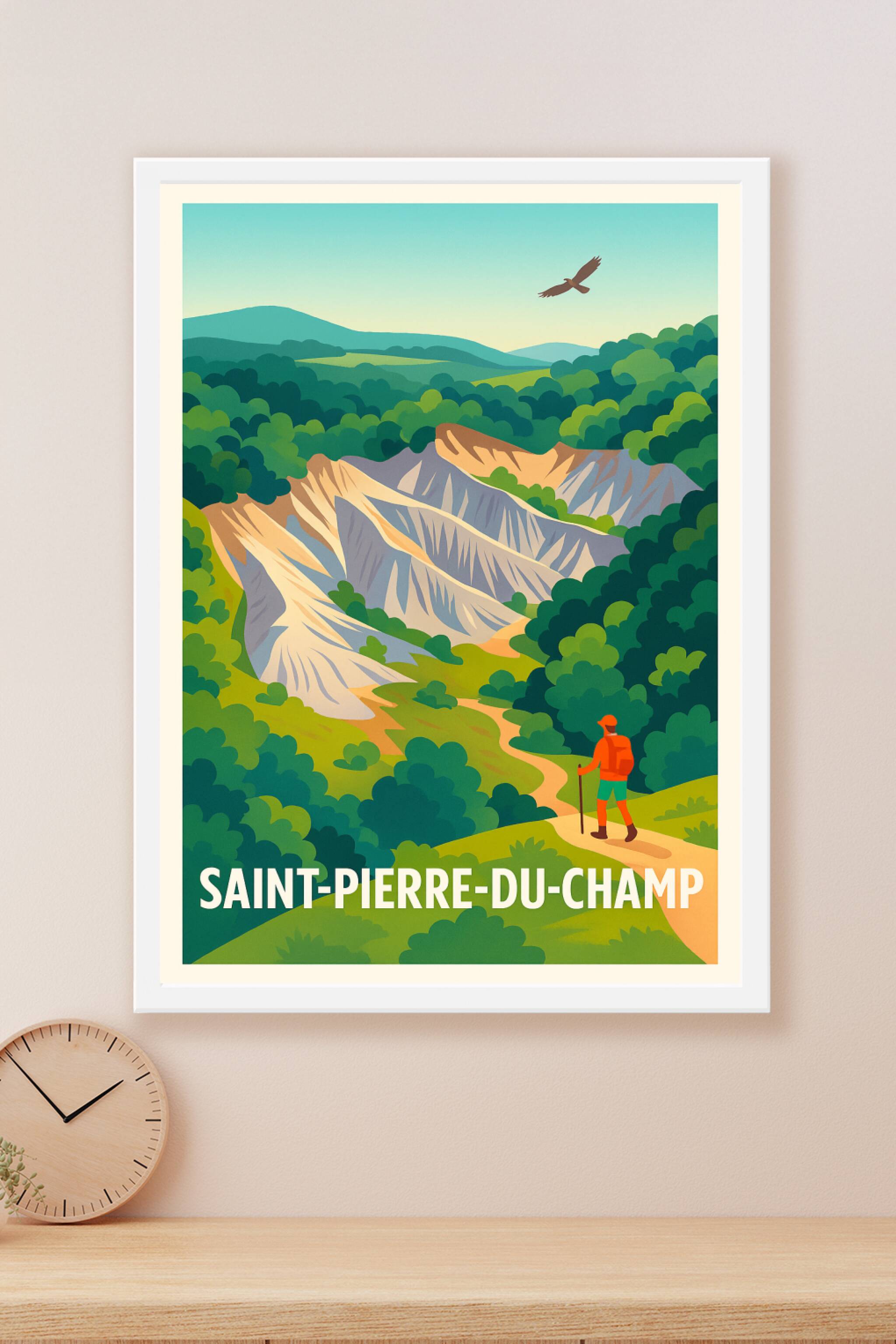 Découvrez la beauté sauvage de Saint-Pierre-du-Champ avec cette affiche au style vintage et coloré. Ce poster illustre un paysage naturel majestueu...