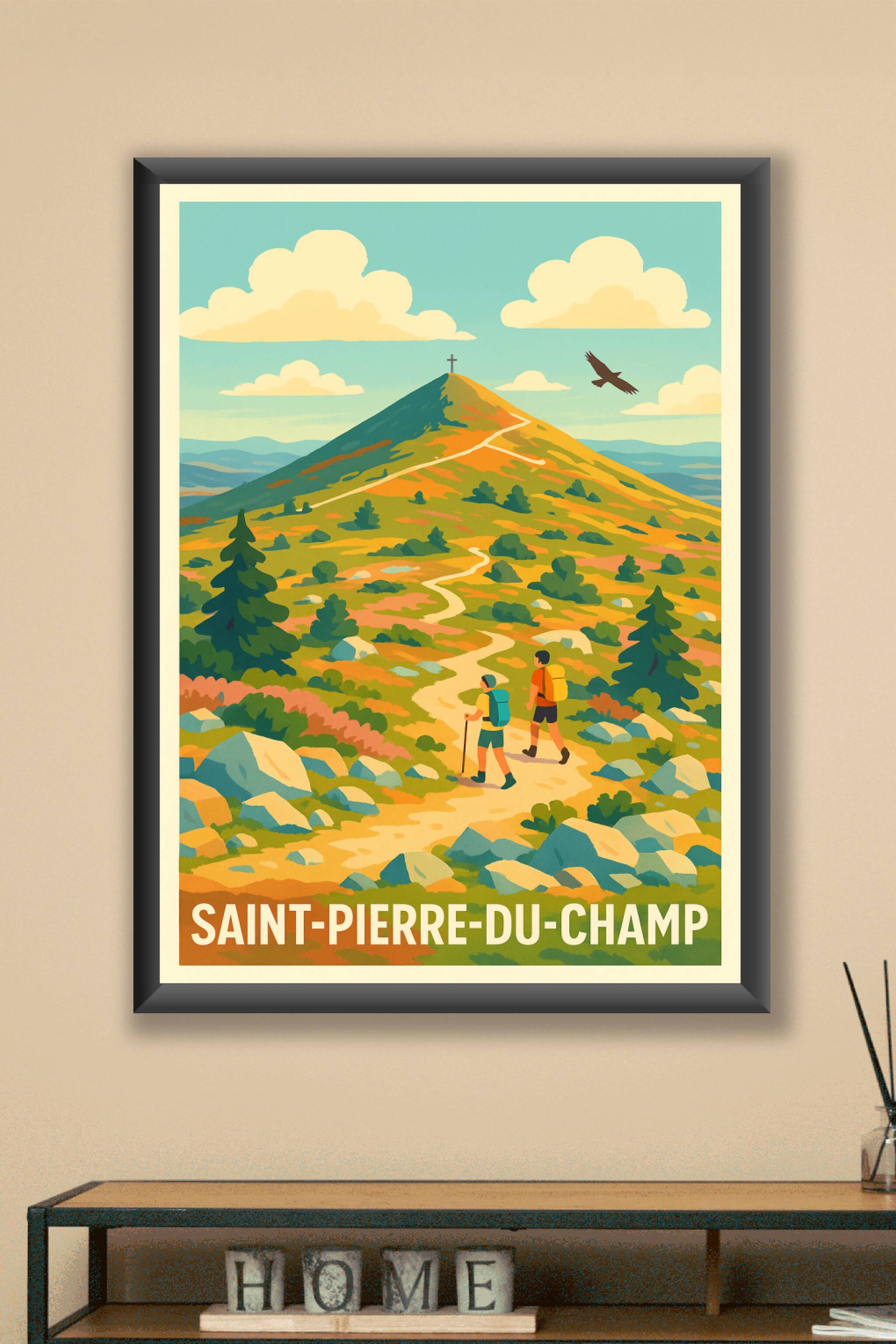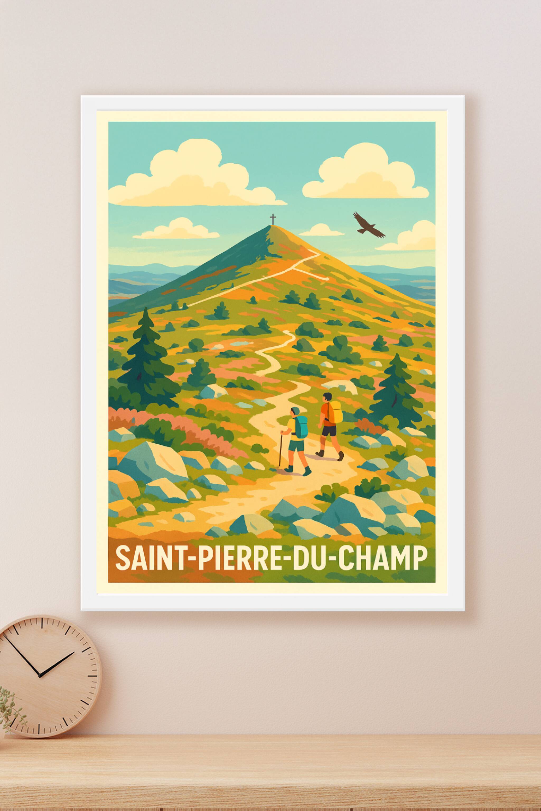 Découvrez la beauté naturelle de Saint-Pierre-du-Champ avec cette affiche illustrée aux couleurs chaleureuses et apaisantes. Le poster met en scène une randonnée en pleine nature, avec le célèbre sommet surplombé d'une croix, un paysage idéal pour les amoureux de montagnes et de grandes balades.Ce poster est disponible en tirage "Fine Art", imprimé sur un papier 305g coton qui garantit une qualité d'impression nette et durable. Vous pouvez choisir parmi plusieurs formats allant de A1 à A4, avec ou sans cadre, pour parfaitement intégrer cette affiche à votre décoration intérieure.Fabriquée en France avec soin, cette affiche apportera une touche d'évasion et de sérénité à votre intérieur ou fera un cadeau parfait pour les passionnés de paysages authentiques.