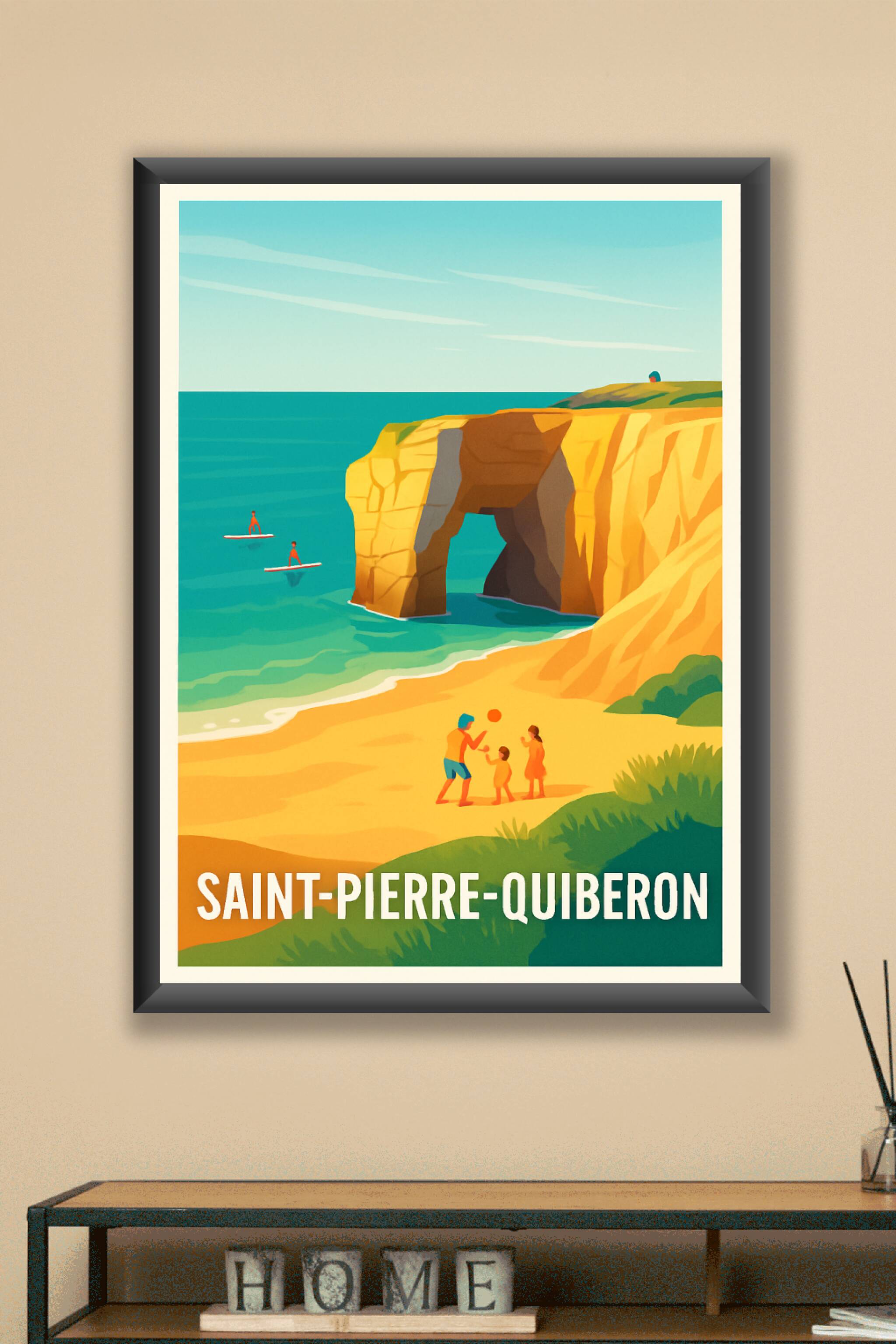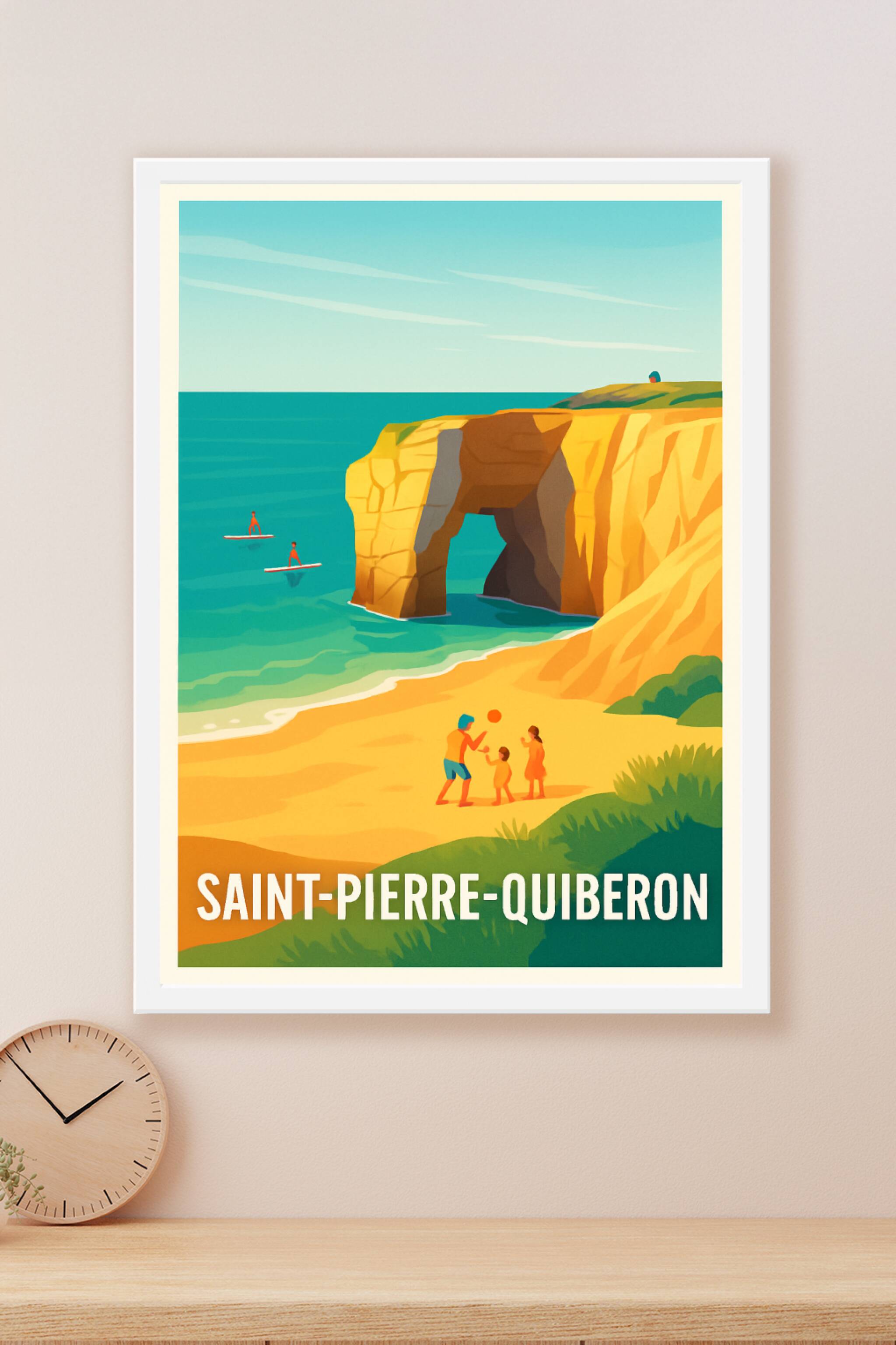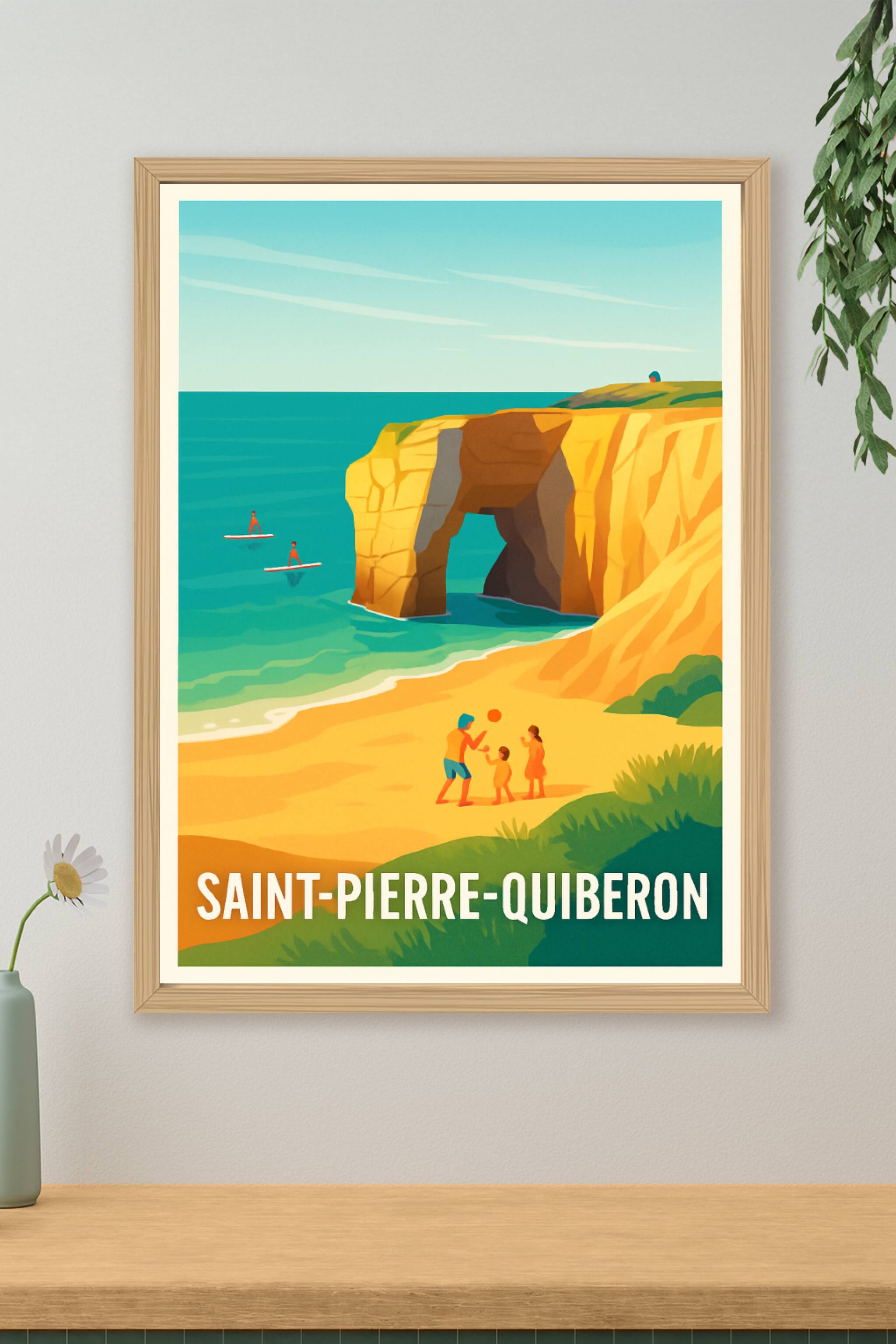 Découvrez la beauté sauvage et apaisante de Saint-Pierre-Quiberon avec cette affiche illustrée aux couleurs vives et chaudes. Le poster met en scène une arche rocheuse emblématique surplombant une plage dorée où une famille profite des joies simples au bord de l'eau, tandis que deux paddleurs glissent doucement sur l'océan. Imprimé en tirage "Fine Art" sur papier 305g coton, ce poster garantit une qualité d'impression exceptionnelle et durable. Disponible en formats A1 à A4, avec ou sans cadre, cette affiche apportera à votre intérieur une touche d'évasion et de sérénité, parfaite pour les amoureux de la mer et des paysages naturels. Profitez d'une impression premium 100% fabriquée en France pour sublimer votre décoration ou offrir un cadeau raffiné et inspirant.