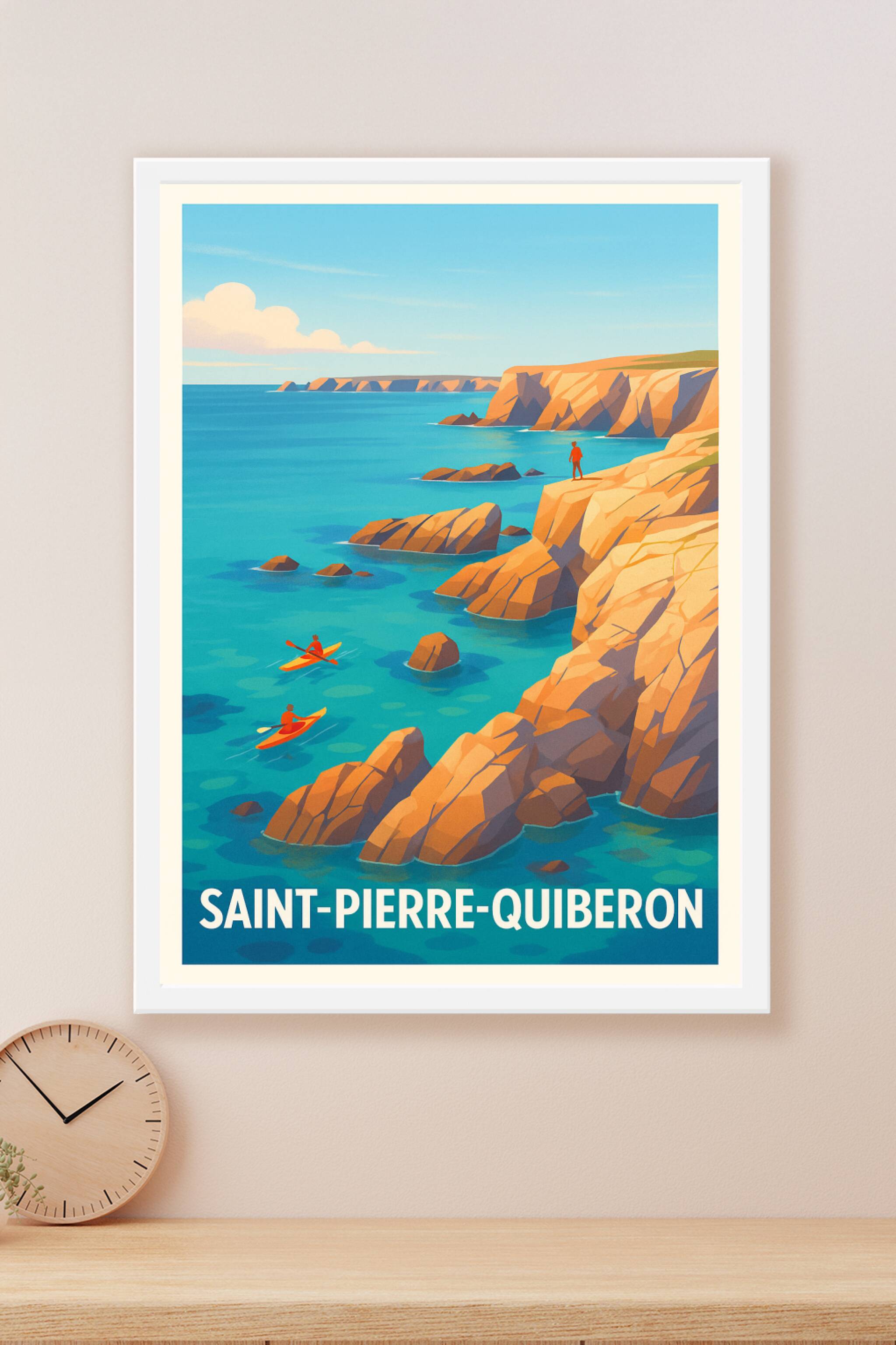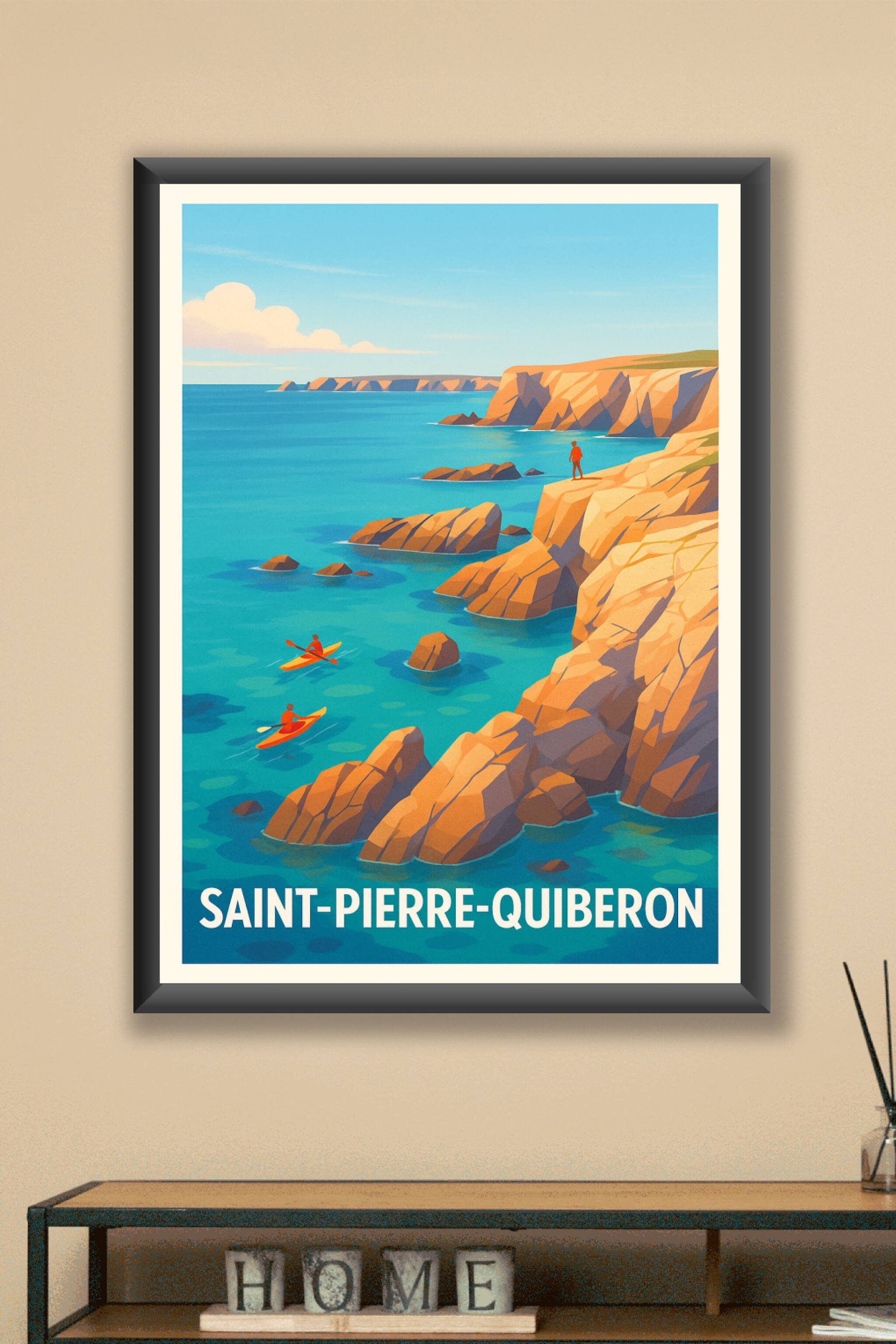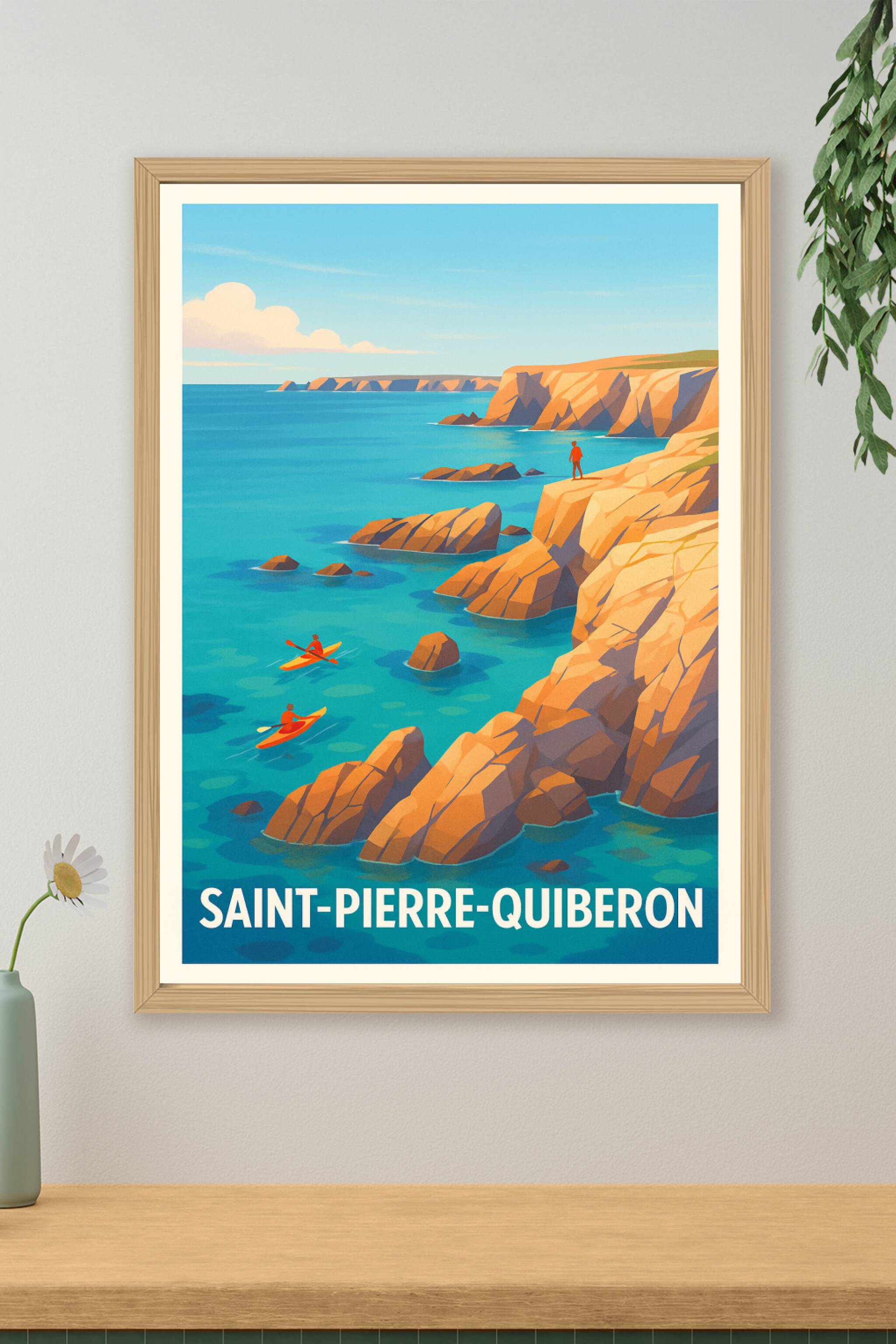 Découvrez la beauté saisissante de Saint-Pierre-Quiberon avec cette affiche illustrée mettant en scène ses falaises rocheuses baignées par les eaux...