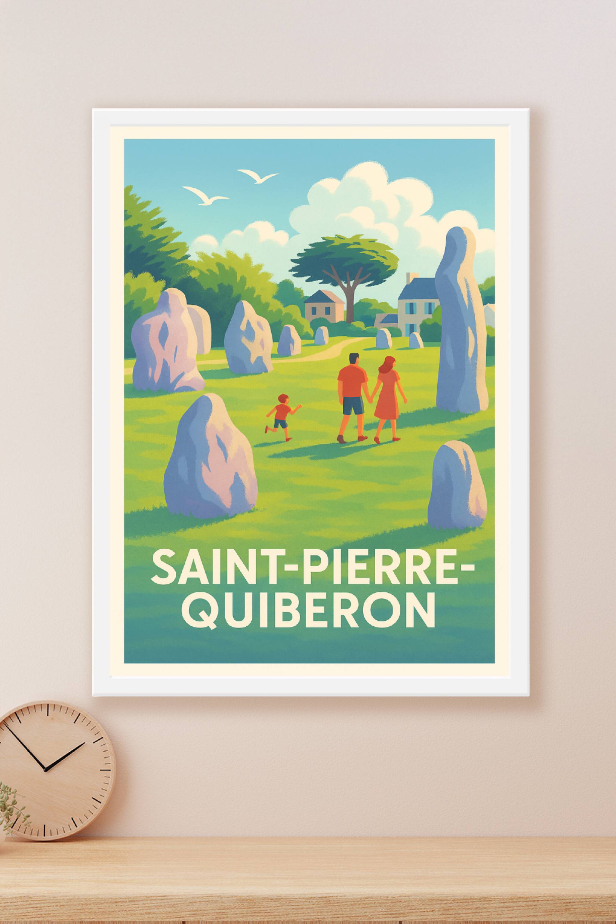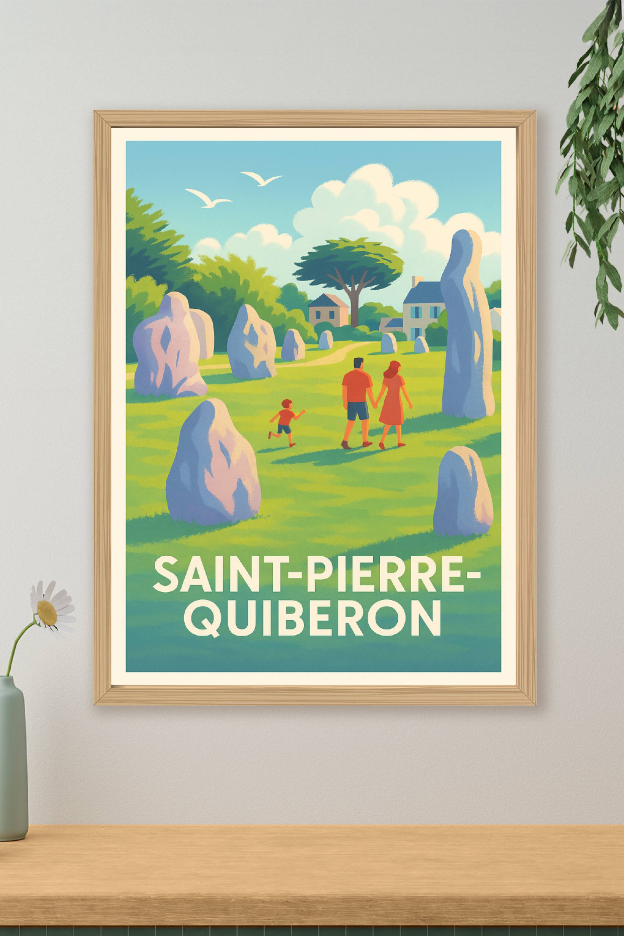 Découvrez la beauté intemporelle de Saint-Pierre-Quiberon avec cette affiche illustrée mettant en scène les célèbres alignements de menhirs sous un ciel lumineux. Ce poster évoque une balade en famille au milieu de pierres mystérieuses, dans un décor champêtre et apaisant. Imprimée en tirage "Fine Art" sur un papier 305g coton de grande qualité, cette affiche offre des couleurs éclatantes et une finition premium. Disponible en formats A1 à A4, avec ou sans cadre, ce poster est idéal pour sublimer votre décoration intérieure ou offrir un souvenir unique et raffiné des richesses bretonnes.
