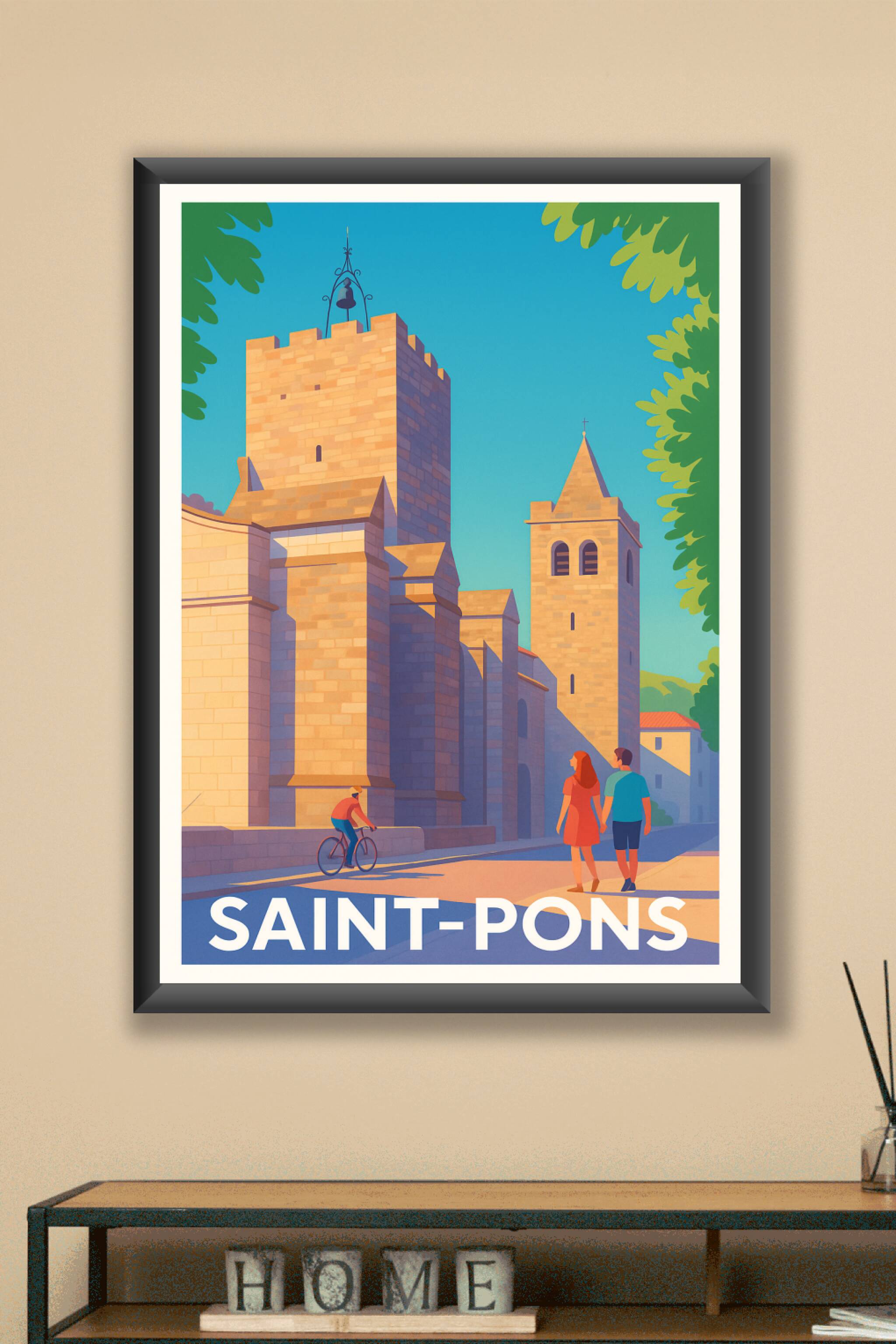 Découvrez l'élégance architecturale de Saint-Pons avec cette affiche illustrée capturant la lumière chaleureuse de ses pierres anciennes sous un ci...