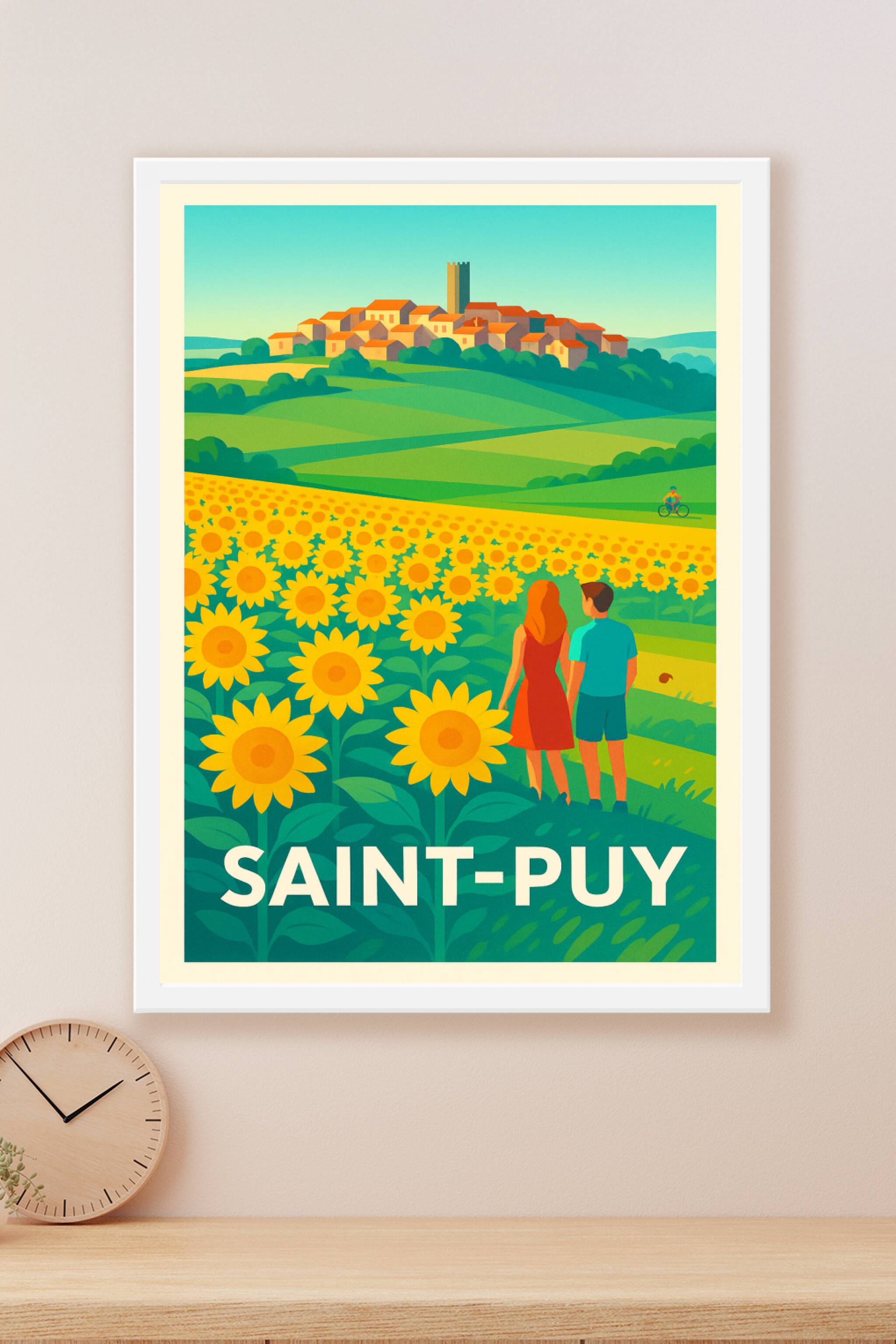 Découvrez la beauté paisible de Saint-Puy à travers cette affiche illustrée aux couleurs chaleureuses et lumineuses. Plongez dans un paysage champê...
