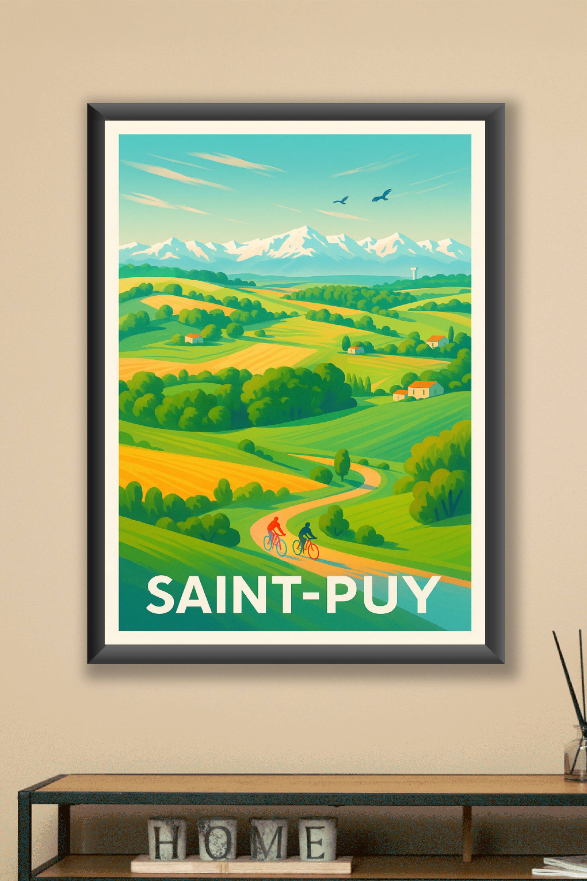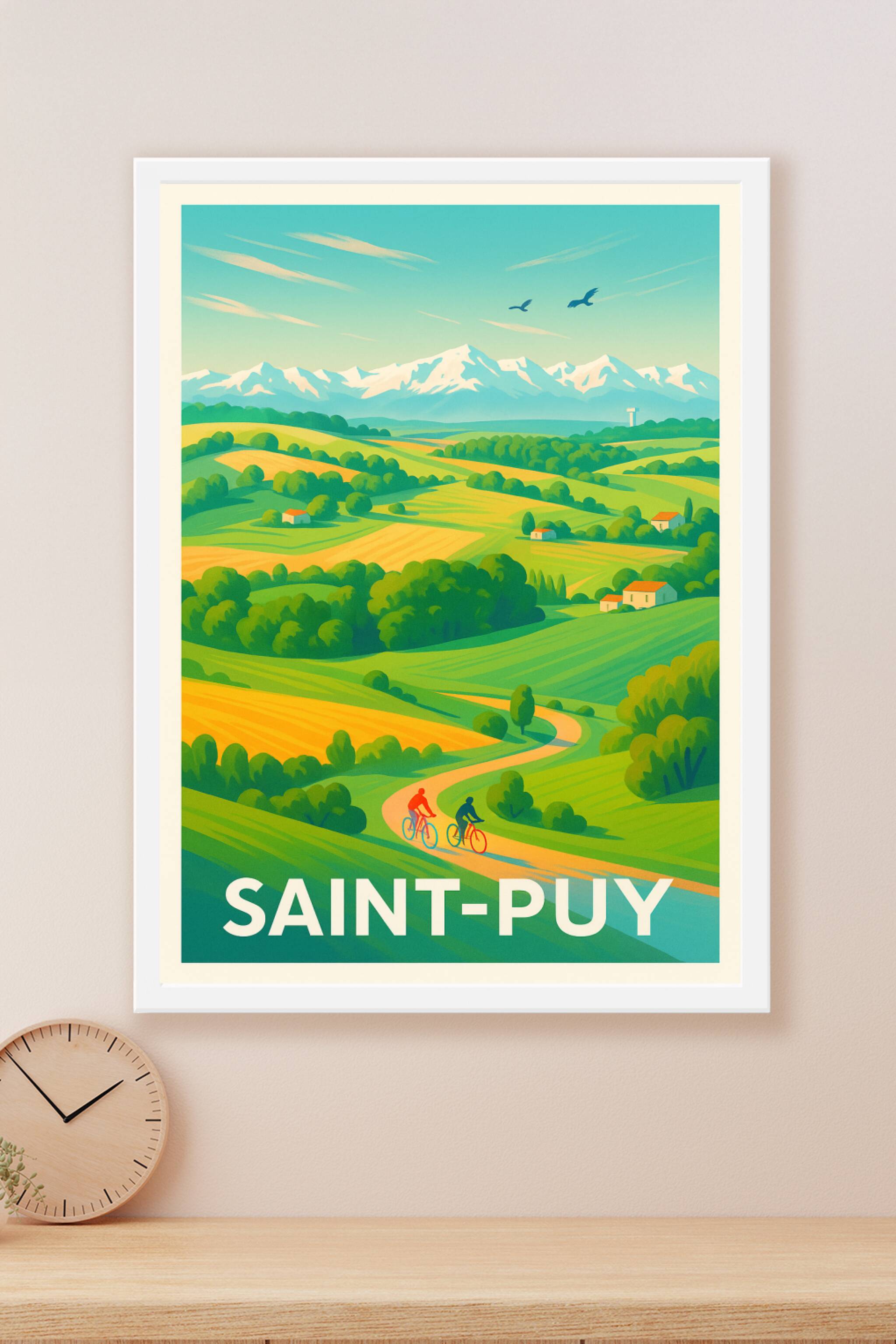 Découvrez la sérénité des paysages vallonnés de Saint-Puy avec cette affiche illustrée aux couleurs vibrantes et au style rétro. Deux cyclistes par...