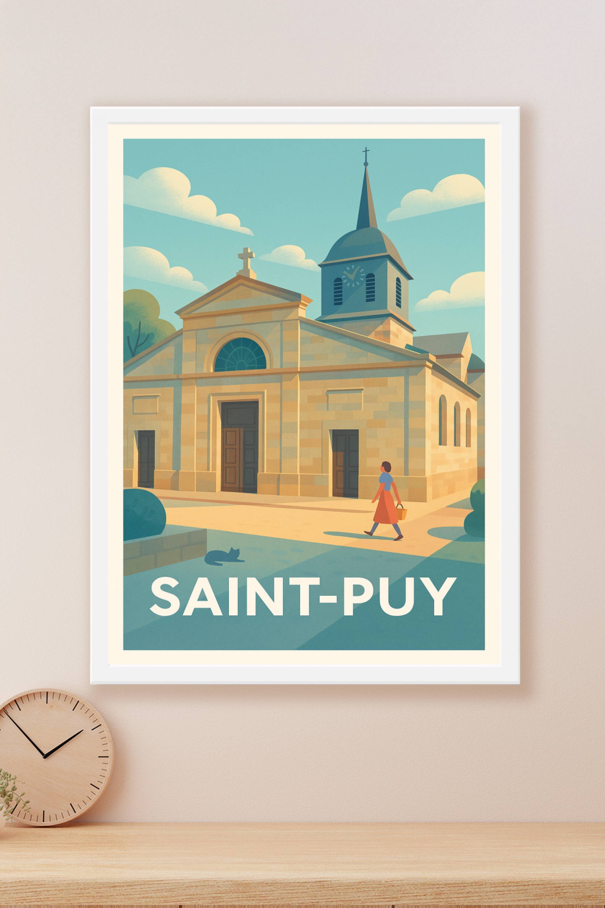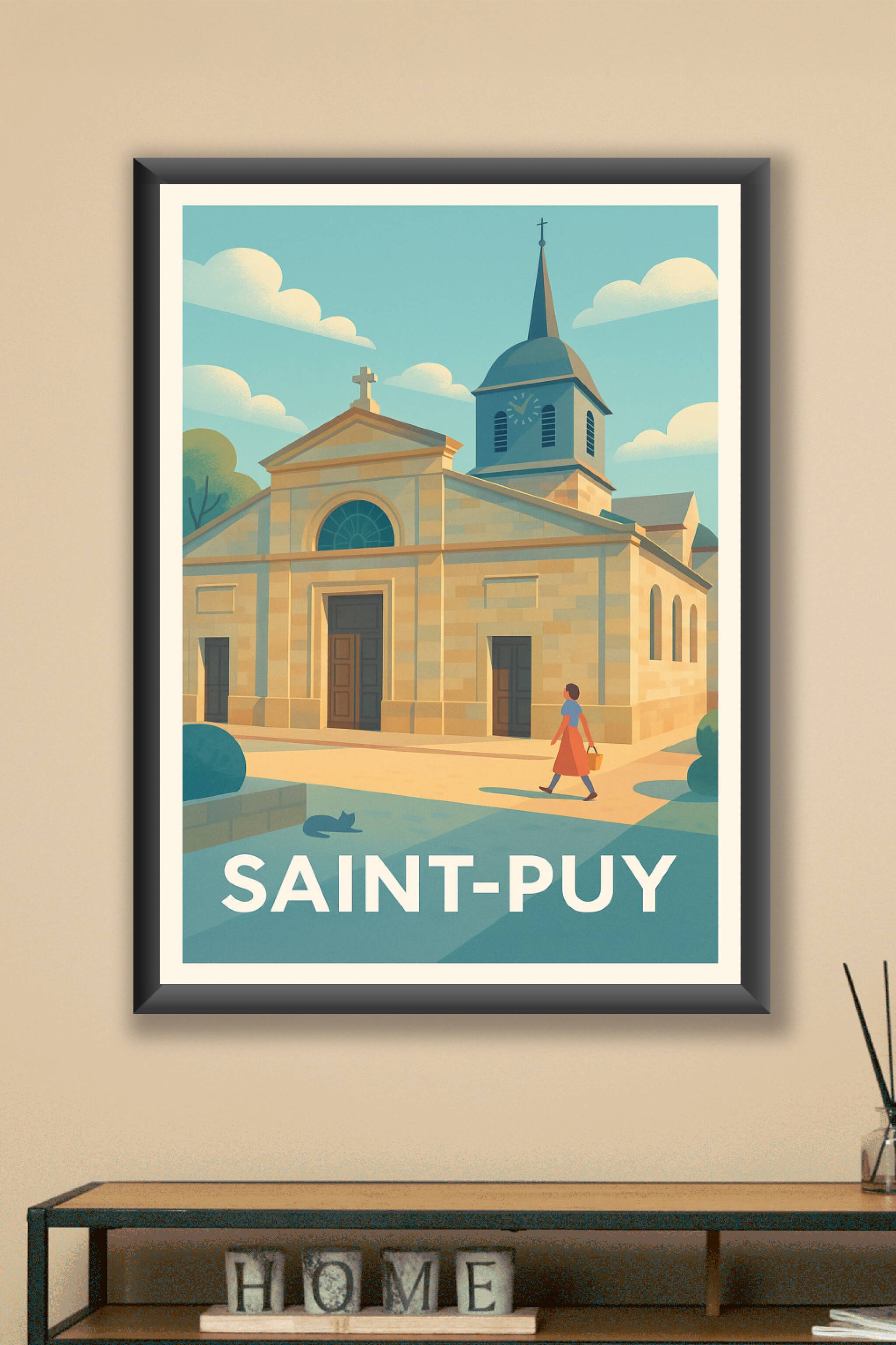 Découvrez l'élégance tranquille de Saint-Puy à travers cette affiche au style vintage, mettant en scène l'architecture emblématique de son église s...