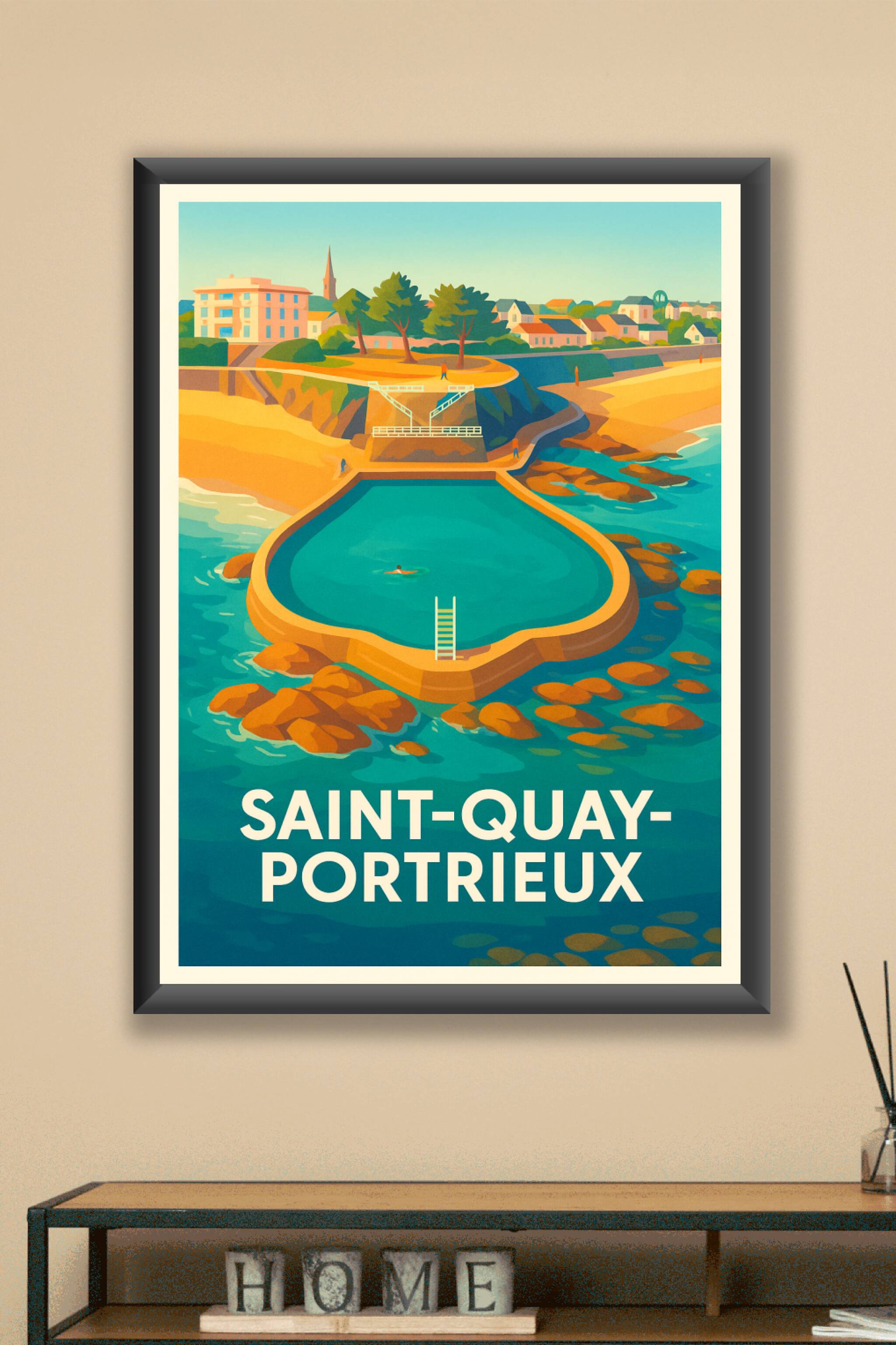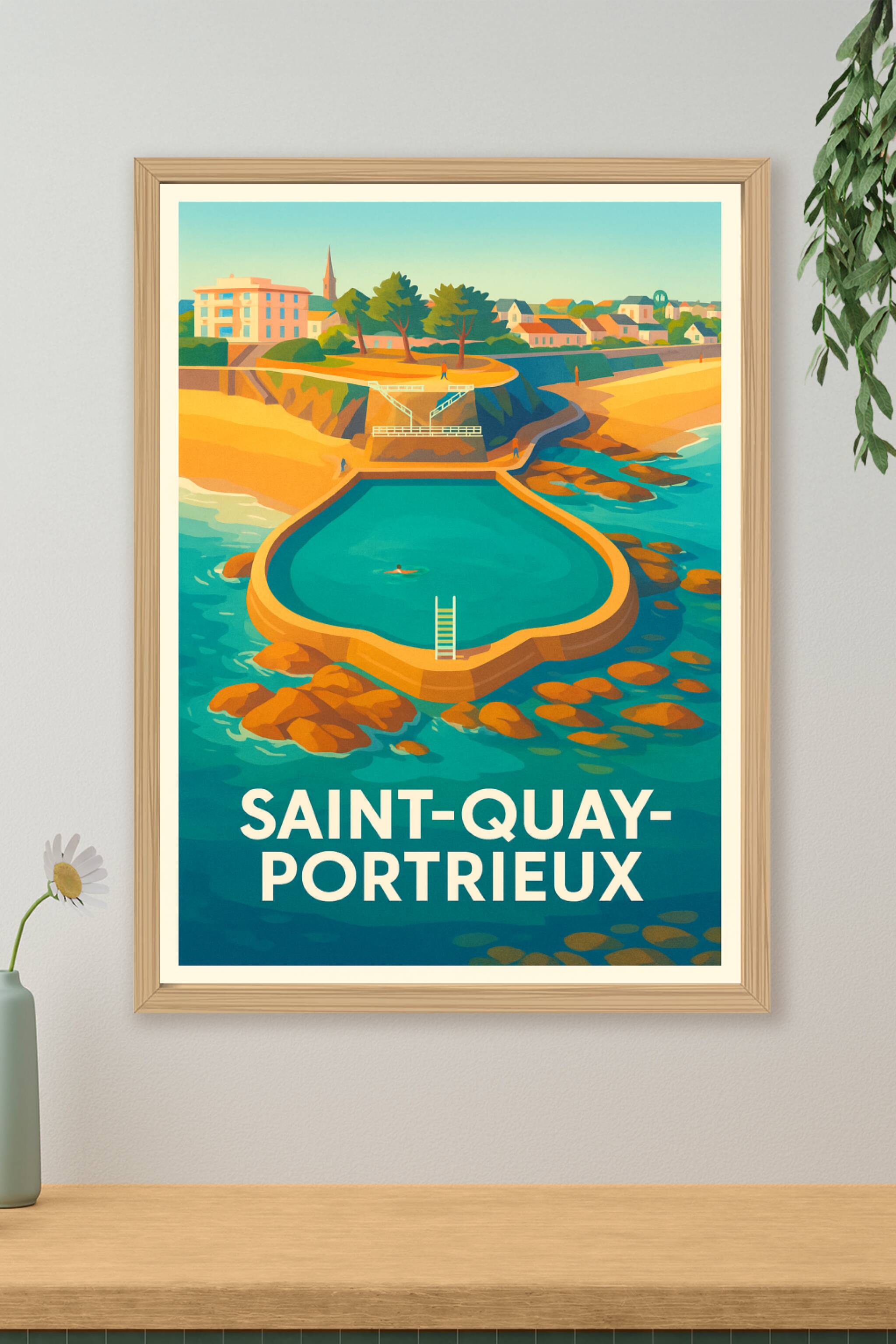 Découvrez l'élégance balnéaire de Saint-Quay-Portrieux avec cette affiche illustrée mettant en lumière sa piscine naturelle emblématique, nichée au...