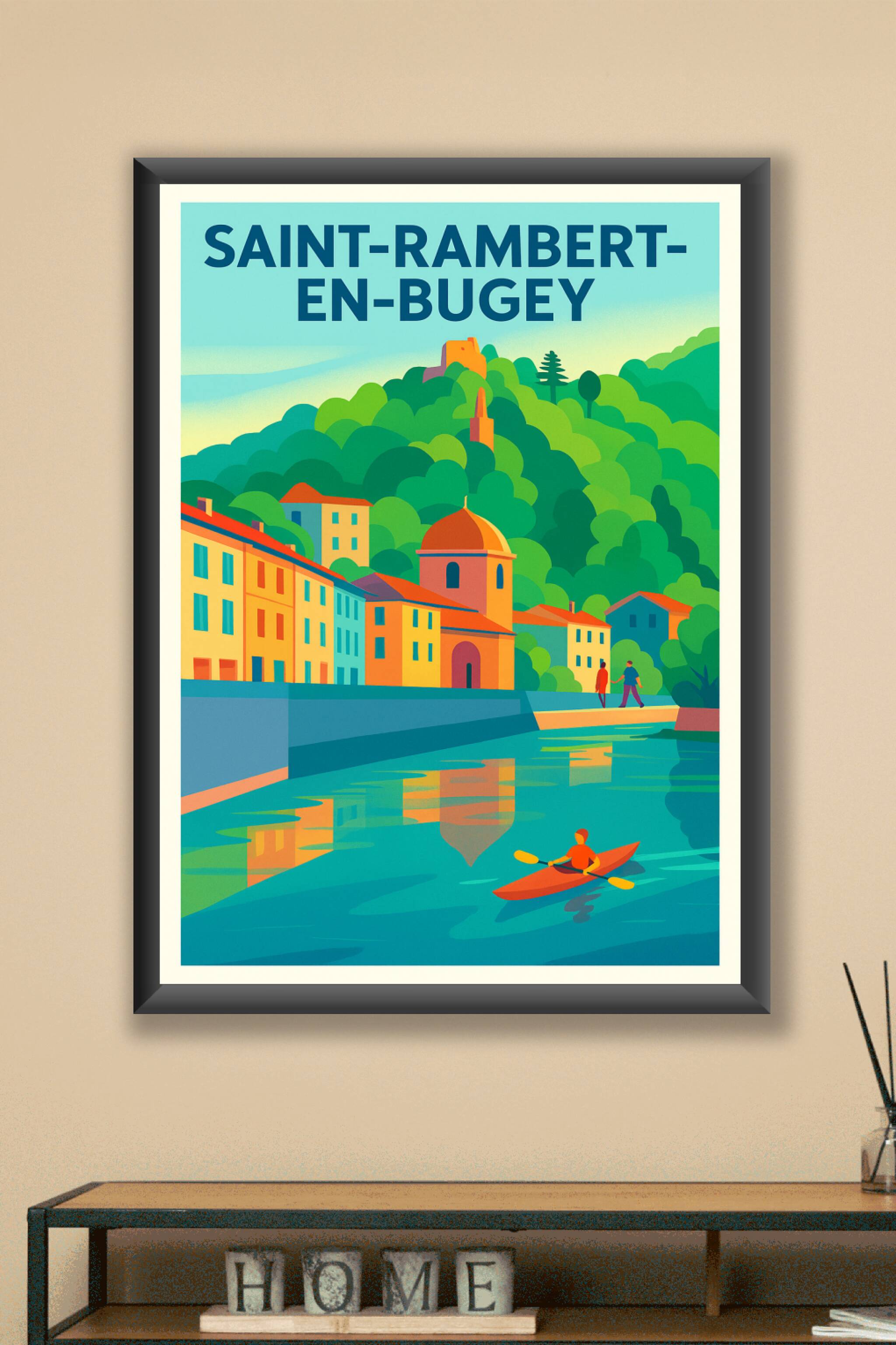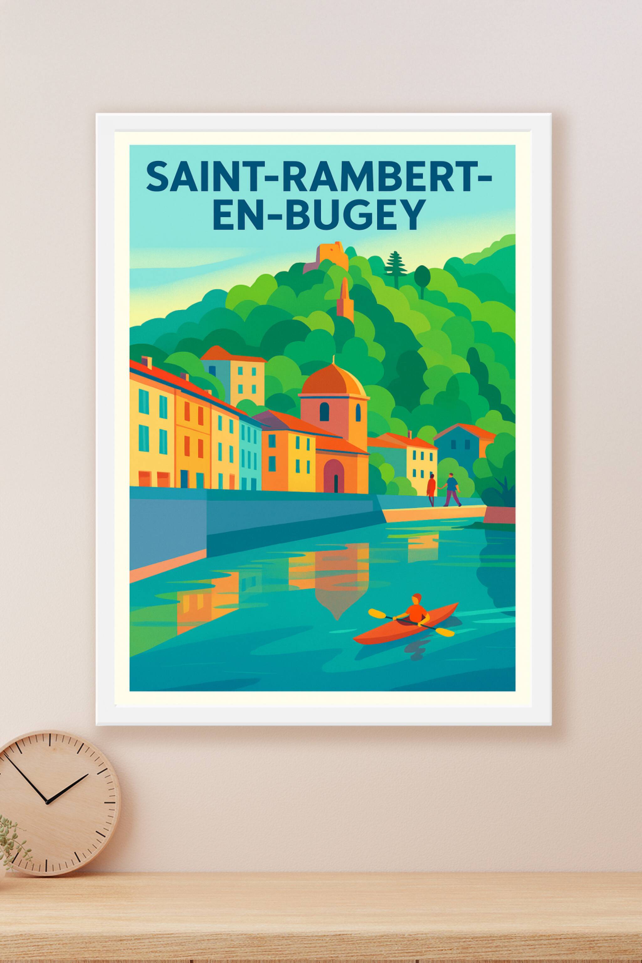 Découvrez le charme paisible de Saint-Rambert-en-Bugey avec cette affiche illustrée aux couleurs vibrantes, mettant en scène ses maisons colorées, ...