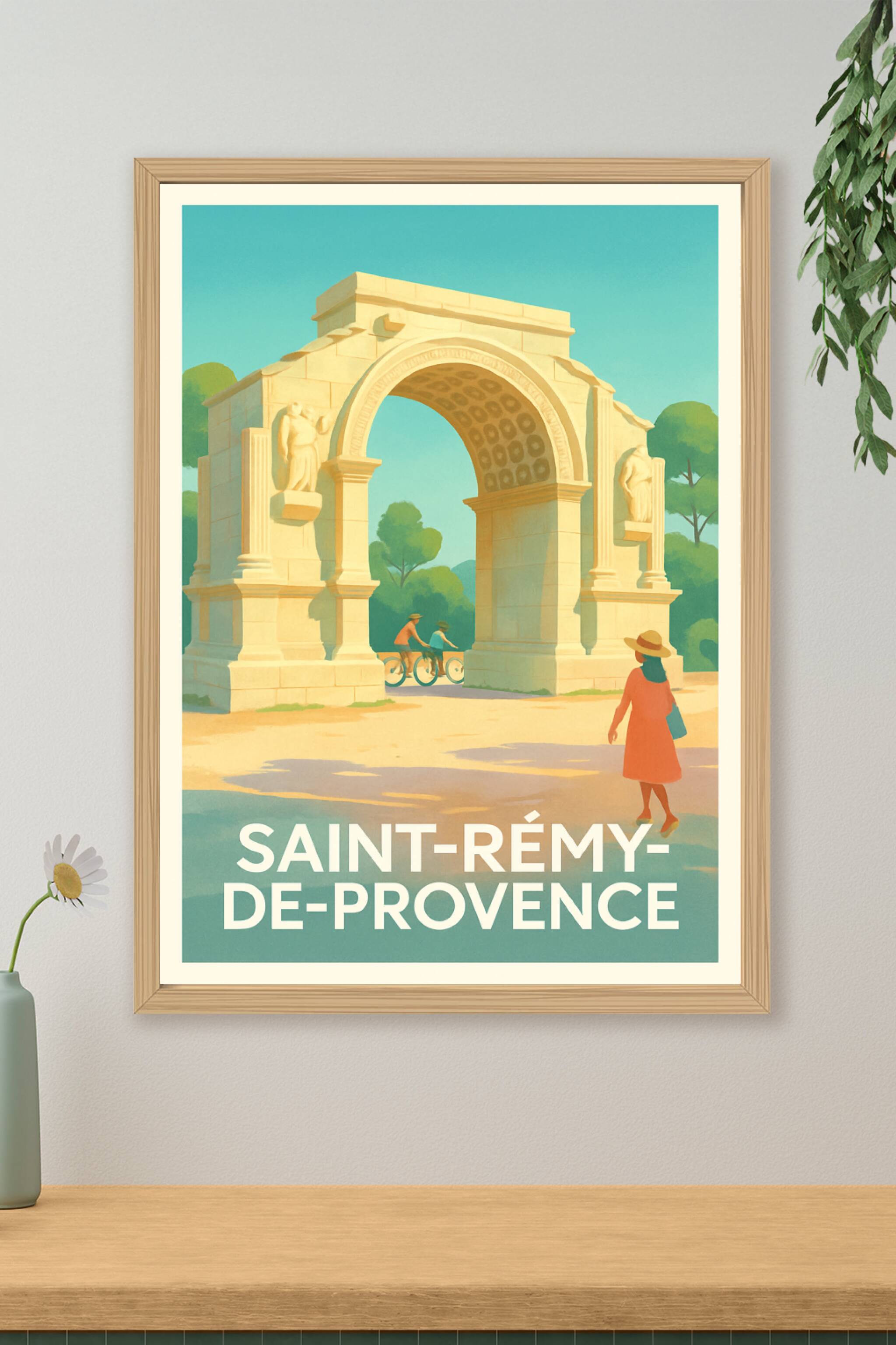Découvrez l'essence charmante de Saint-Rémy-de-Provence avec cette affiche illustrée mettant en scène l'emblématique arc antique dans une lumière d...