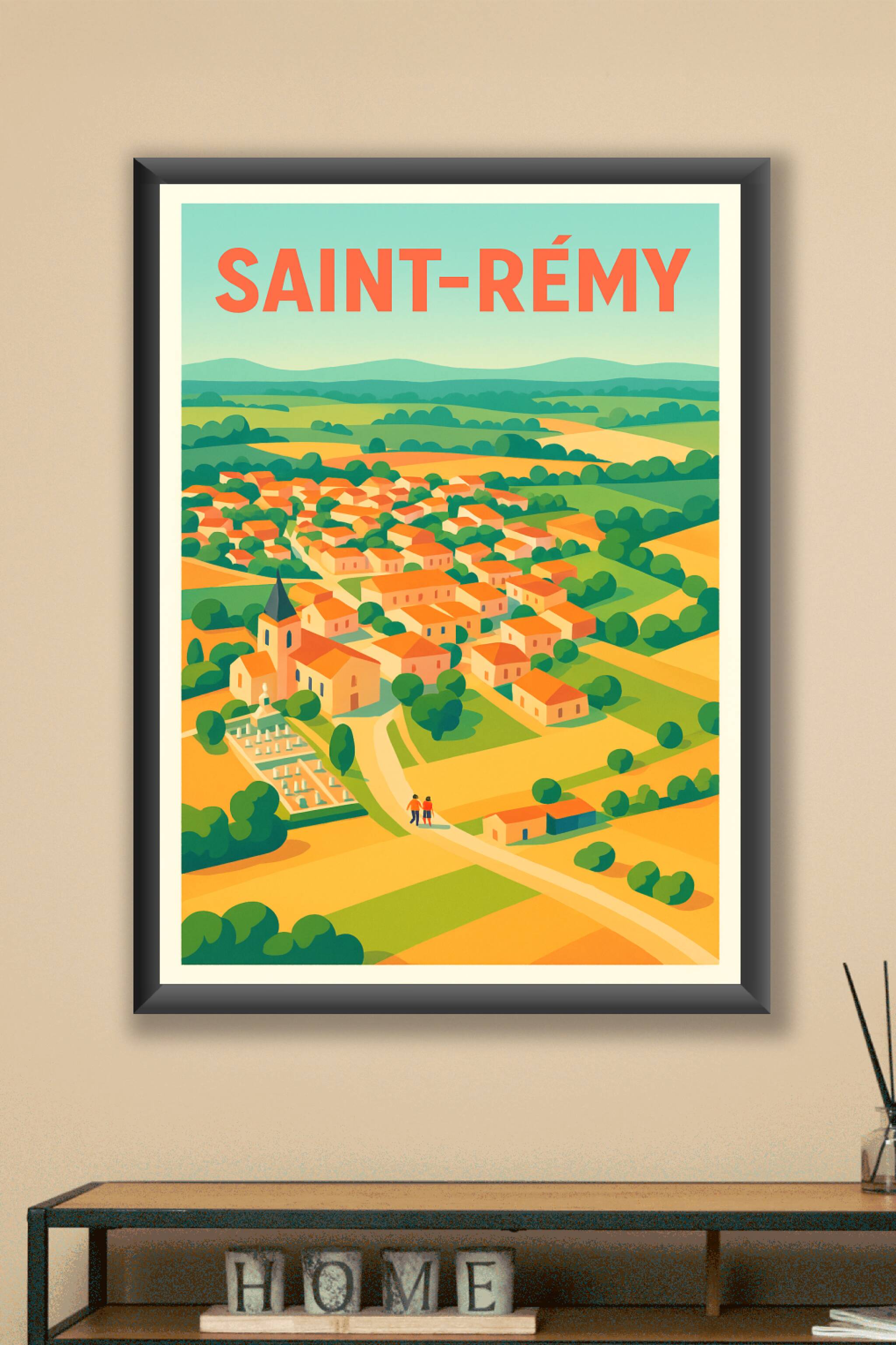 Découvrez la douceur de vivre à Saint-Rémy à travers ce poster illustré aux couleurs chaudes et lumineuses qui mette en valeur le caractère pittore...