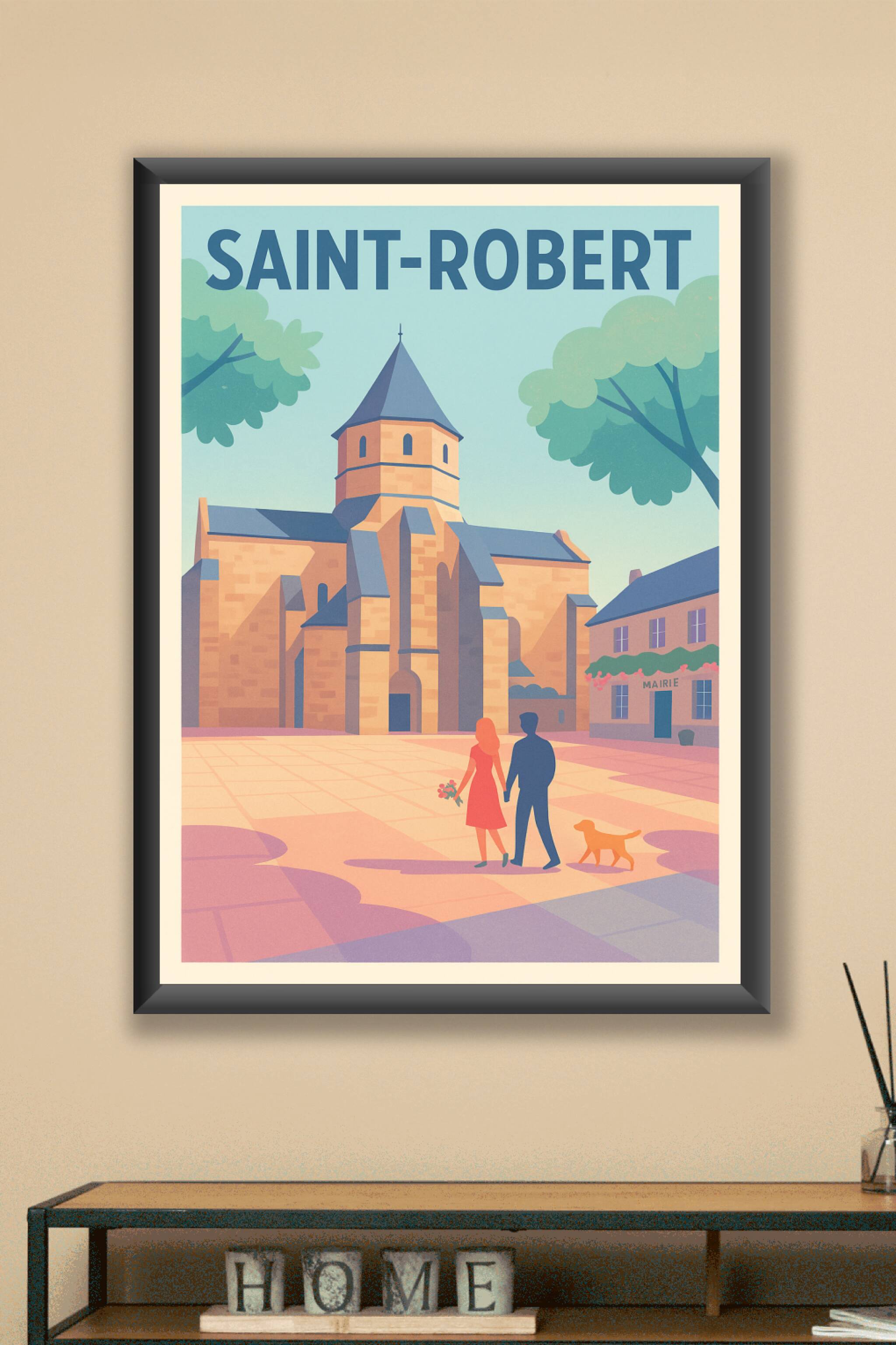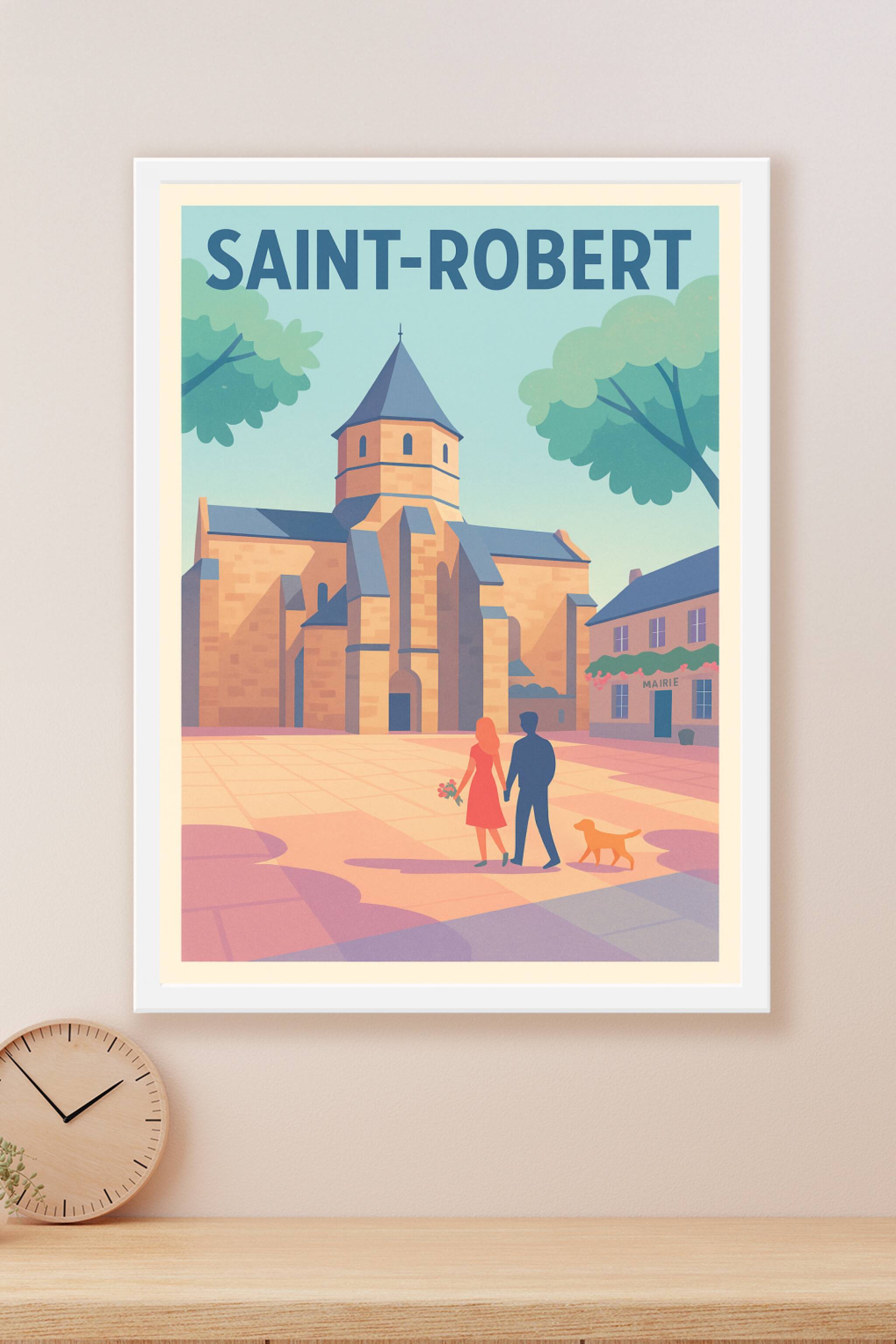 Découvrez l'élégance tranquille de Saint-Robert à travers cette affiche illustrée, mettant en scène son architecture emblématique baignée d'une lum...
