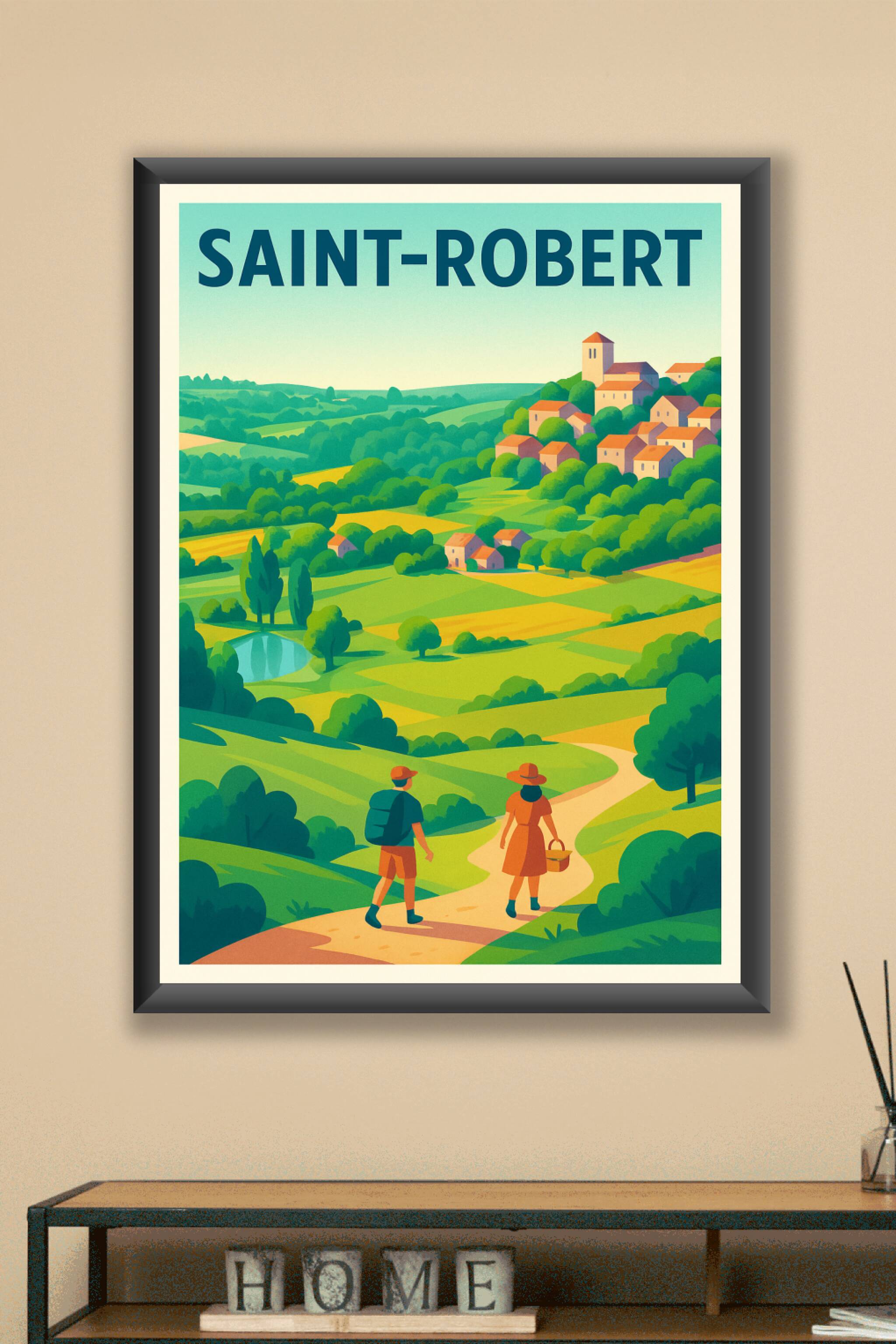Découvrez la sérénité de Saint-Robert avec cette affiche illustrée aux couleurs douces et apaisantes, qui invite à la balade à travers les paysages...