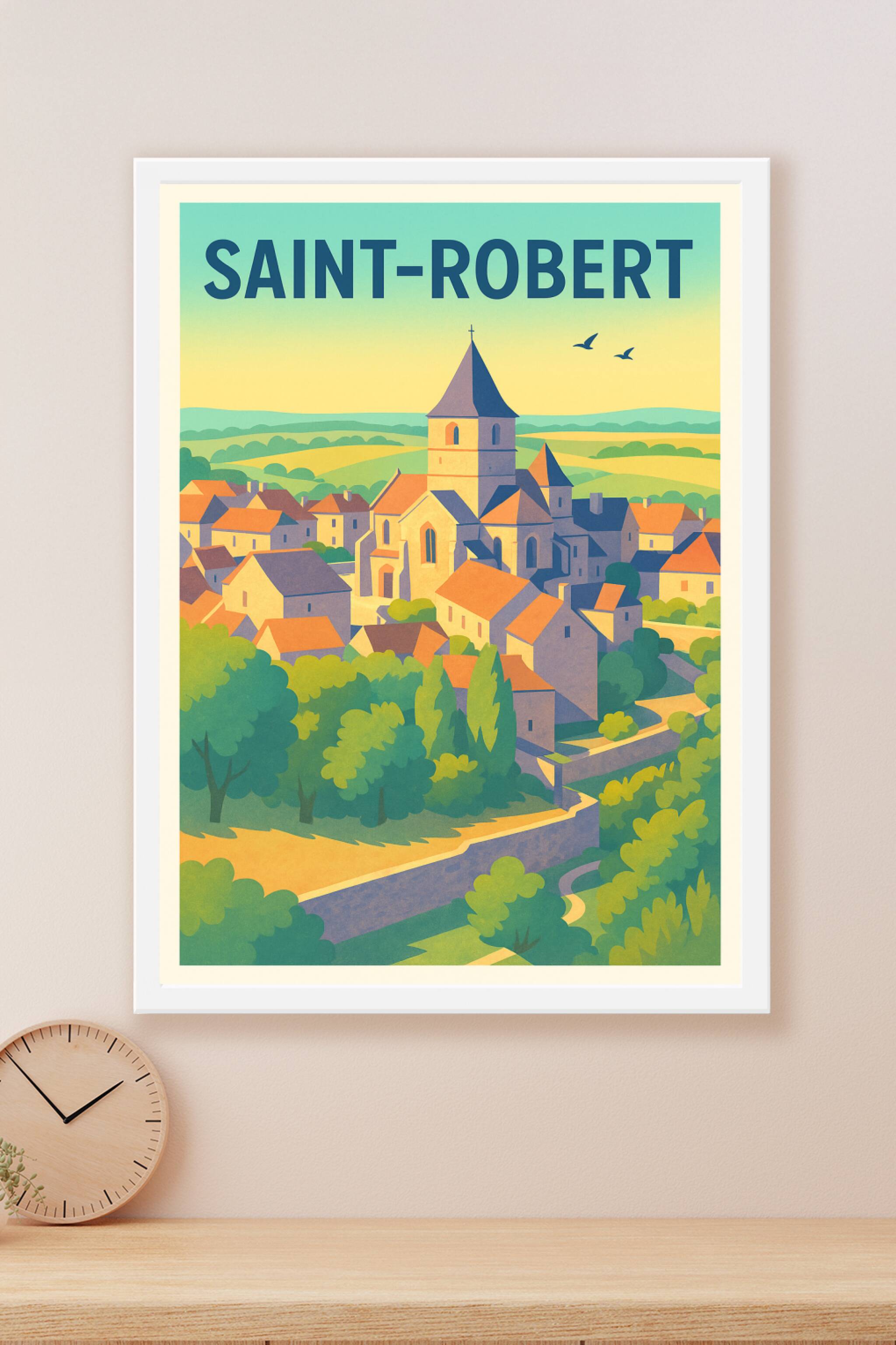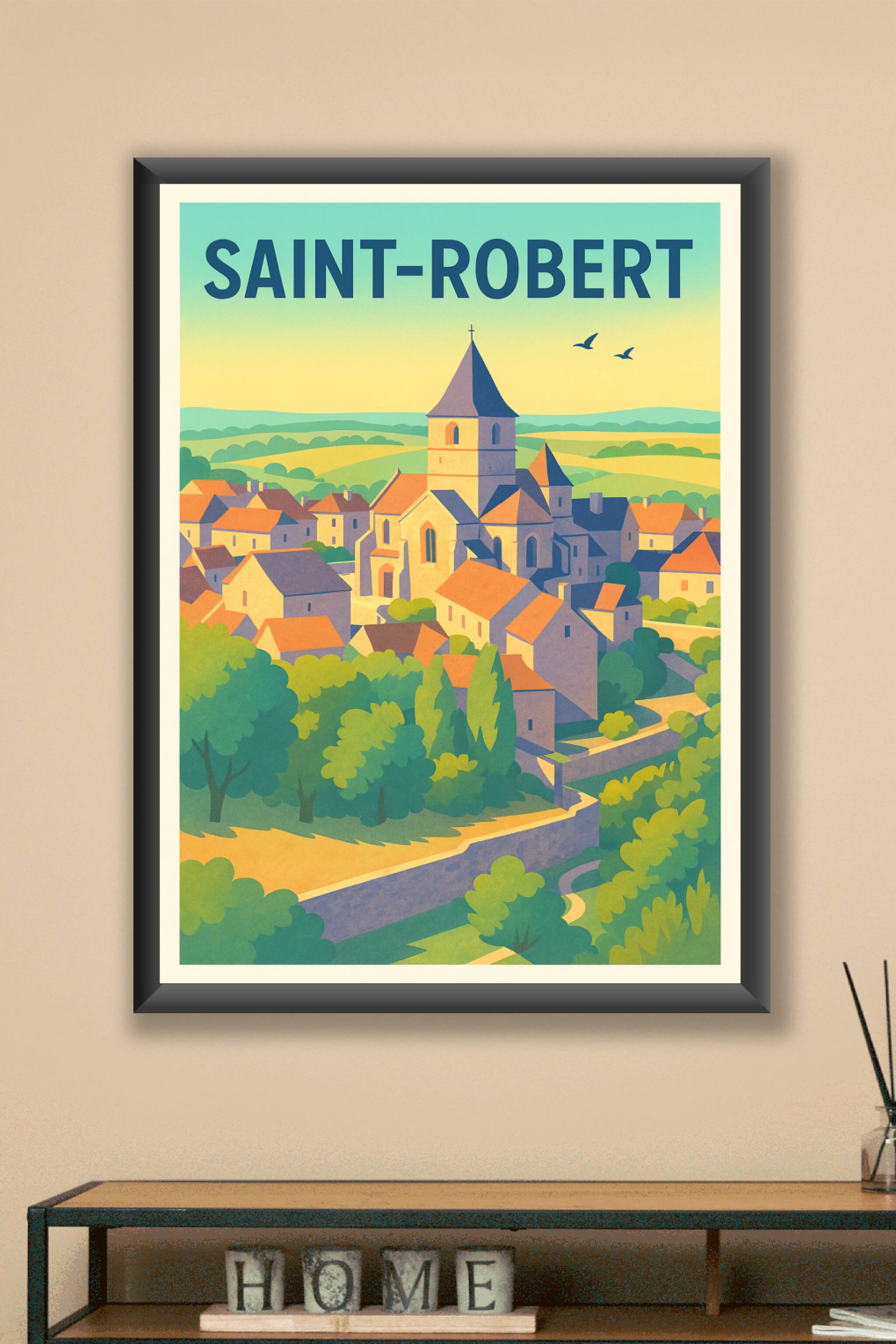 Découvrez le charme authentique de Saint-Robert avec cette affiche illustrée qui met en valeur les toits orangés et l'église emblématique du villag...