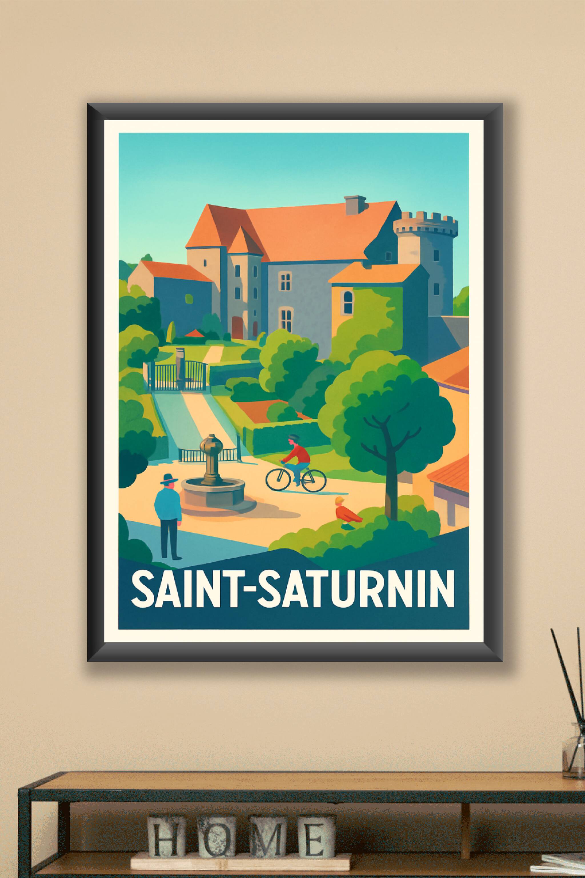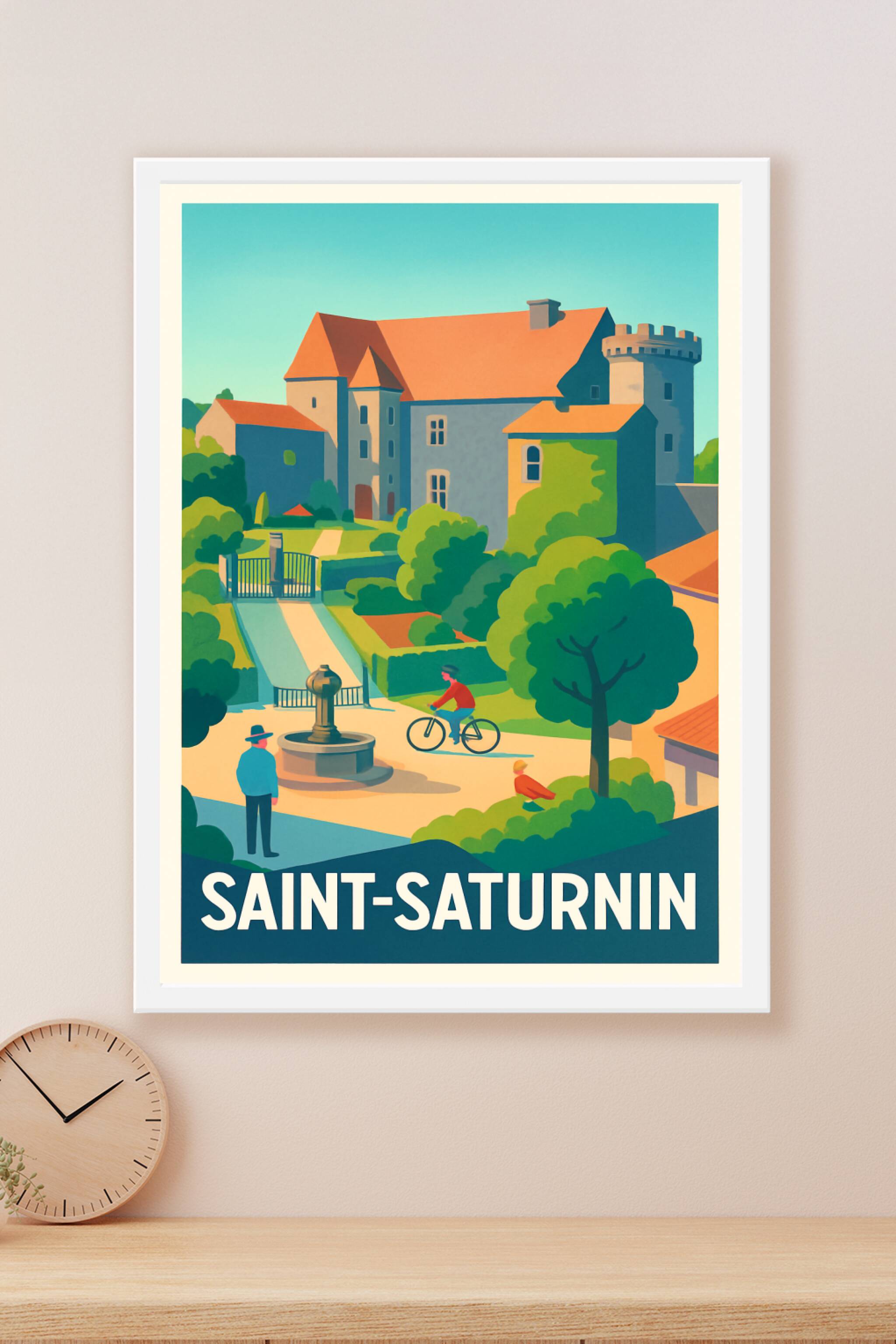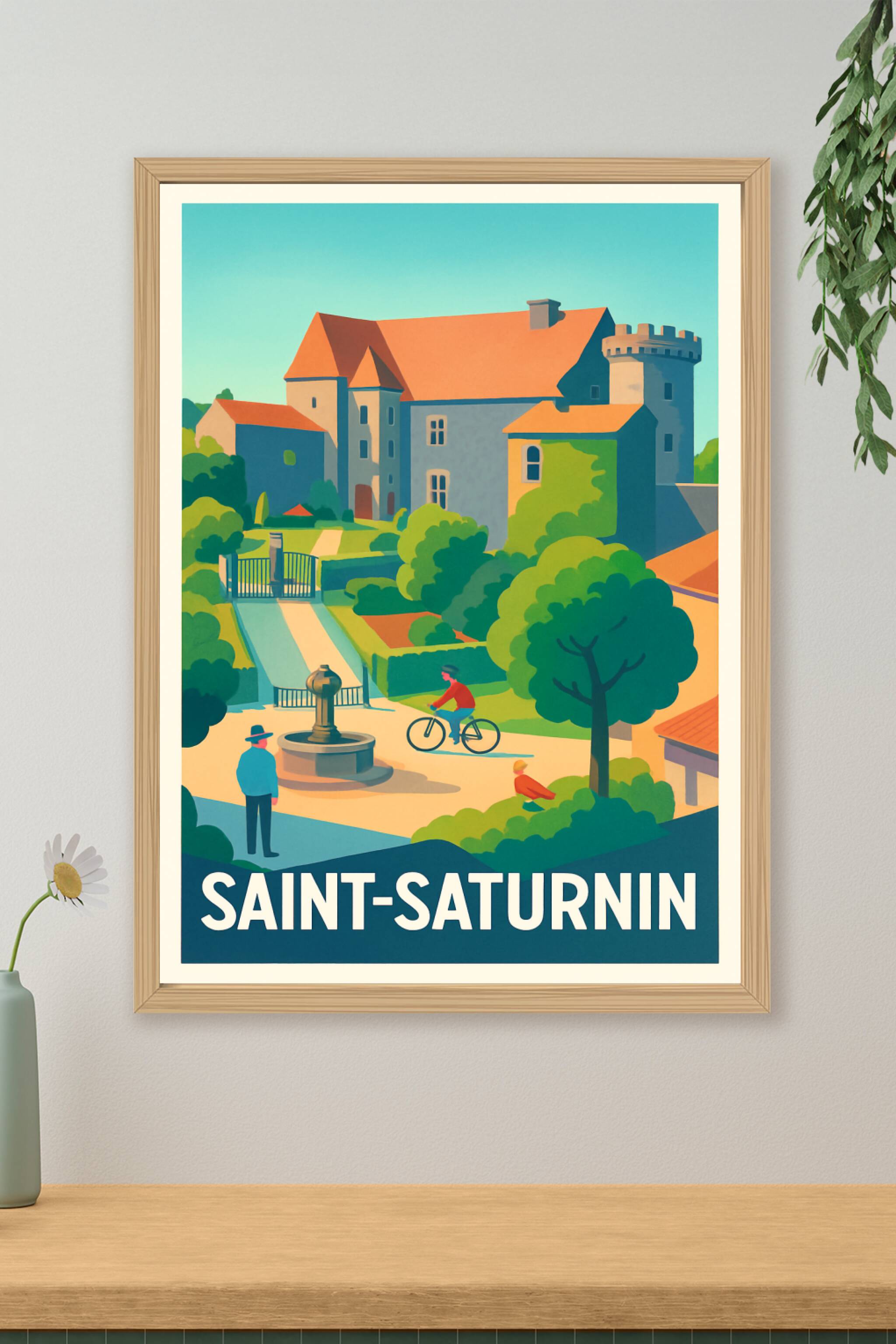 Découvrez l'élégance paisible de Saint-Saturnin avec cette affiche illustrée aux couleurs vibrantes et au style vintage. Ce poster met en scène une vue typique du village, avec son architecture historique et ses espaces verts accueillants, sublimés par une ambiance douce et lumineuse. Imprimée en tirage "Fine Art" sur papier 305g coton, cette affiche garantit une qualité d'impression exceptionnelle, des couleurs profondes et un rendu durable. Disponible en formats A1 à A4, avec ou sans cadre, elle ajoutera une touche authentique et raffinée à votre décoration intérieure ou fera un cadeau parfait pour les passionnés de patrimoine et de villages pittoresques.