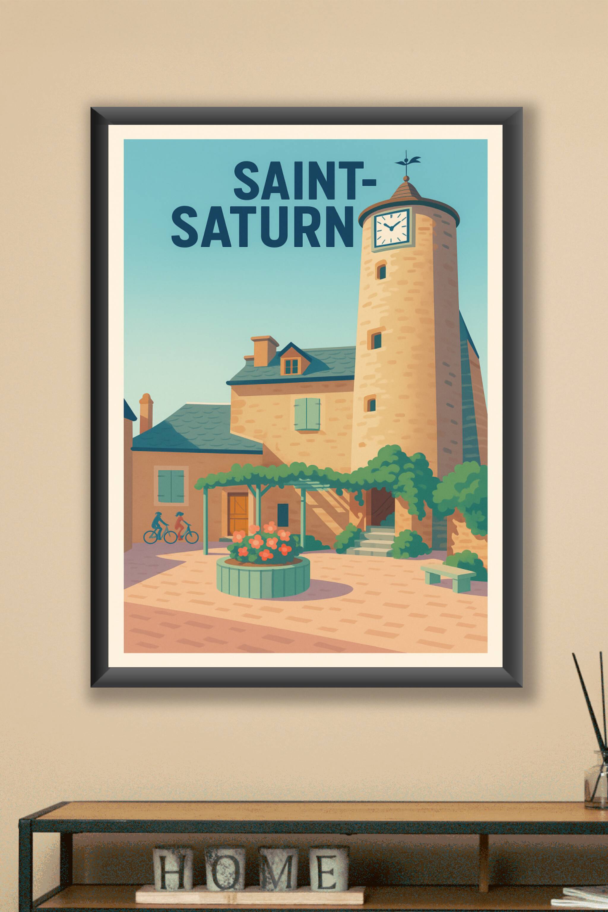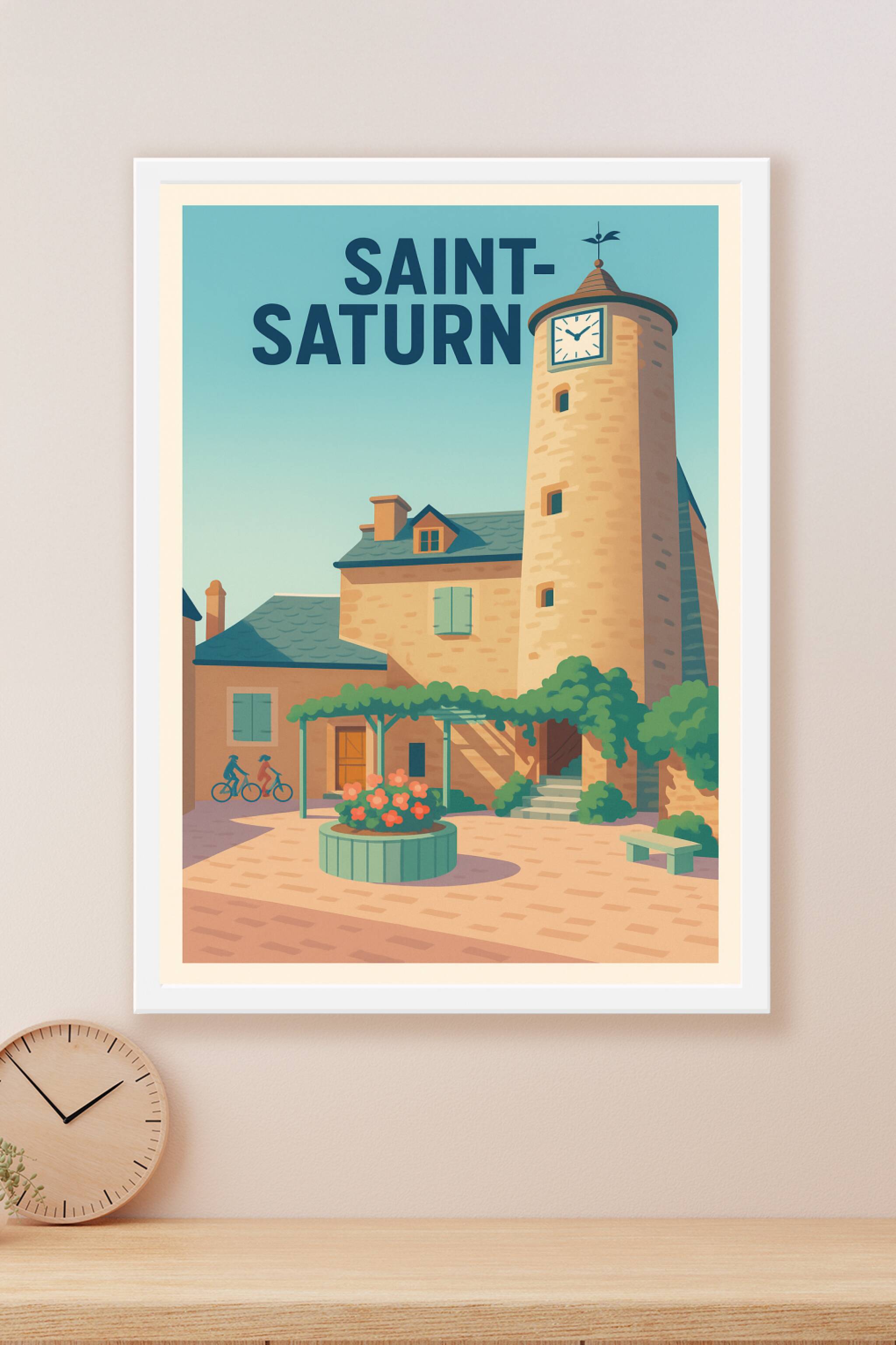 Découvrez le charme intemporel de Saint-Saturnin avec cette affiche illustrée représentant la quiétude d'un village authentique, entre la tour horl...